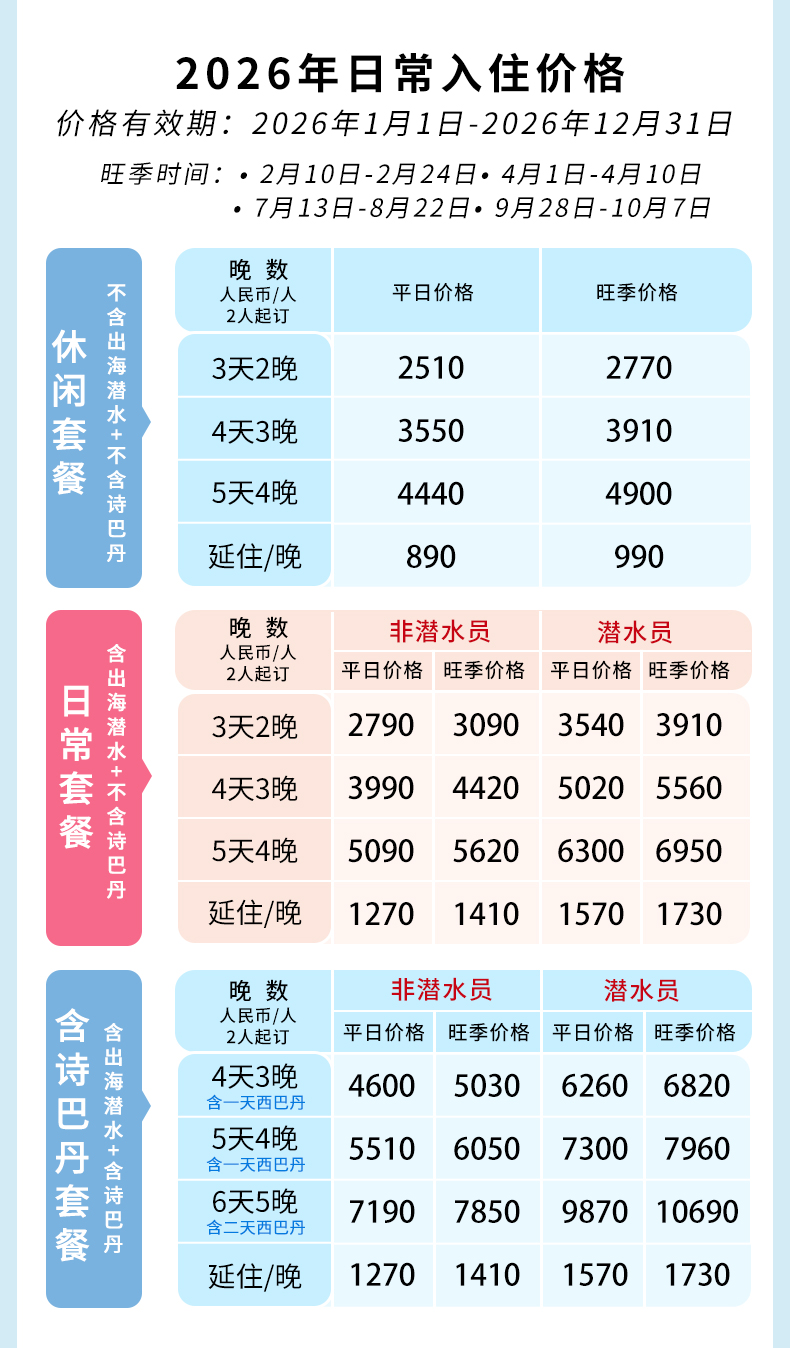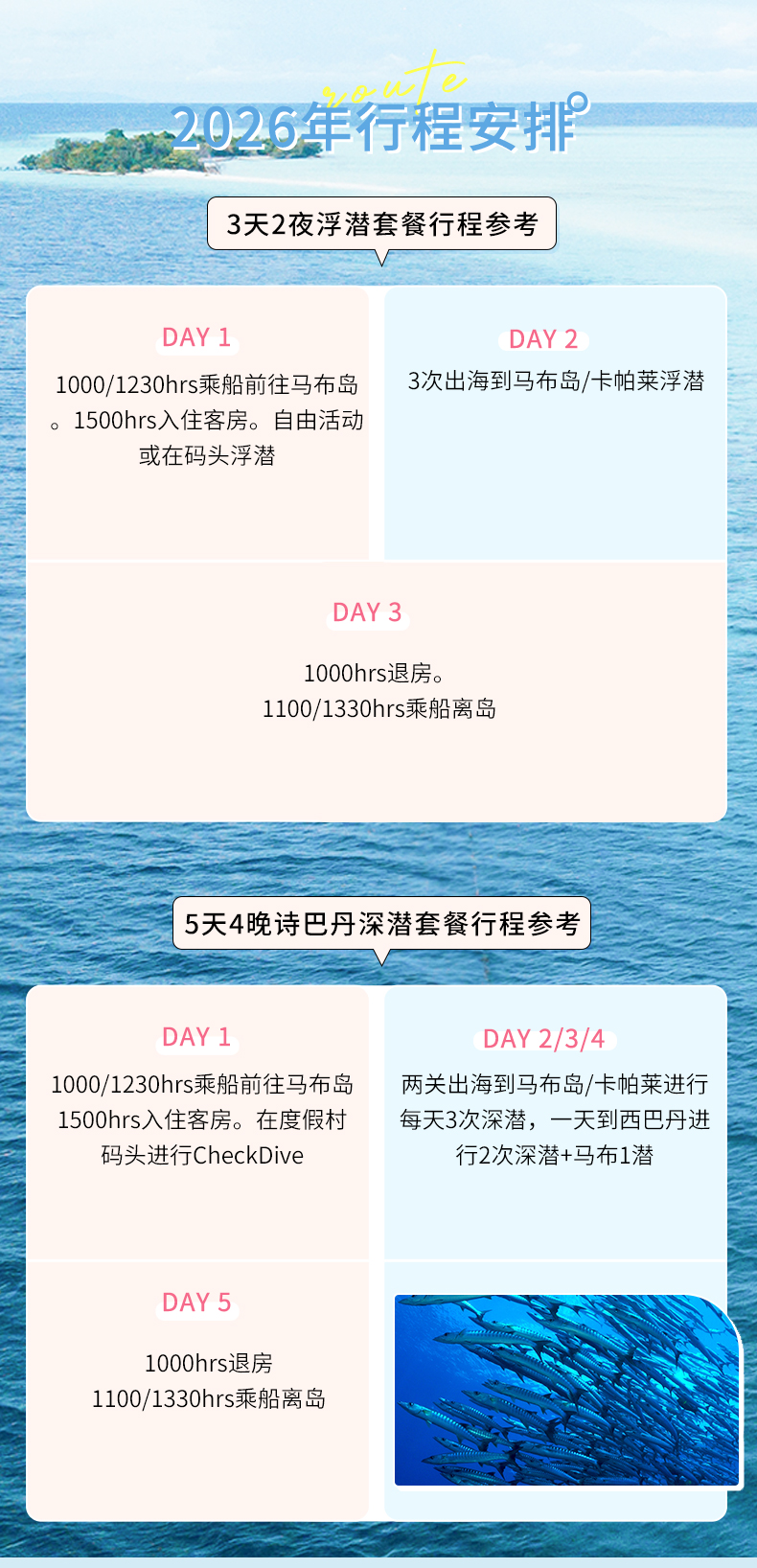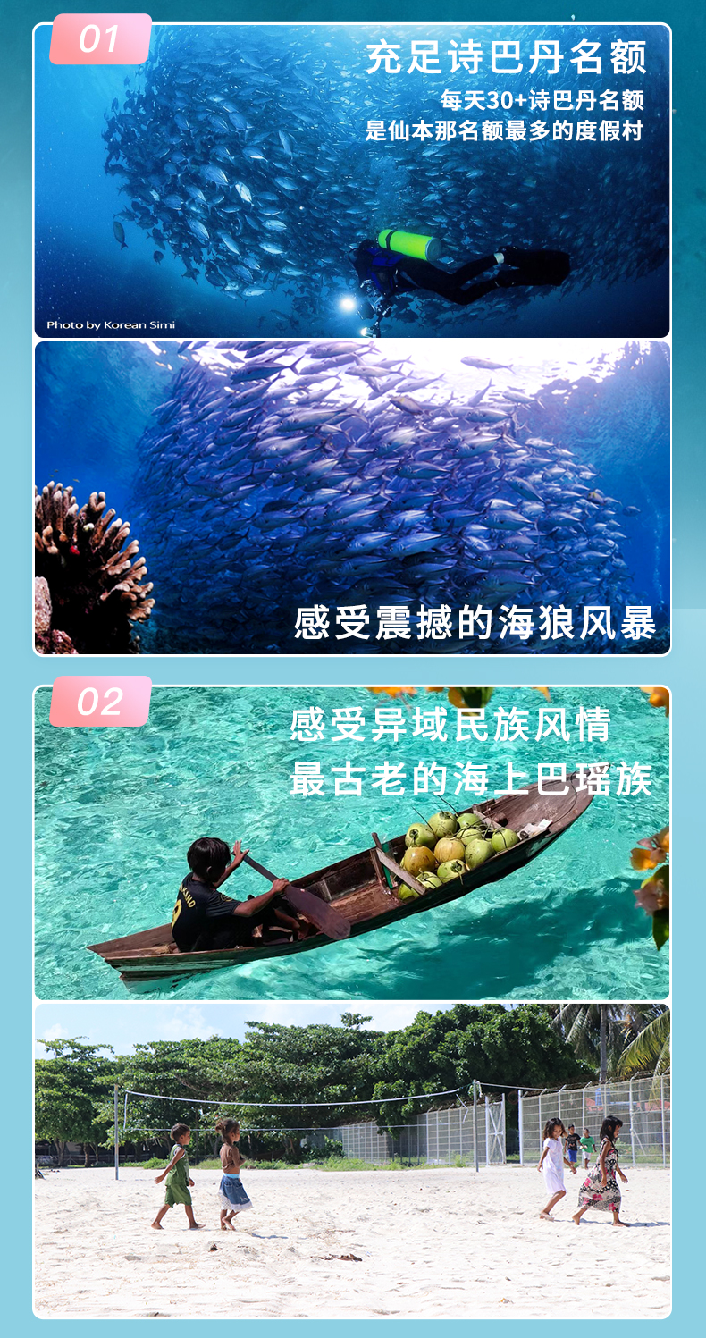 2. 特殊人群的说明:基于仙本那3个特点:(1)由于海岛需要乘快艇前往,快艇颠簸;(2)仙本那医疗设施落后,岛上没有任何医疗设施,镇上的也只有小诊所没有大医院;(3)仙本那施行宵禁晚上18点至早上6点,海上禁止任何船只出行。因此仙本那不适宜65岁以上老人、孕妇、骨质疏松、高血压、贫血、糖尿病、慢性肺病、严重心脑血管疾病、气喘病、过敏体质等及其他不适宜人员前往。一切以安全为先,如执意出海,发生意外后果自负。任何不适合搭乘快艇的人员暂不接待;如执意报名,请提供3个月内的体检证明且签署风险告知书;