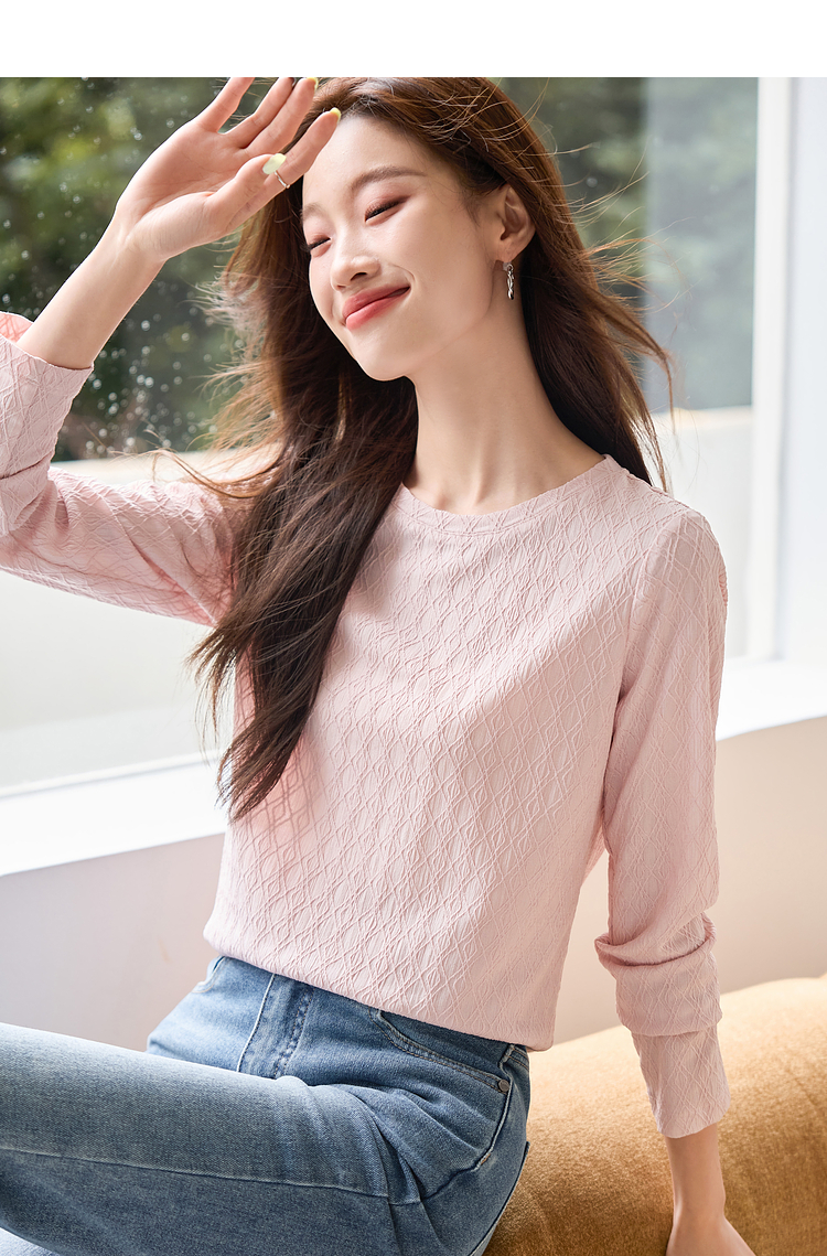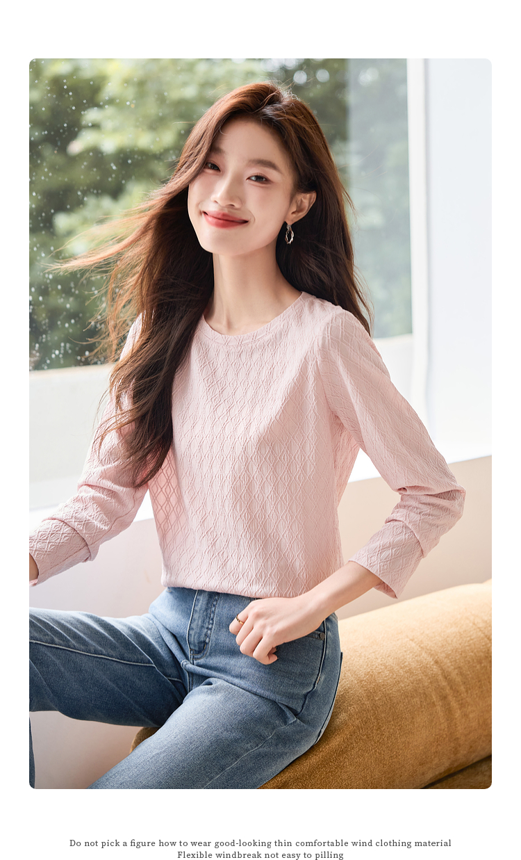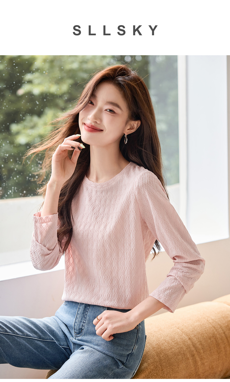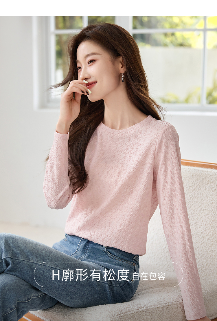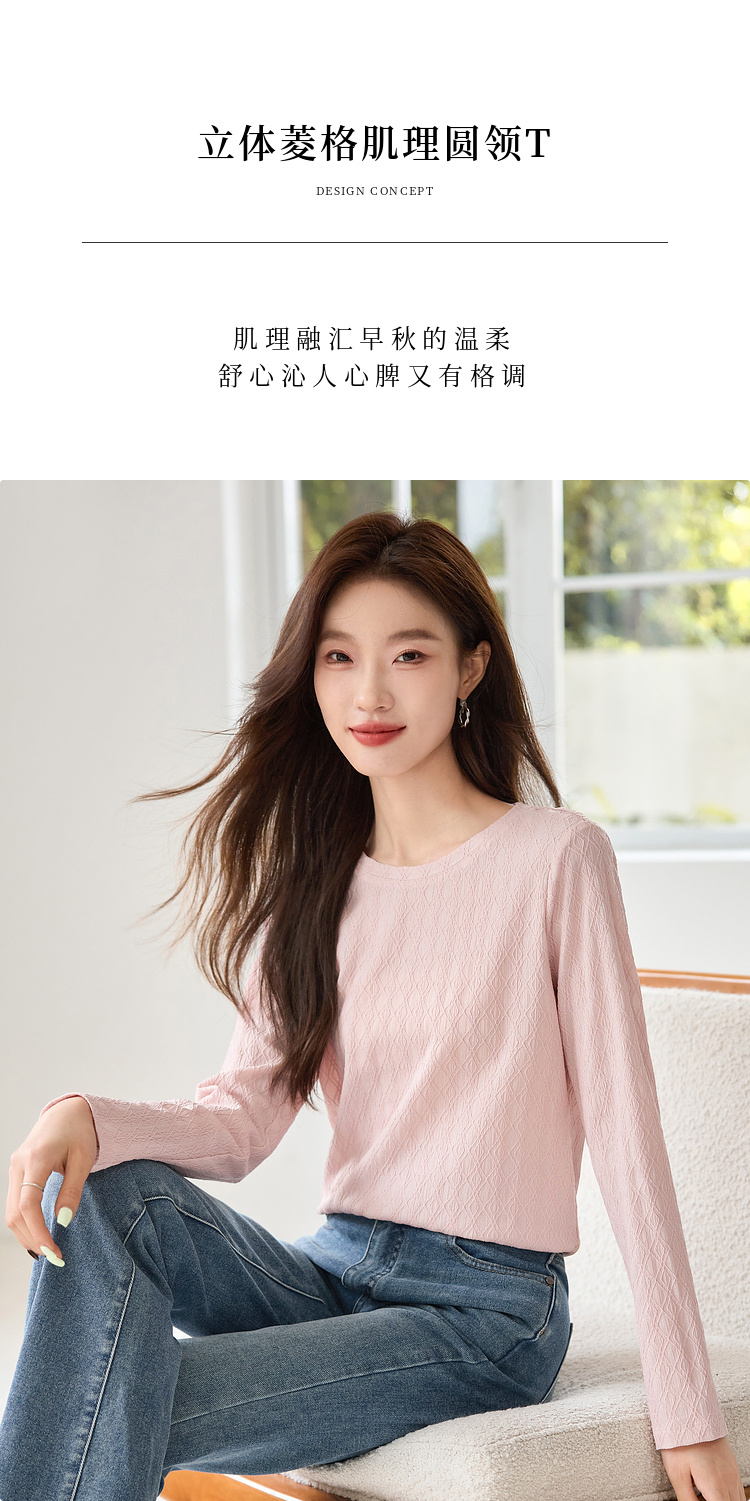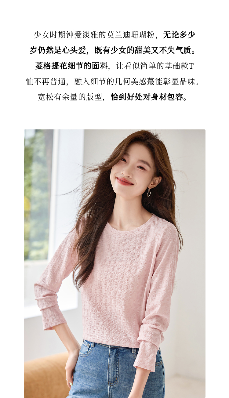 【周四狂欢价】熙世界肌理感菱格圆领T恤女长袖2025秋季新款宽松休闲体恤上衣