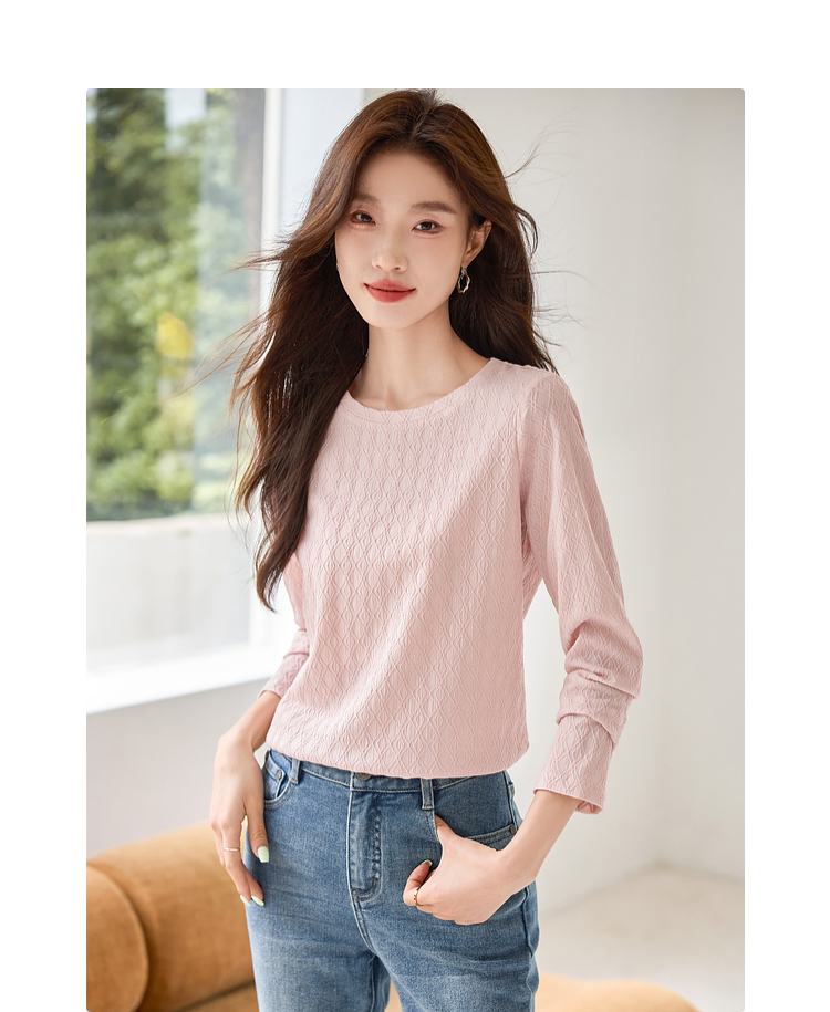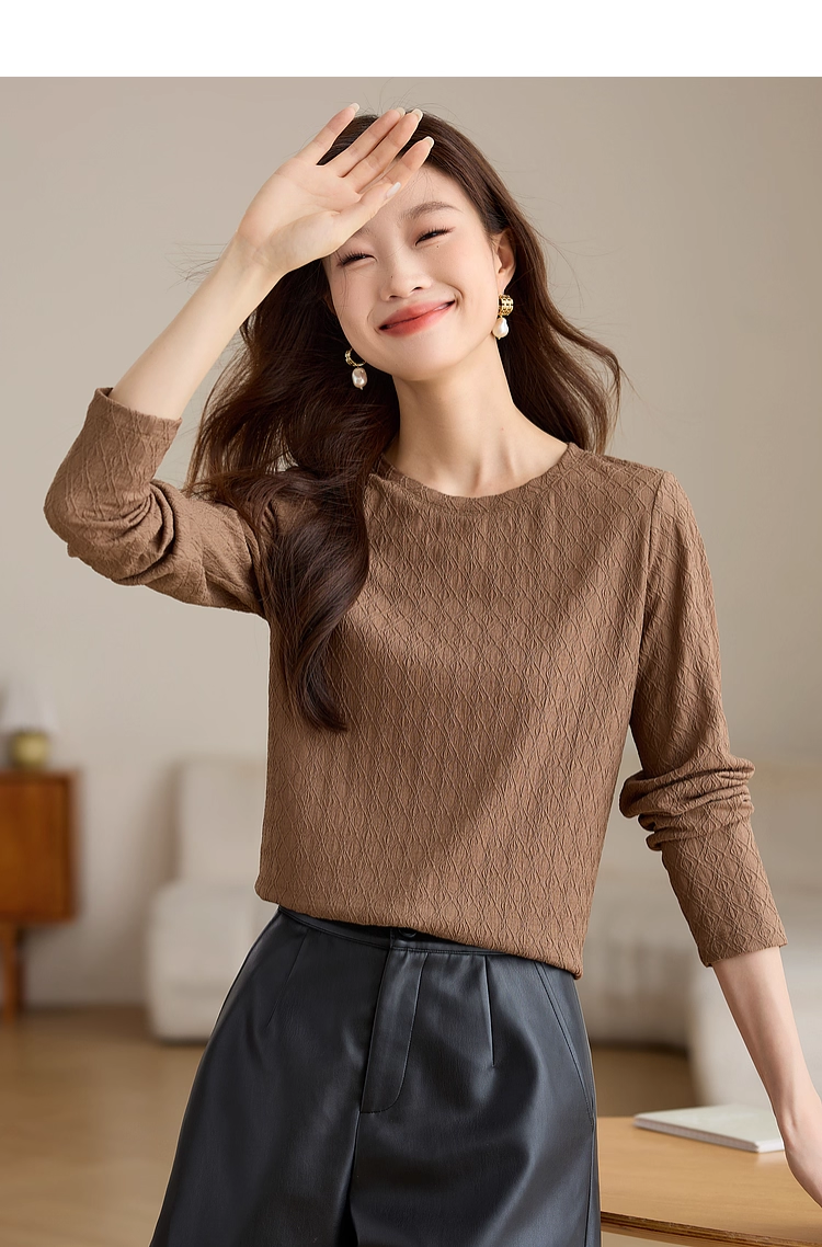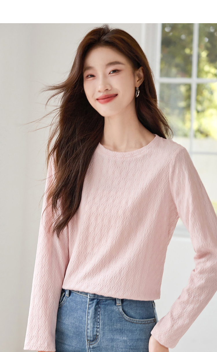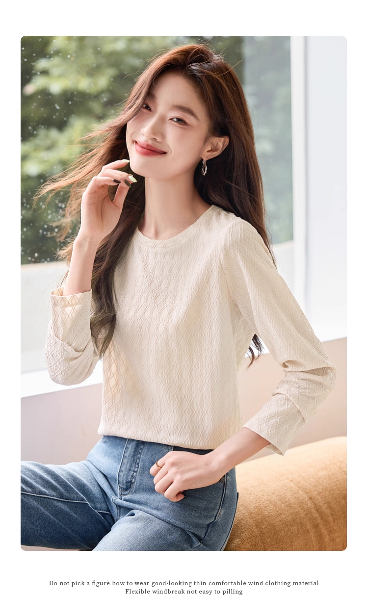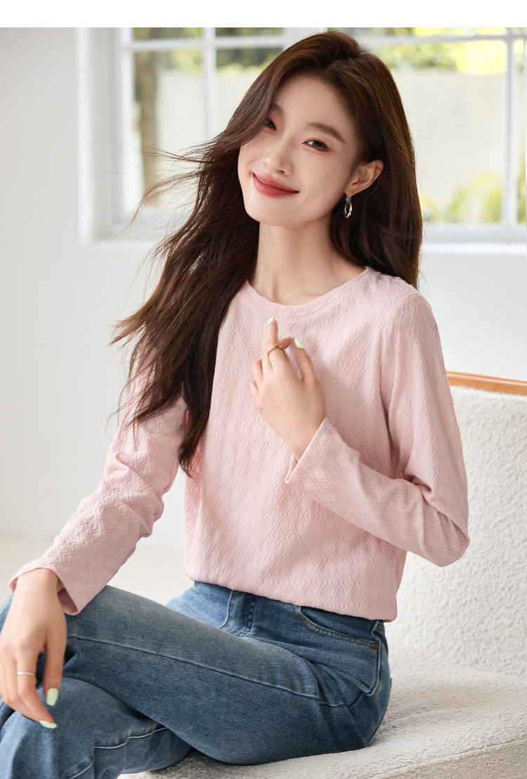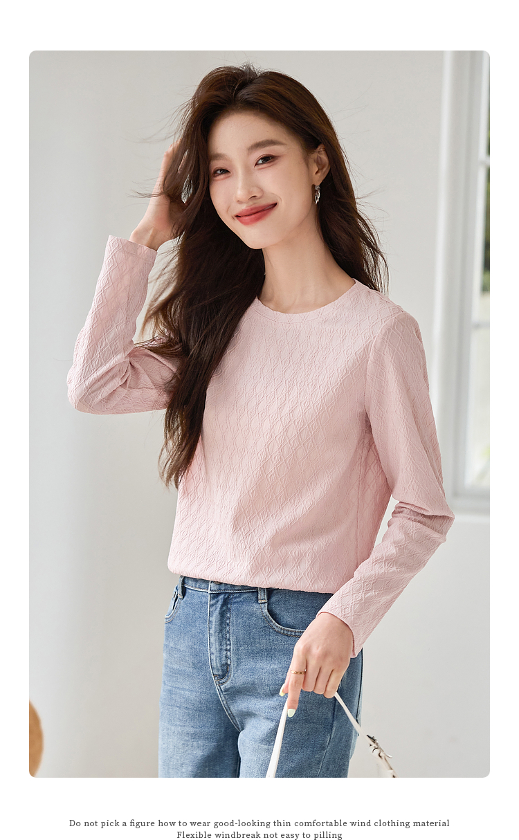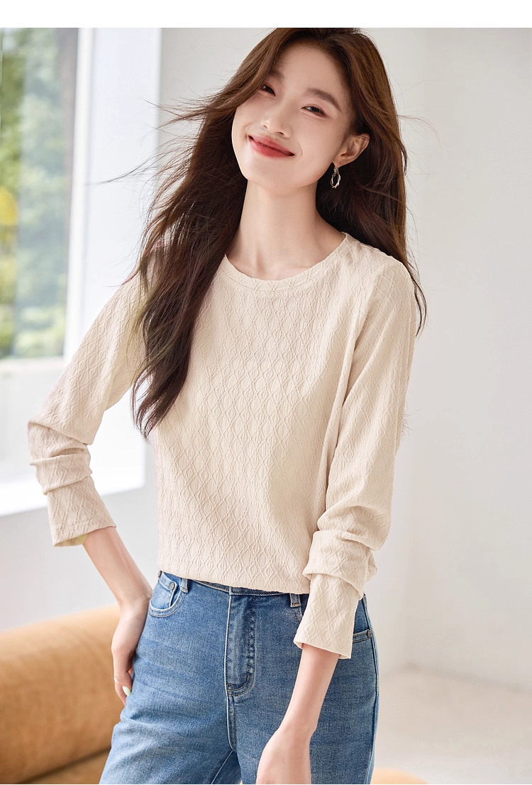 【周四狂欢价】熙世界肌理感菱格圆领T恤女长袖2025秋季新款宽松休闲体恤上衣
