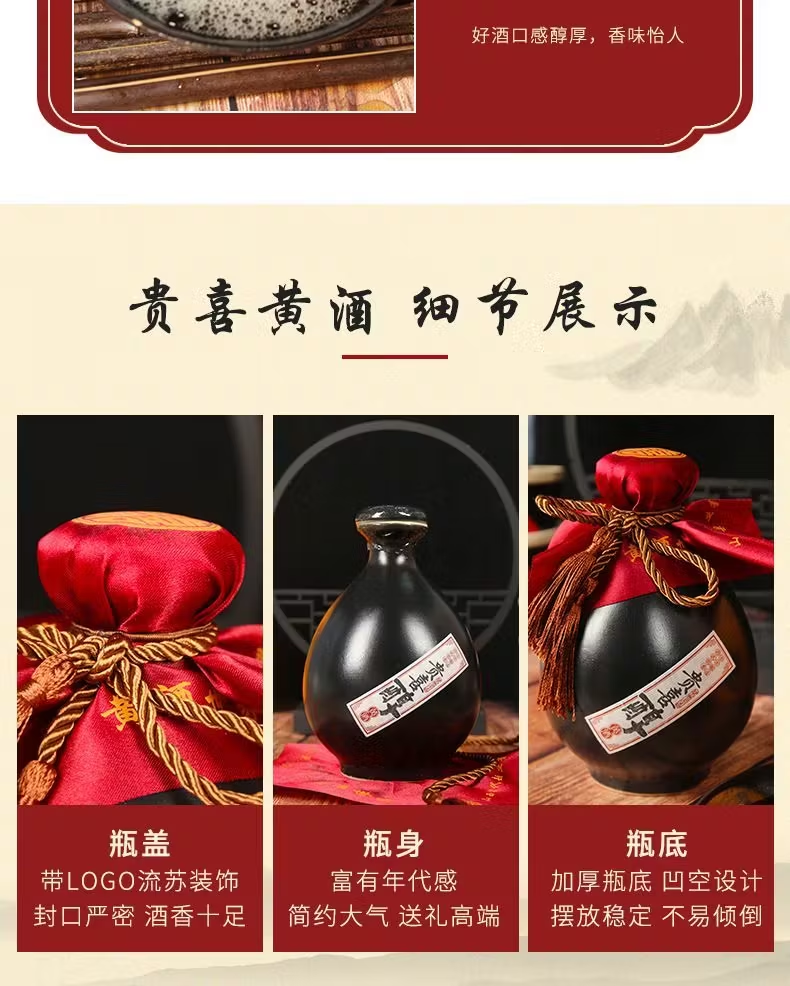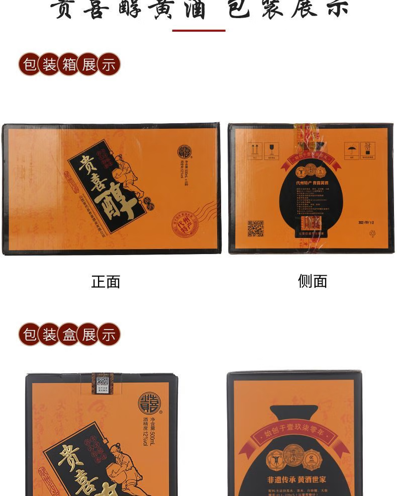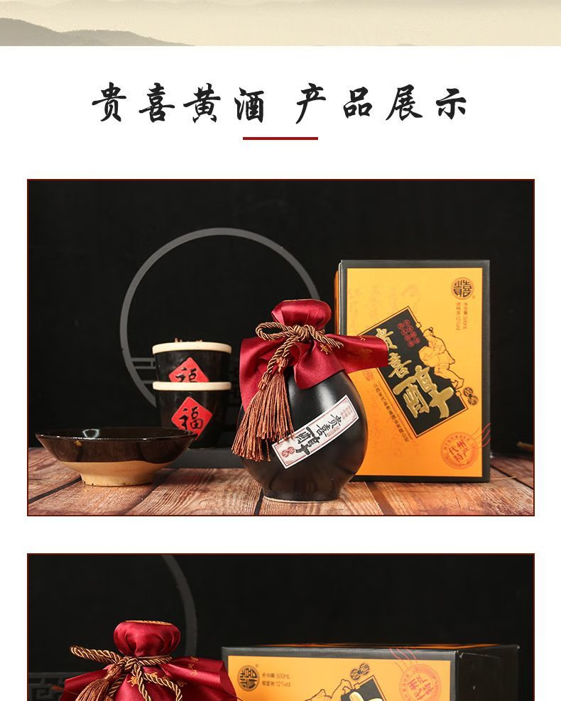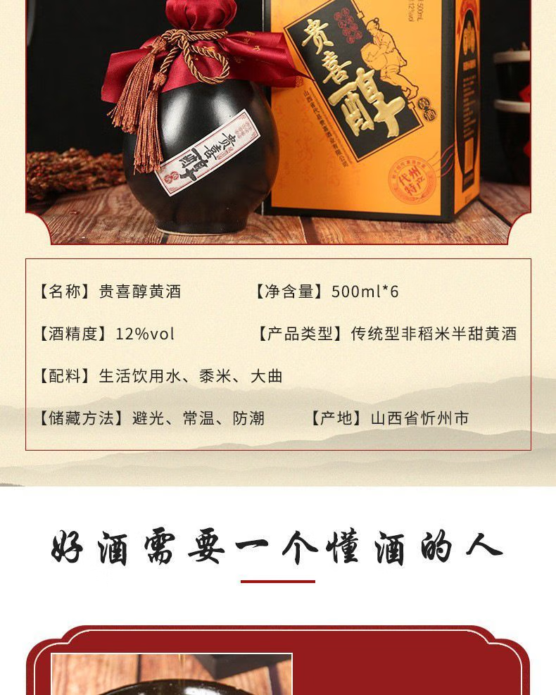 贵喜黄酒 贵喜醇半甜型 代县黄酒15度无添加小黑坛礼盒装 500mL *6盒 整箱装
