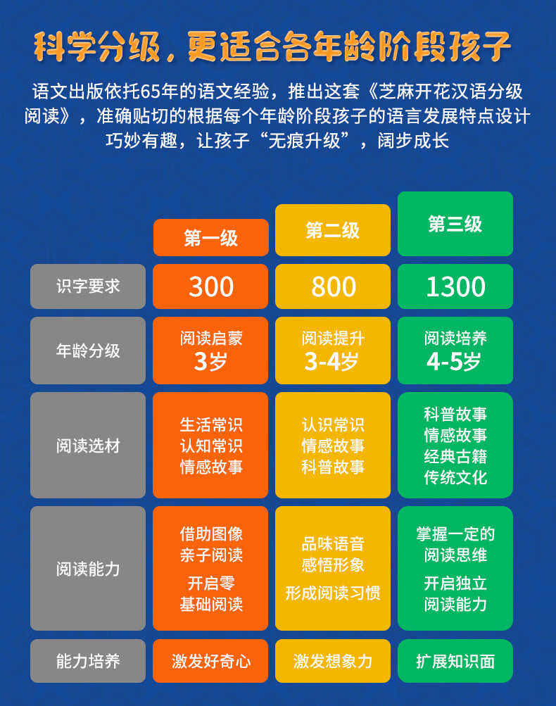 3.一共3个级别,专为阅读敏感期(3~6岁)、刚开始识字的孩子编写,紧扣新版小学语文,让孩子们实现自主阅读,轻松实现幼小衔接!