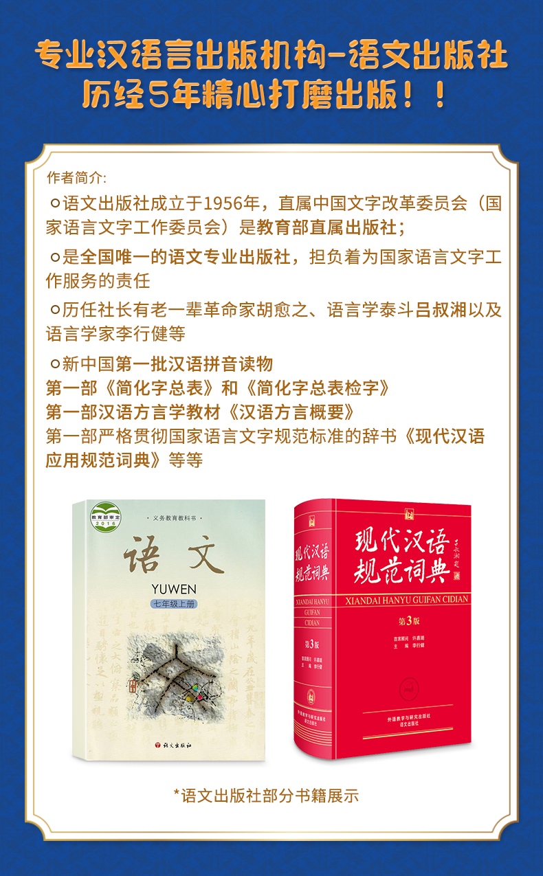 语文出版社成立于1956年,是全国唯一的语言文字专业出版机构,老一辈革命家胡愈之、语言学泰斗吕叔湘以及语言学家李行健等都曾担任过社长。1980年由文字改革出版社更名为语文出版社,2010年成为中国教育出版传媒集团成员单位。