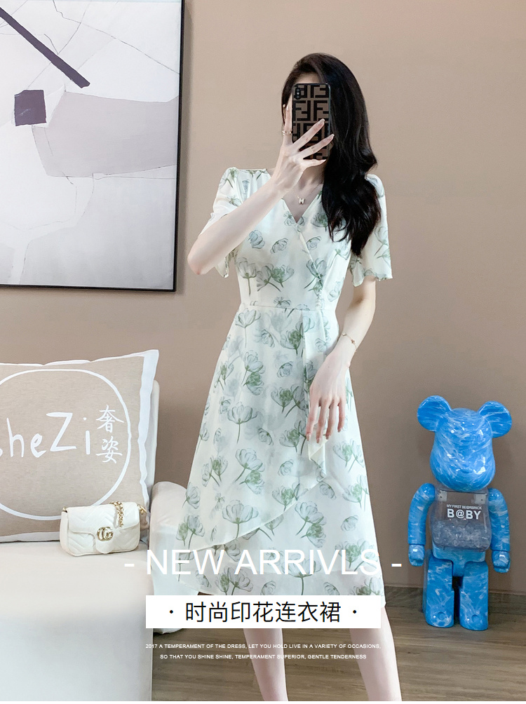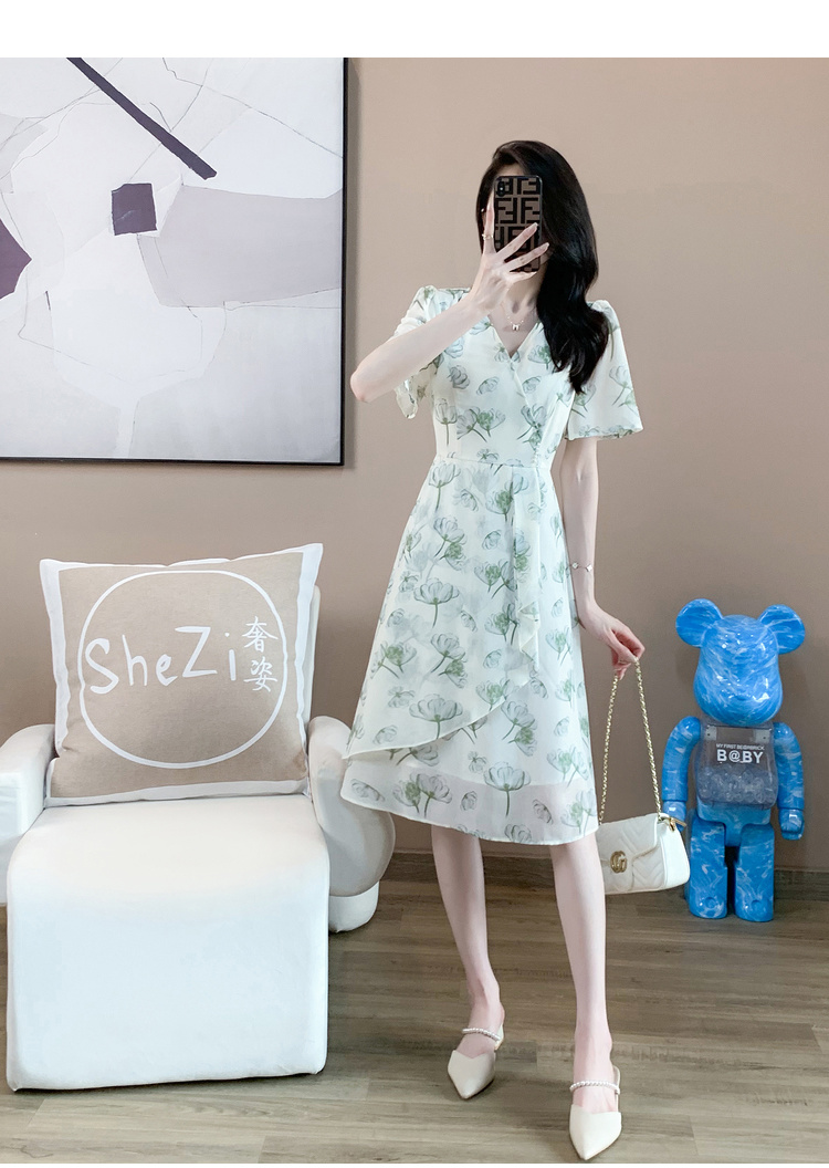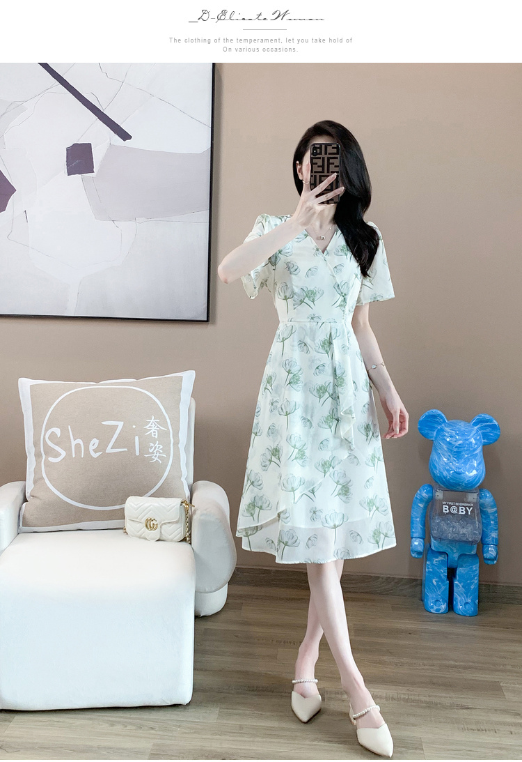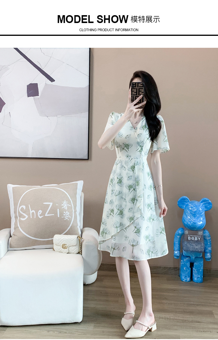 奢姿2023年夏季新款大码女装印花V领雪纺连衣裙胖妹妹减龄裙子9932825455
