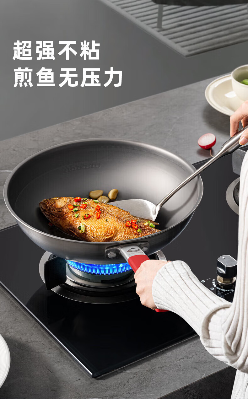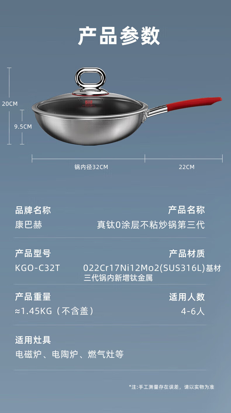 康巴赫纯钛不粘炒锅0涂层炒菜锅第三代316L不锈钢电磁炉燃气灶KGO-C32T JQR