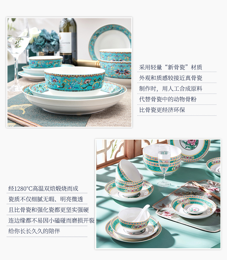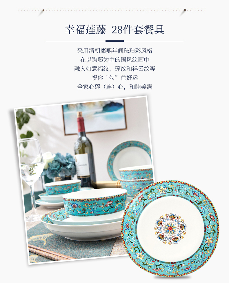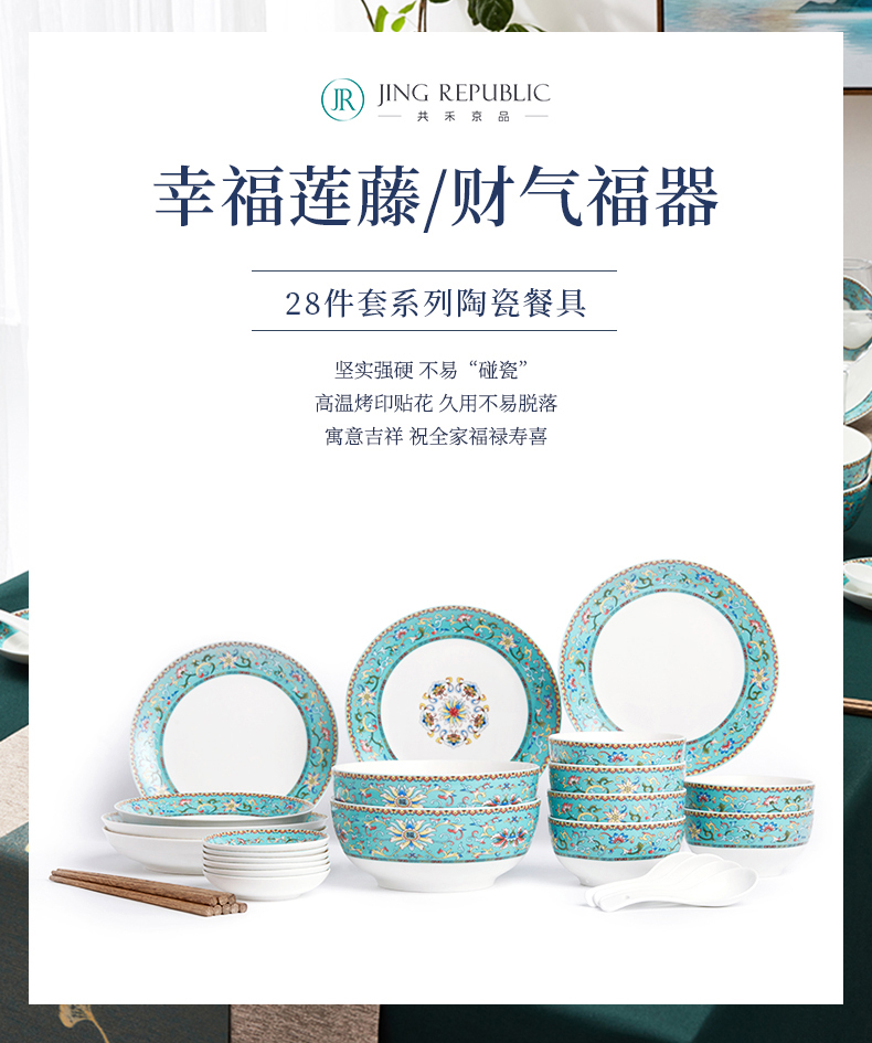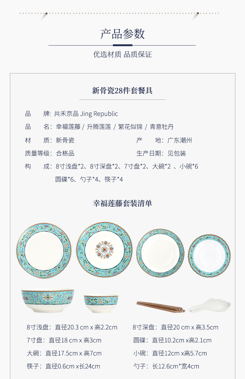 青意牡丹幸福莲藤 新骨瓷28头餐具套组(含竹筷)