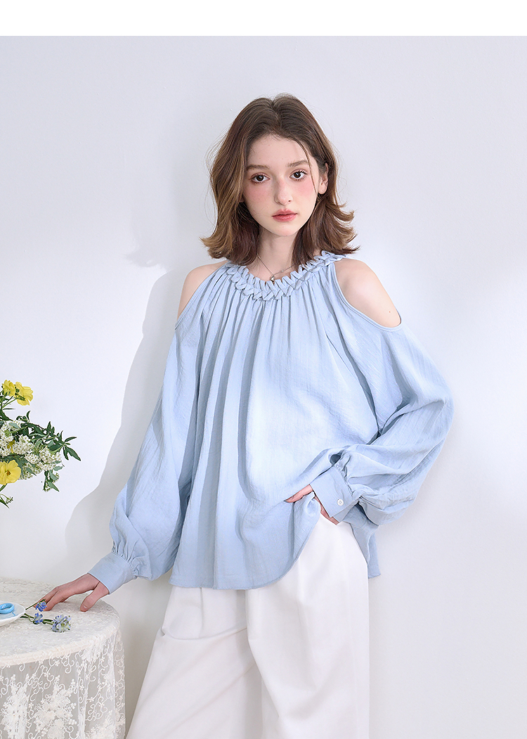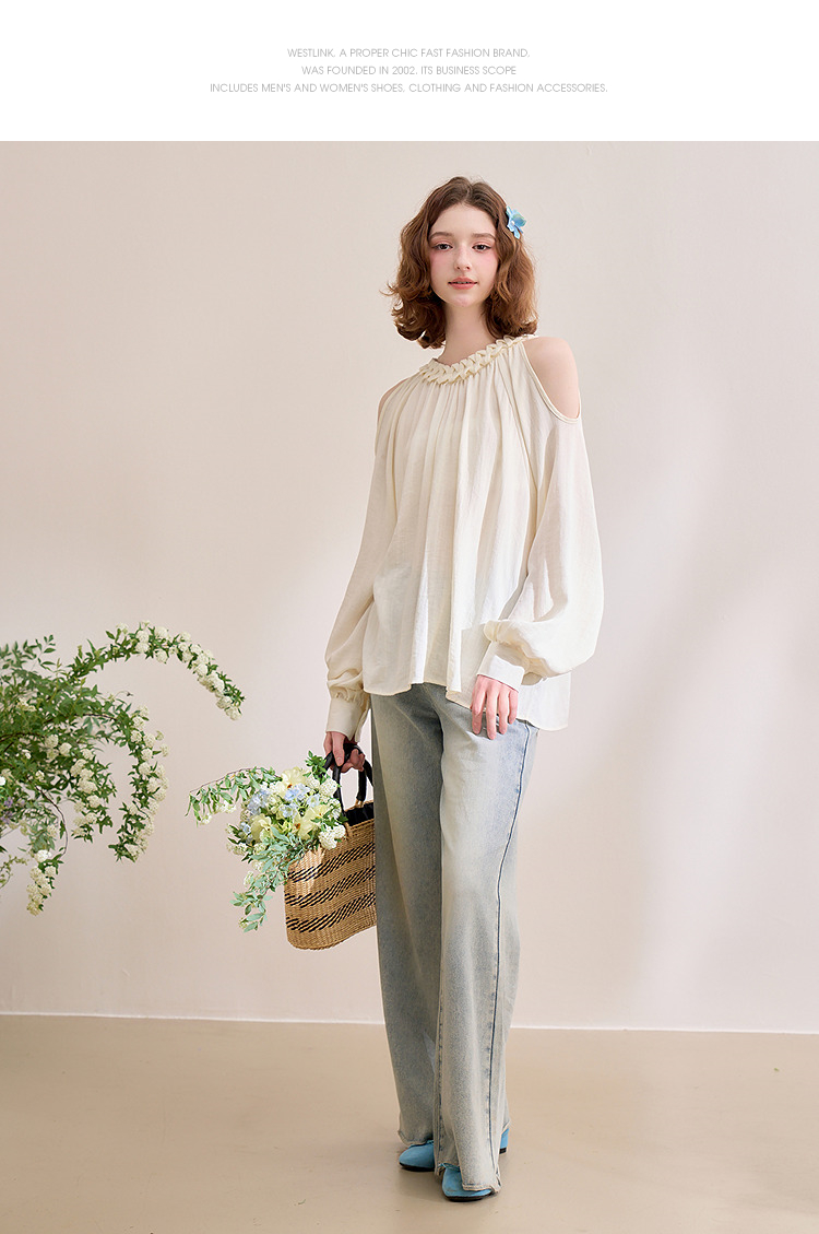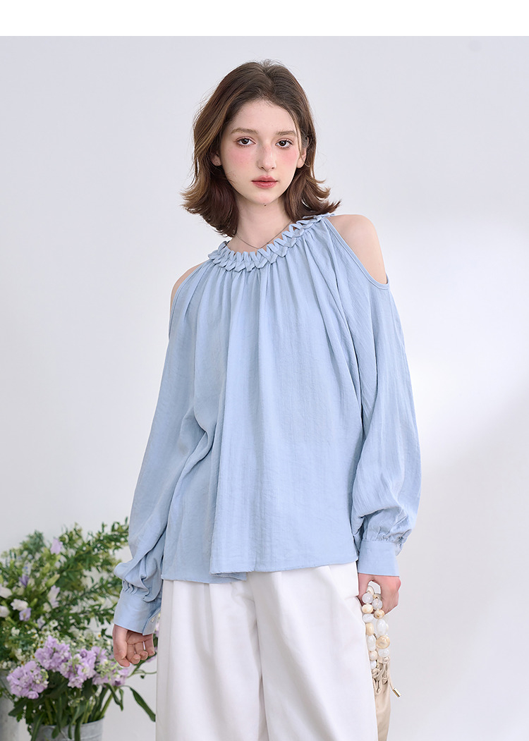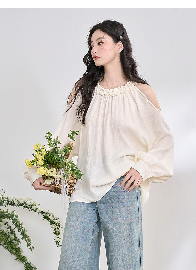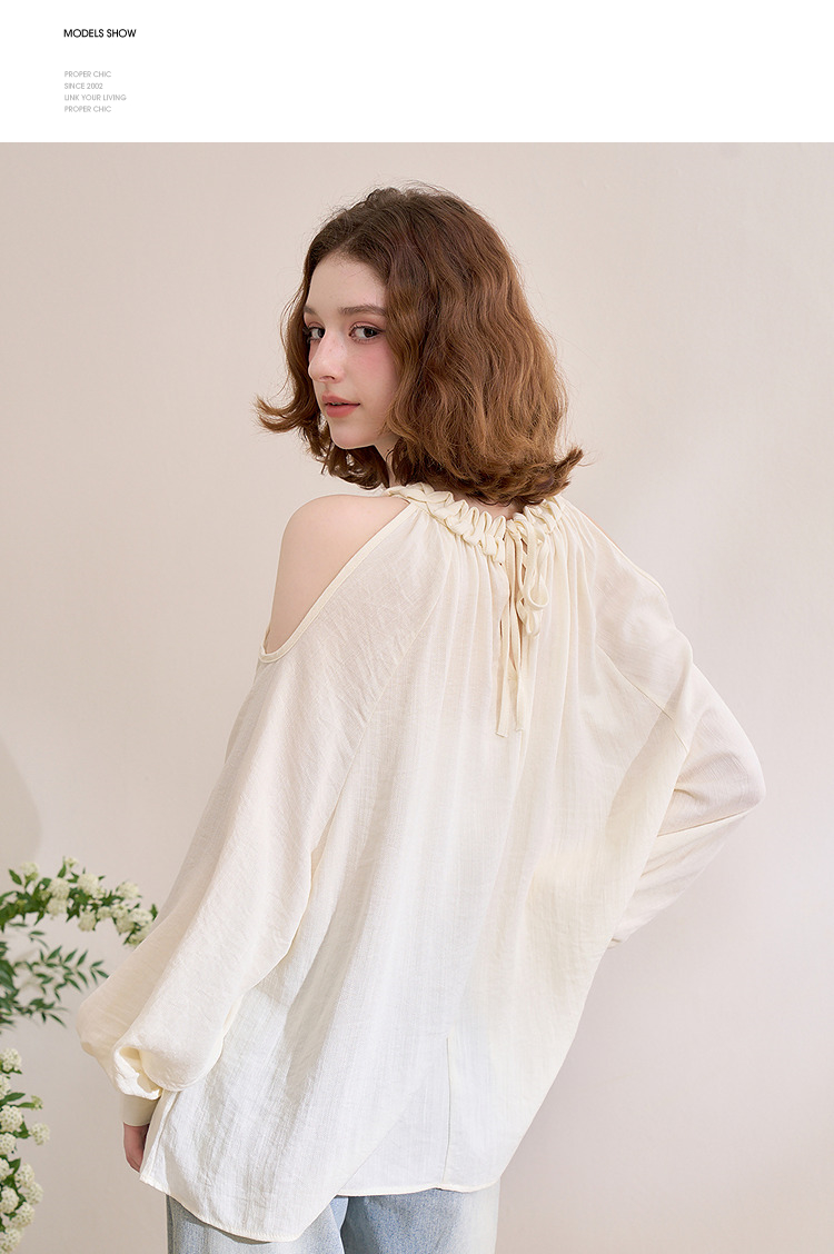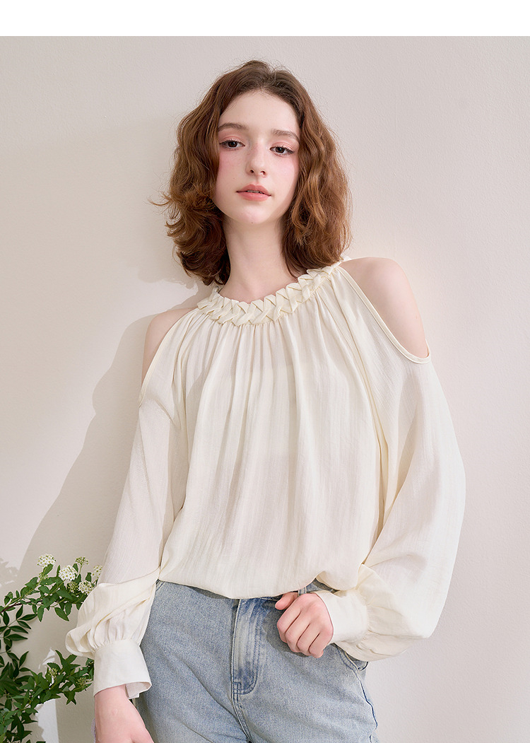 西遇黄色挂脖衬衫女新款宽松慵懒风法式露肩长袖上衣D0050460