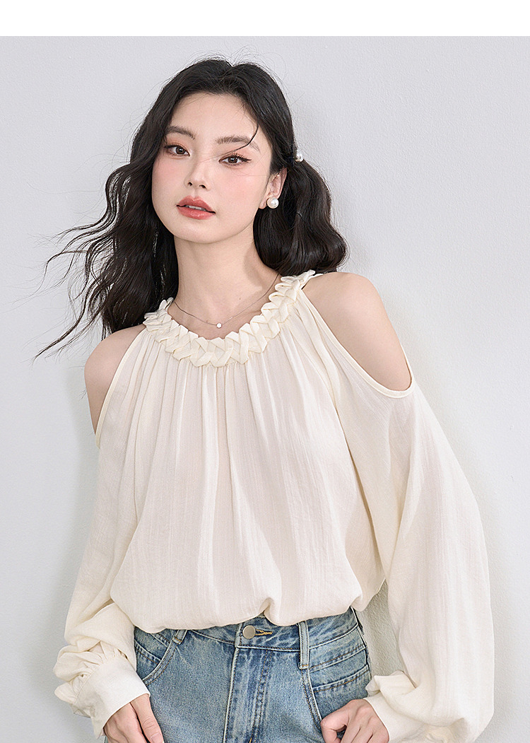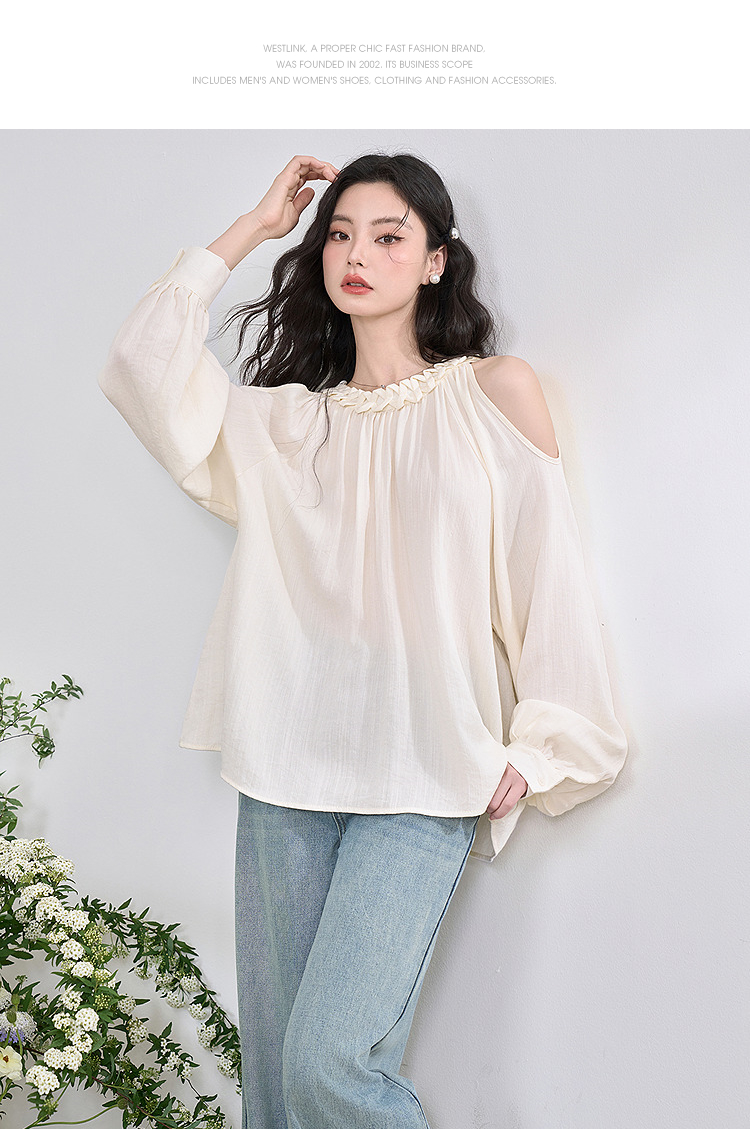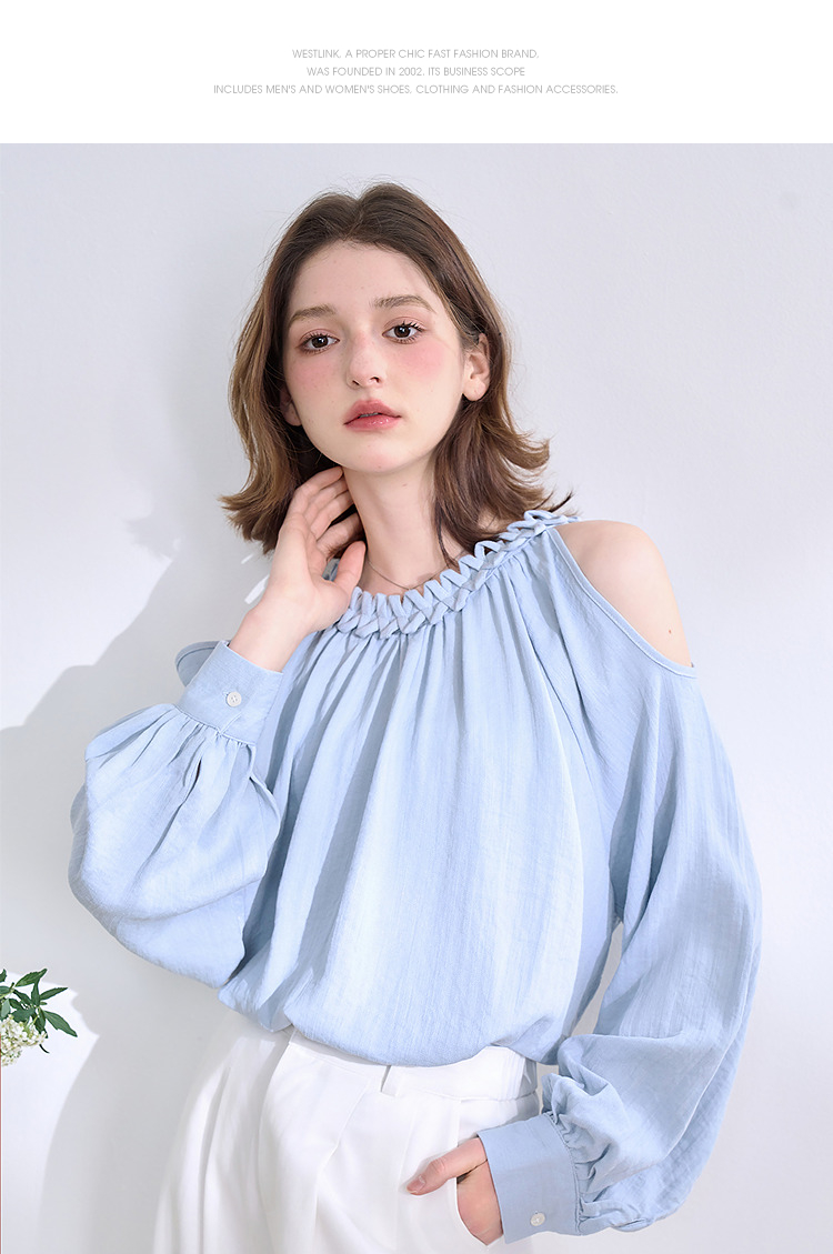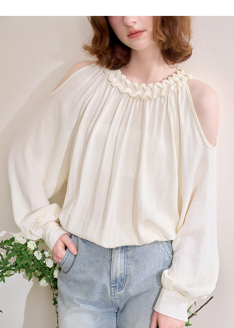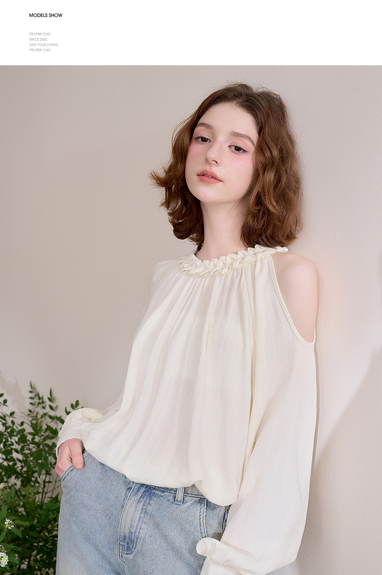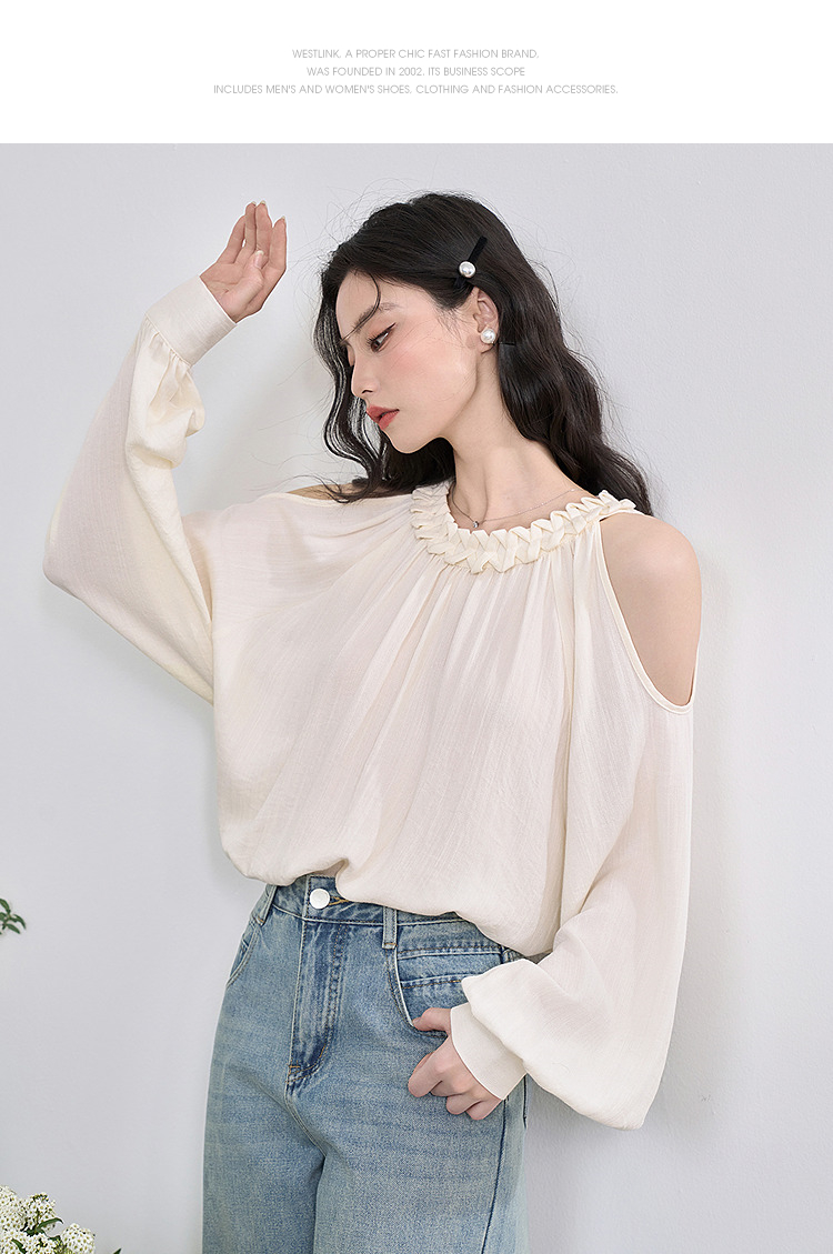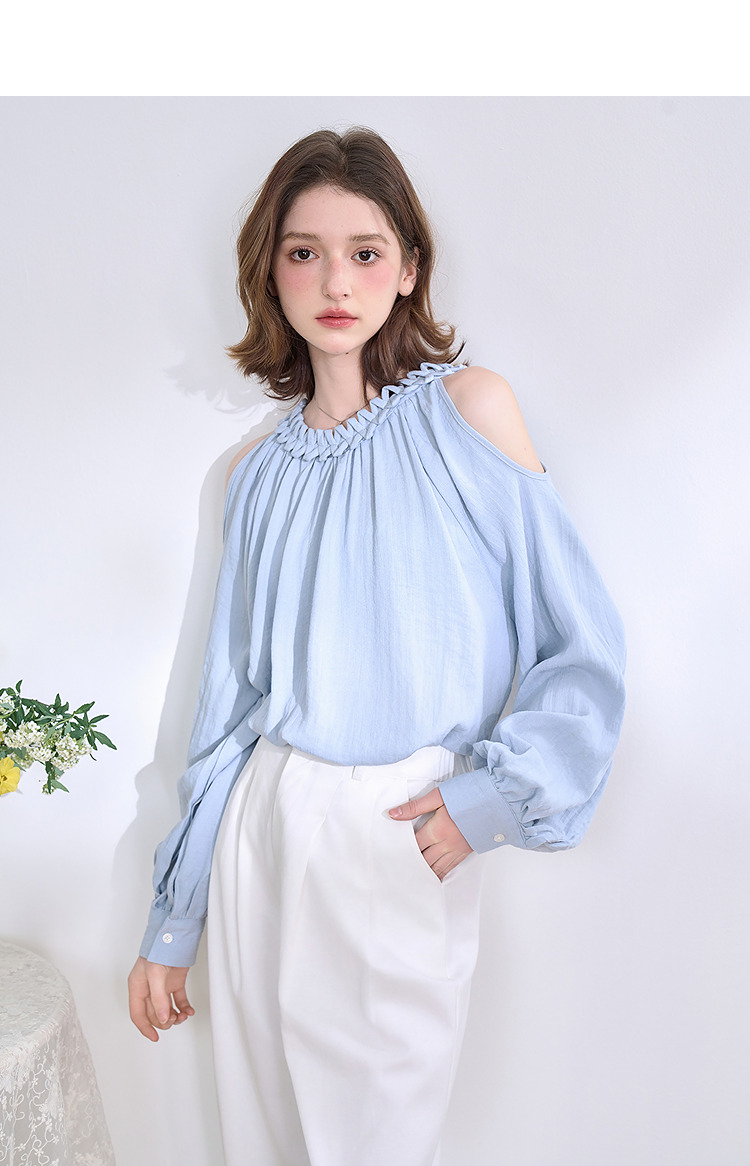 西遇黄色挂脖衬衫女新款宽松慵懒风法式露肩长袖上衣D0050460