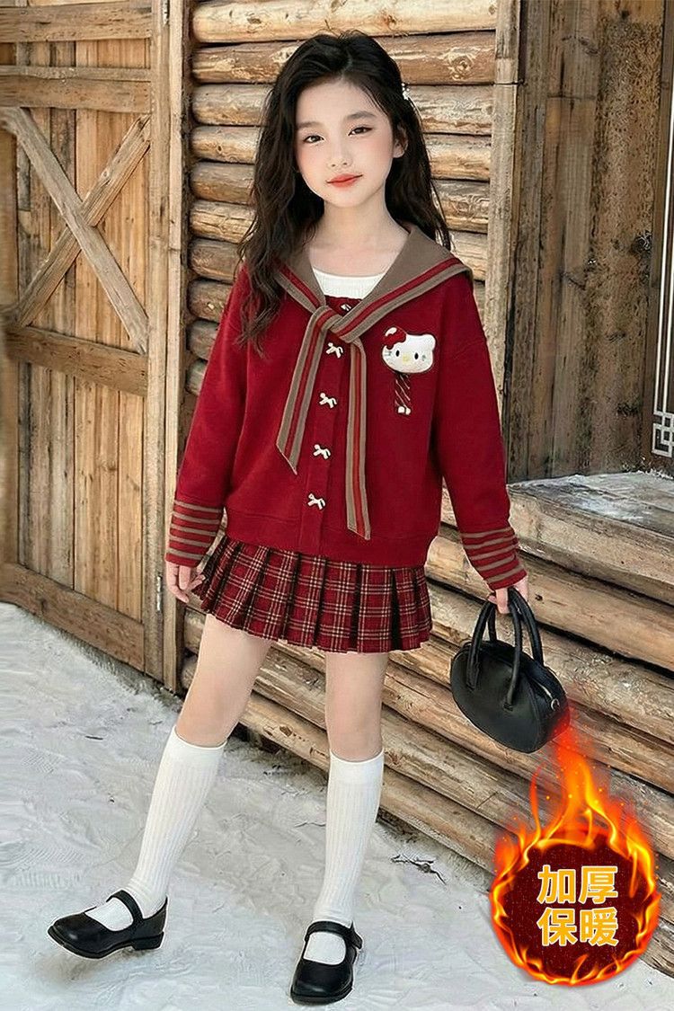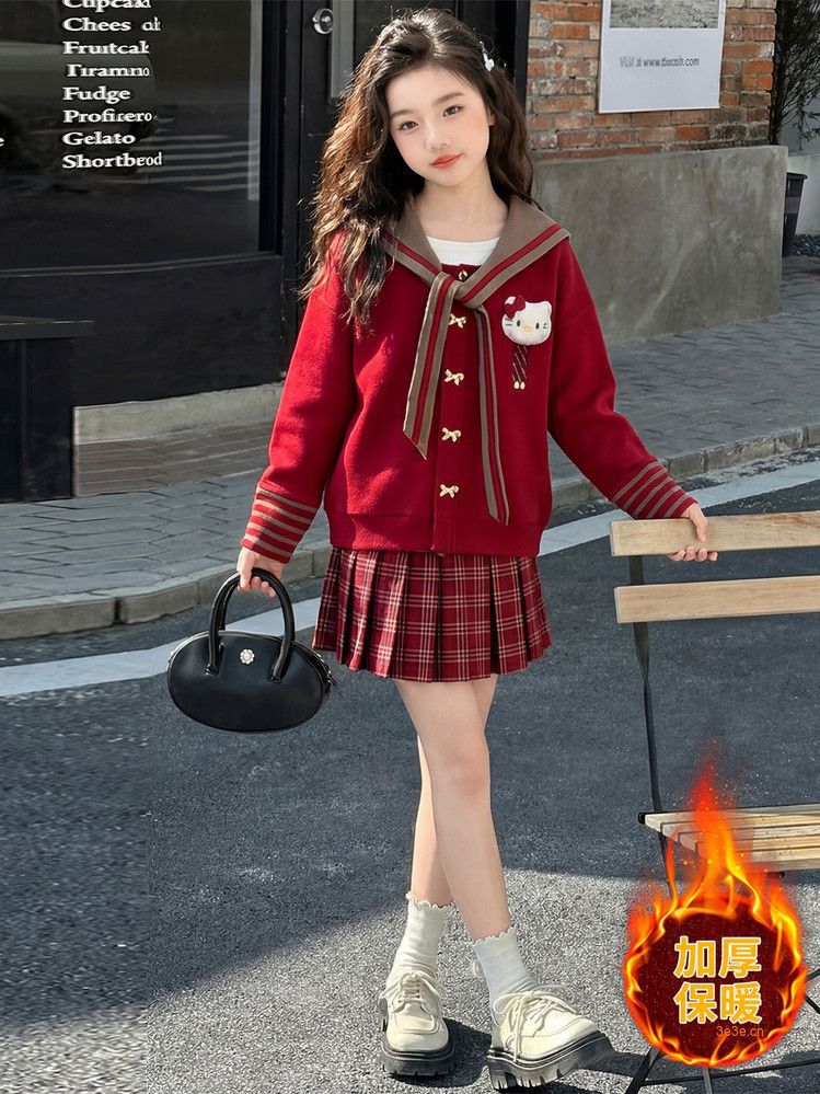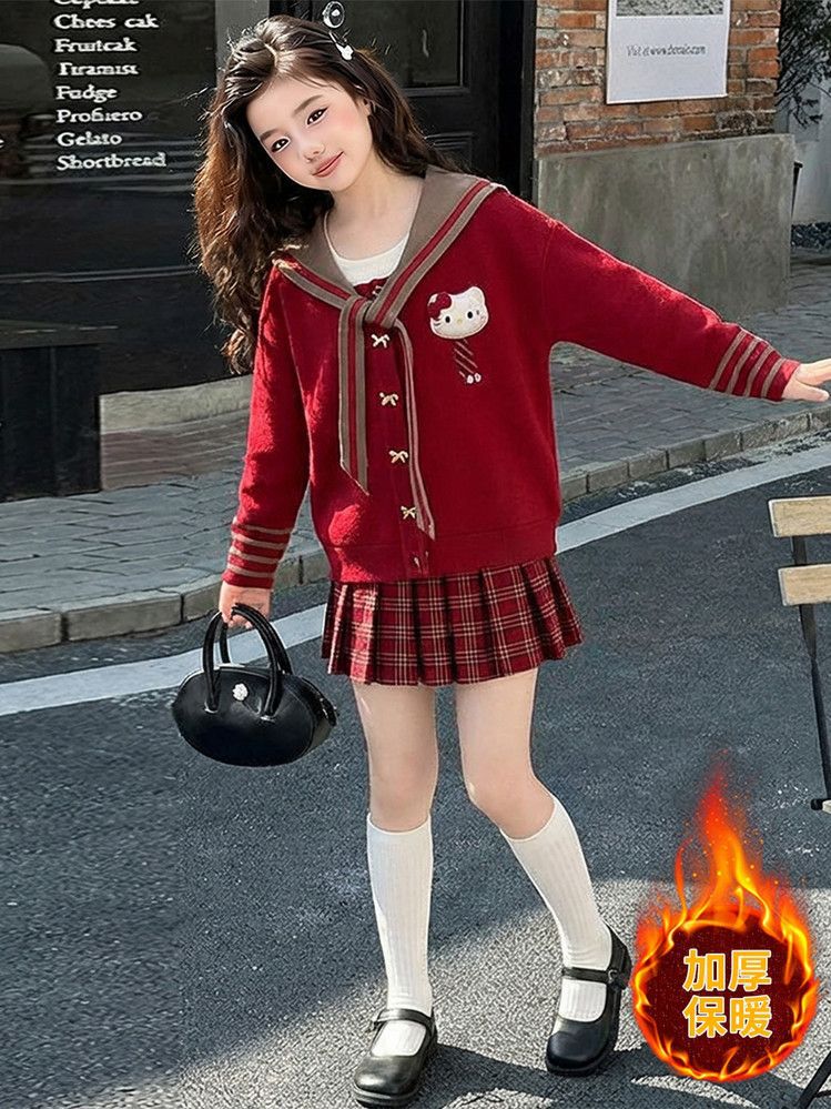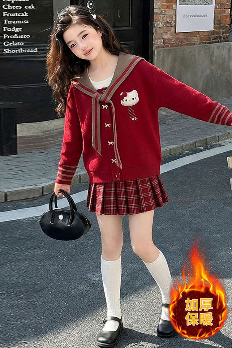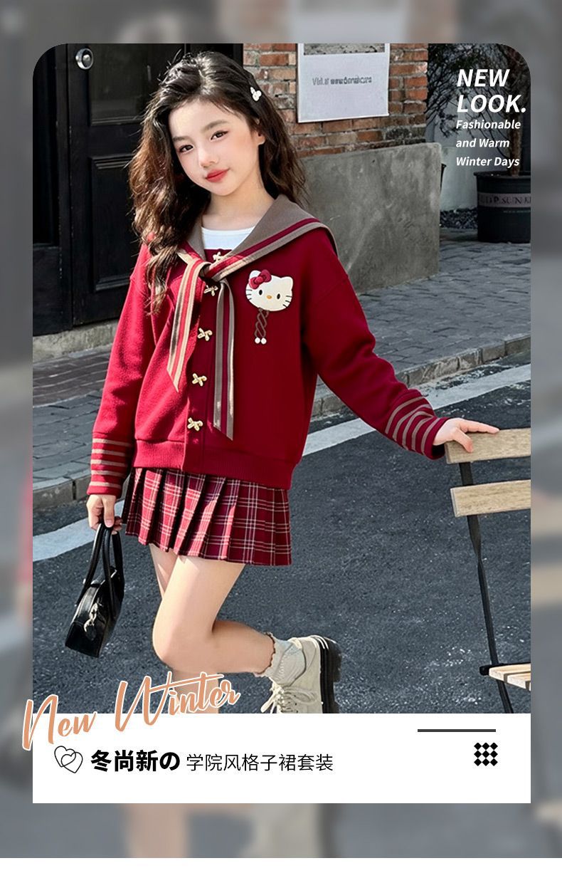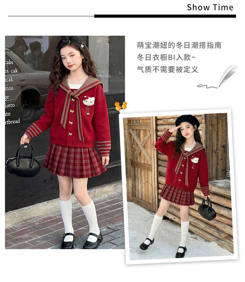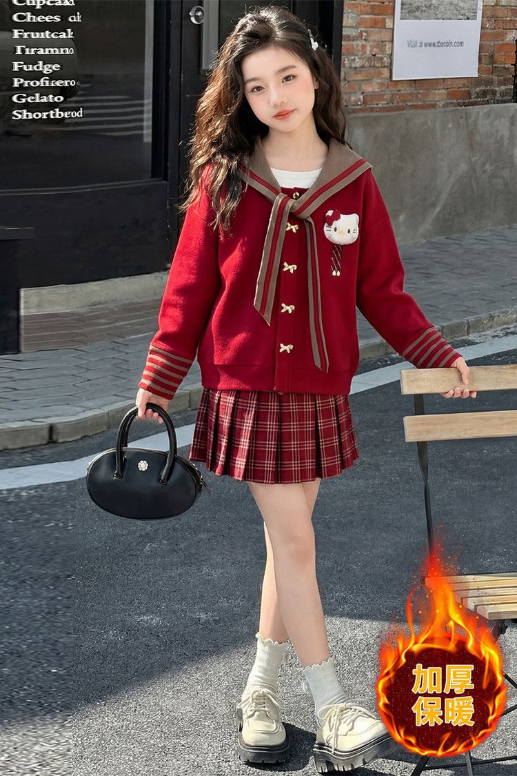 【甜系年服❗️潮流时尚】女童冬季加厚毛衣送KT猫挂件+加绒百褶裙两件套新年喜庆。jd