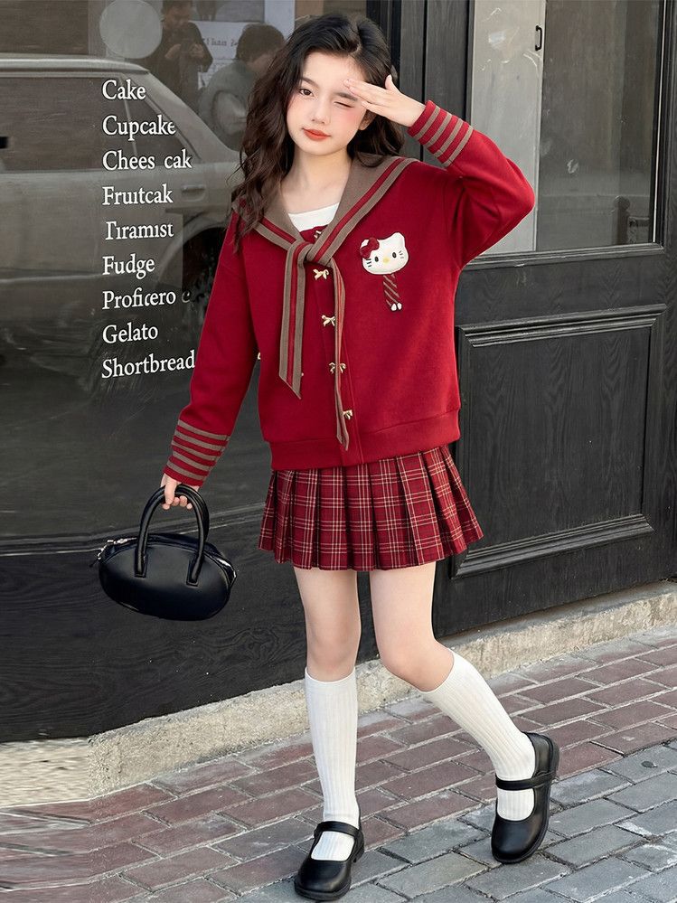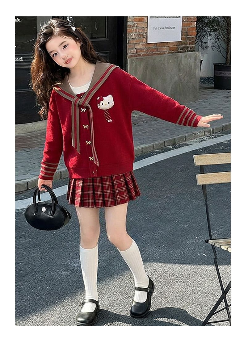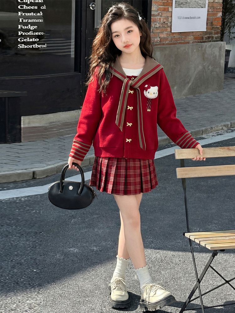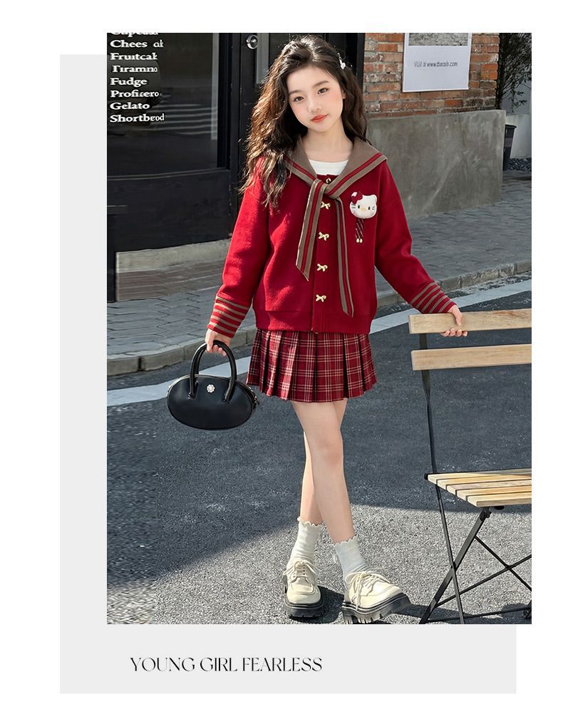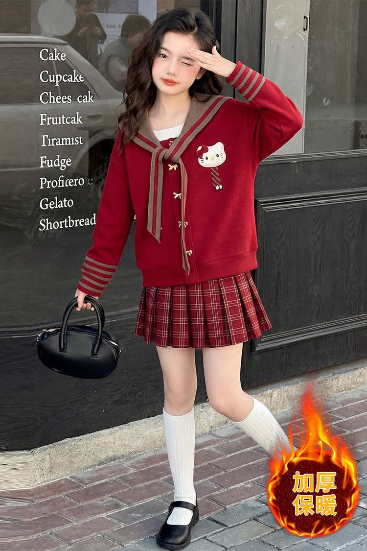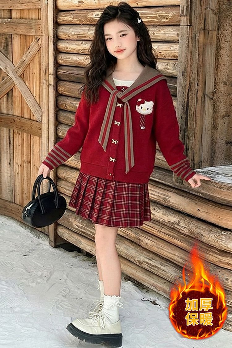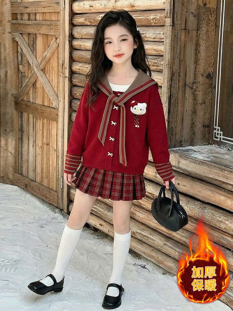 【甜系年服❗️潮流时尚】女童冬季加厚毛衣送KT猫挂件+加绒百褶裙两件套新年喜庆。jd