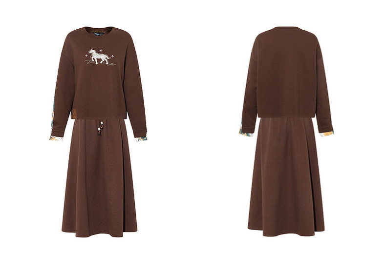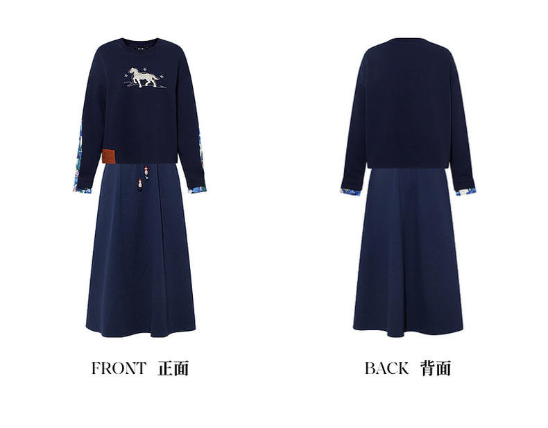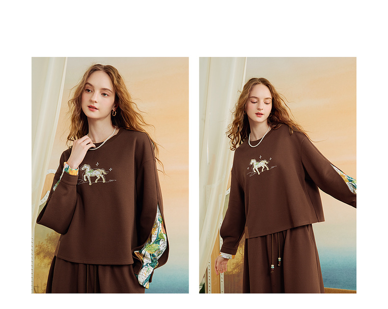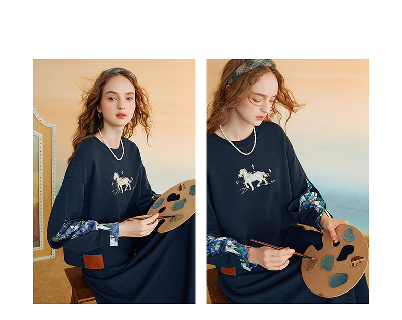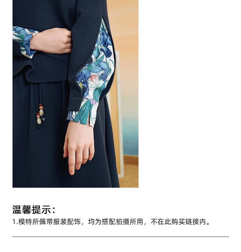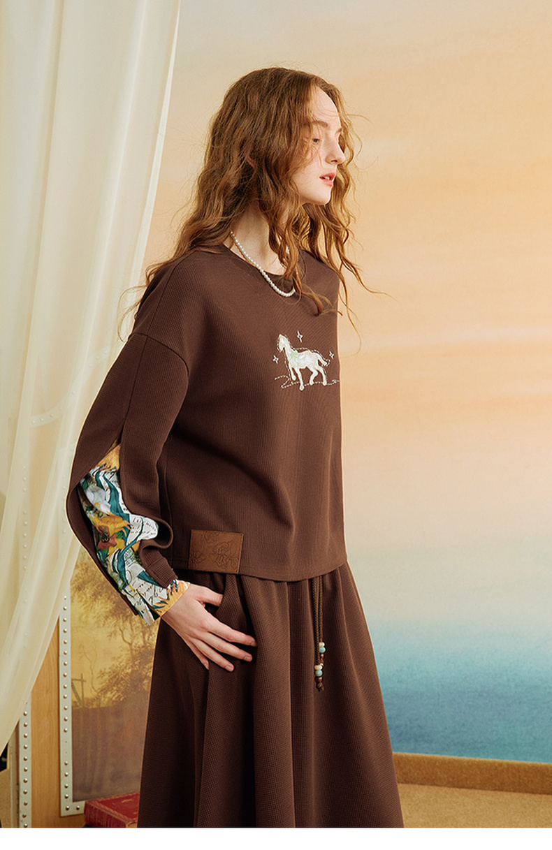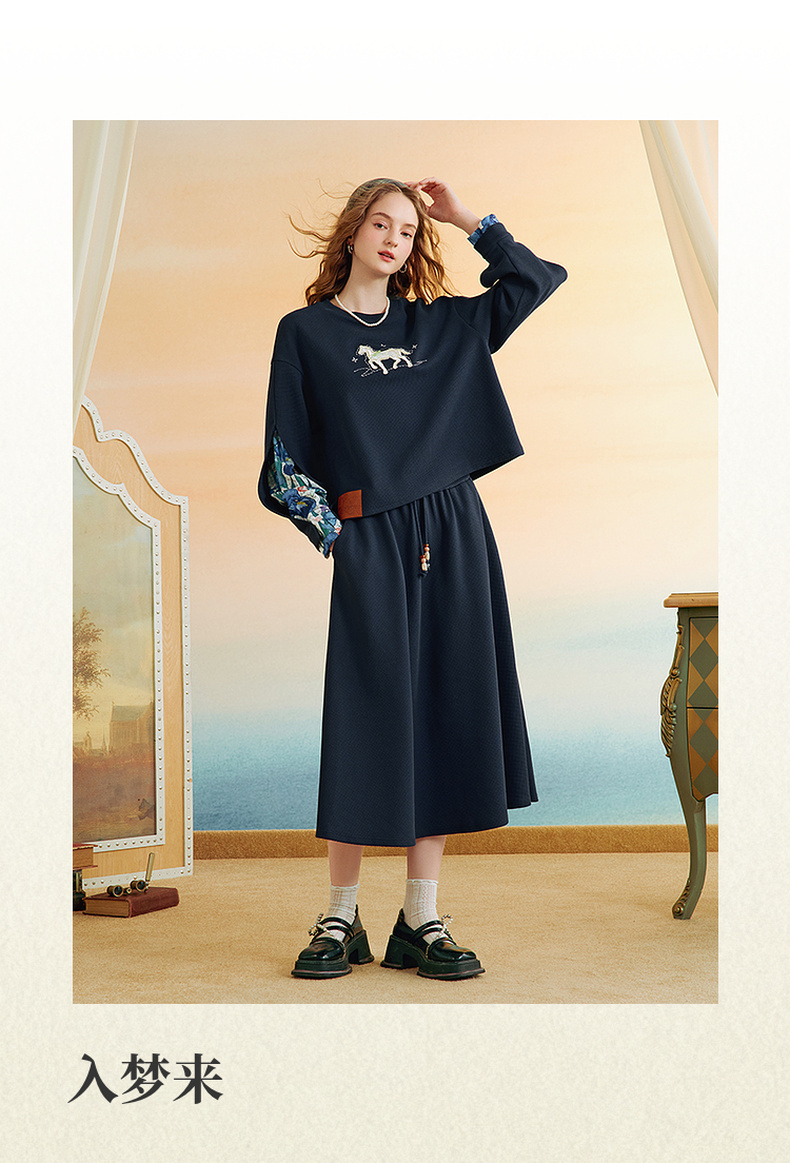 两三事梵高文艺入梦来2025秋季新款刺绣印花拼接上衣半裙两件套女