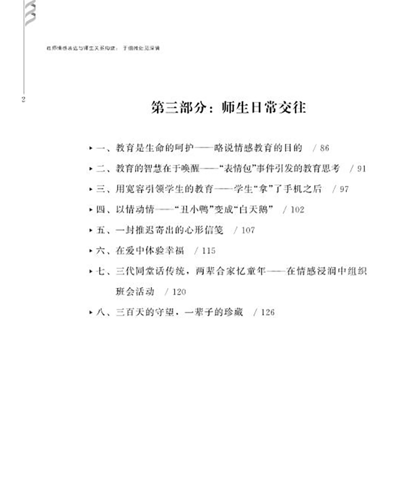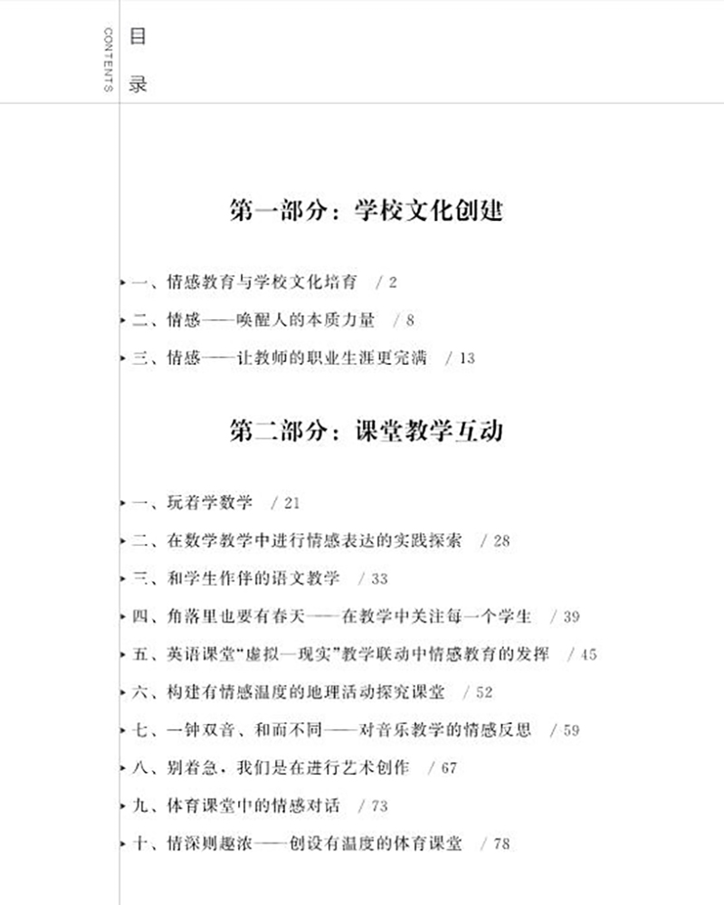 全书分为三大部分:学校文化建设、课堂教学互动、师生日常交往,共计21篇文章。希望通过在真实的教学情境中解读情感教育的基本理念,让更多教师能够用“情感之眼”去看待学生、课堂教学和学校班级管理工作,于细微处见深情!