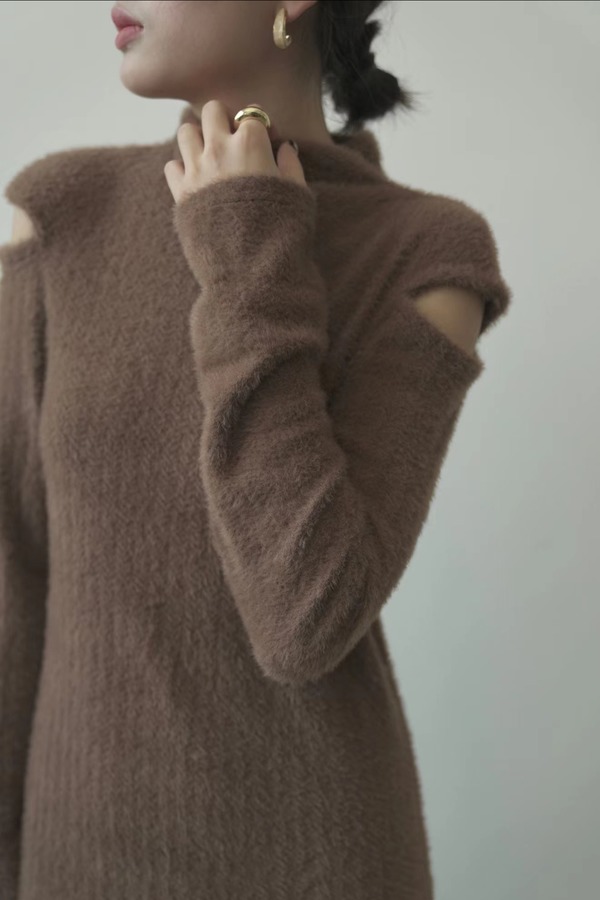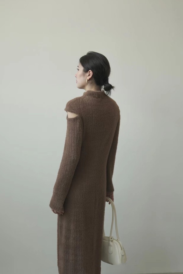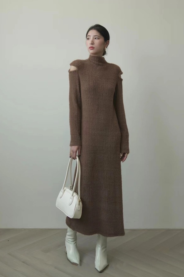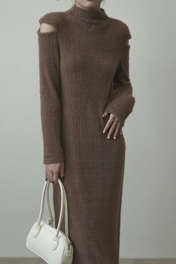 L.Fleuri 棕色露肩毛绒感长款连衣裙 17768