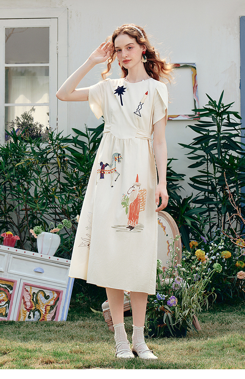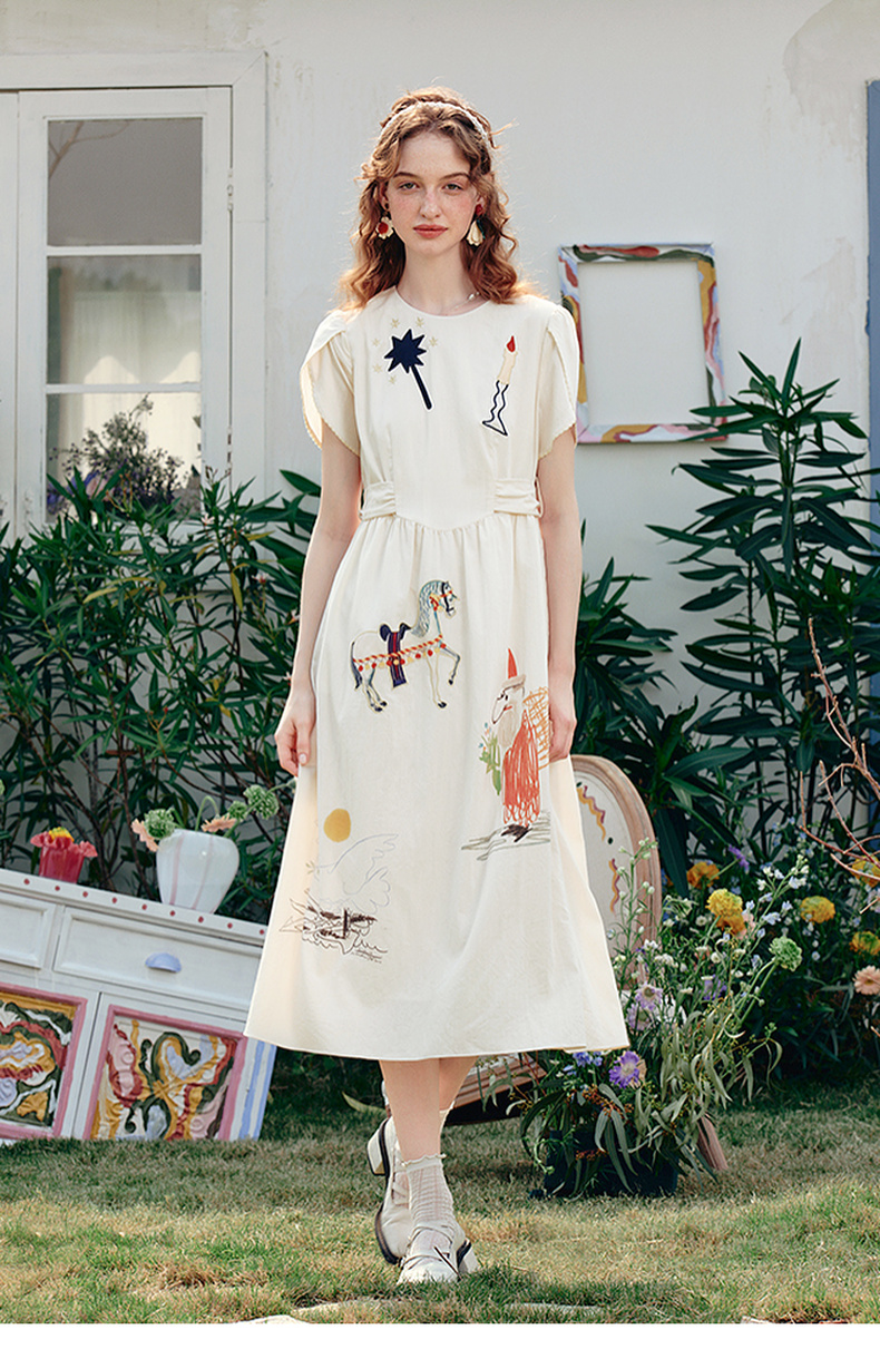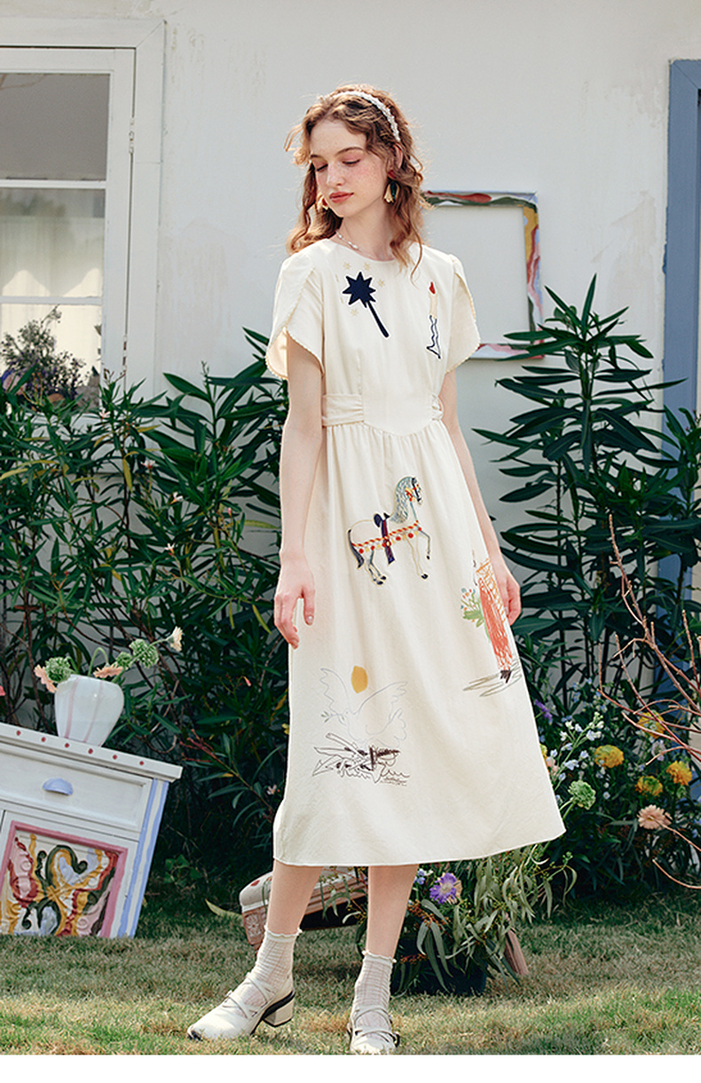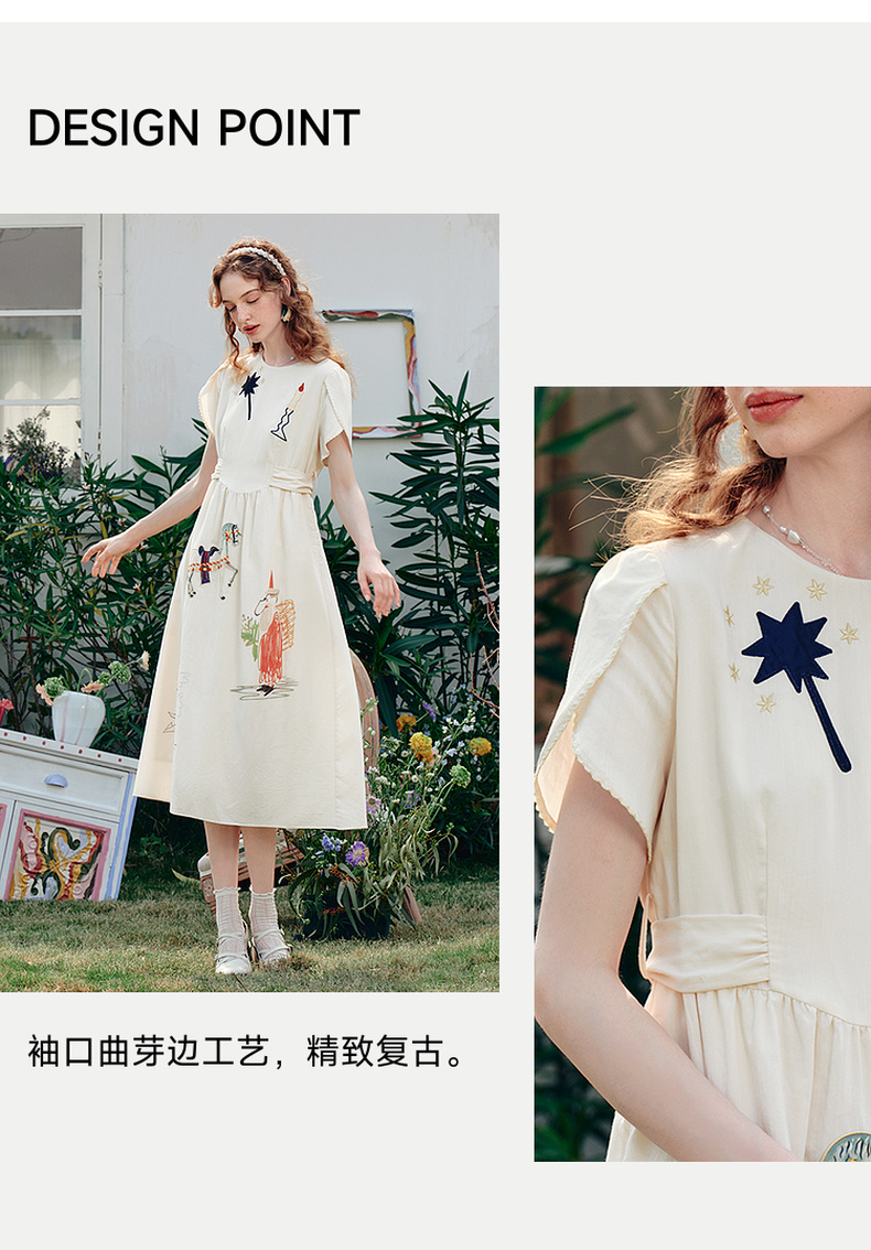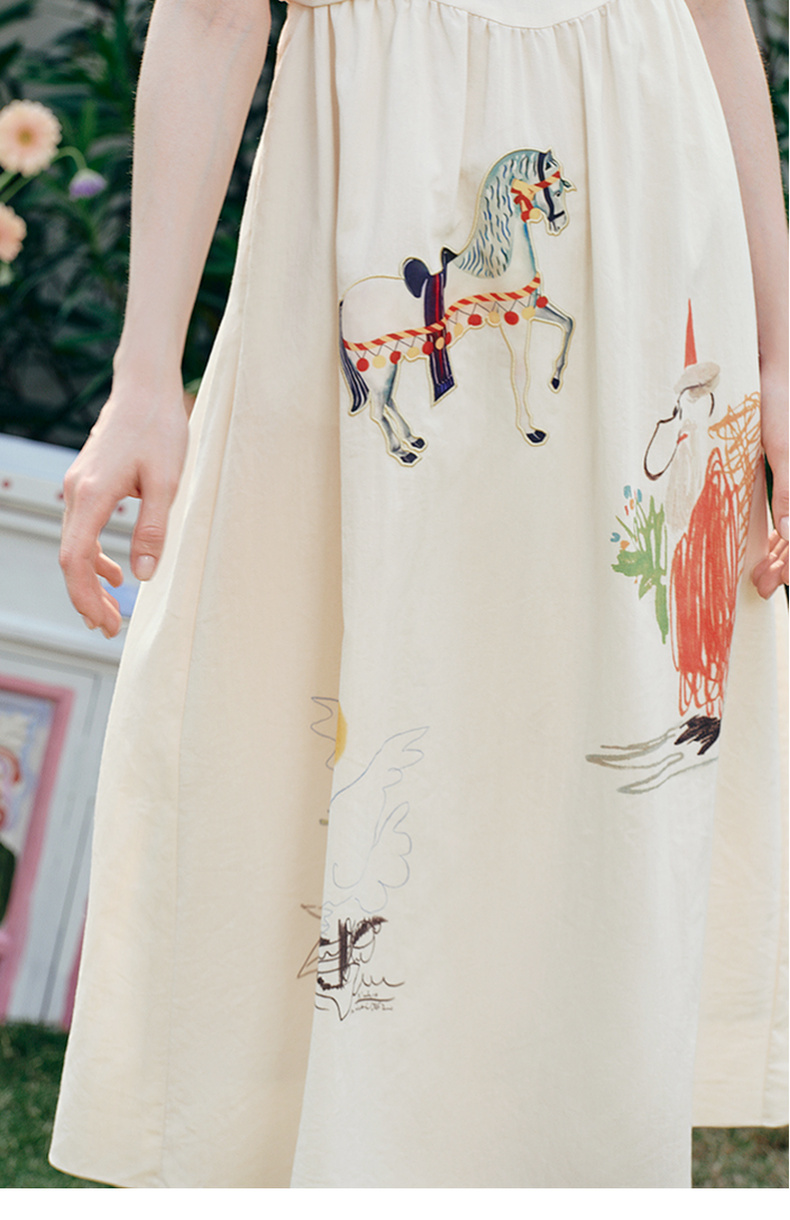 两三事 天马星辰 2025夏季新款童趣刺绣涂鸦印花绑带a字连衣裙