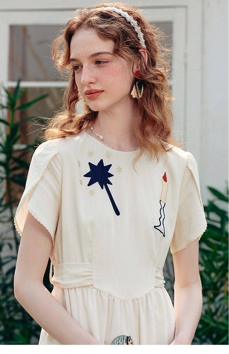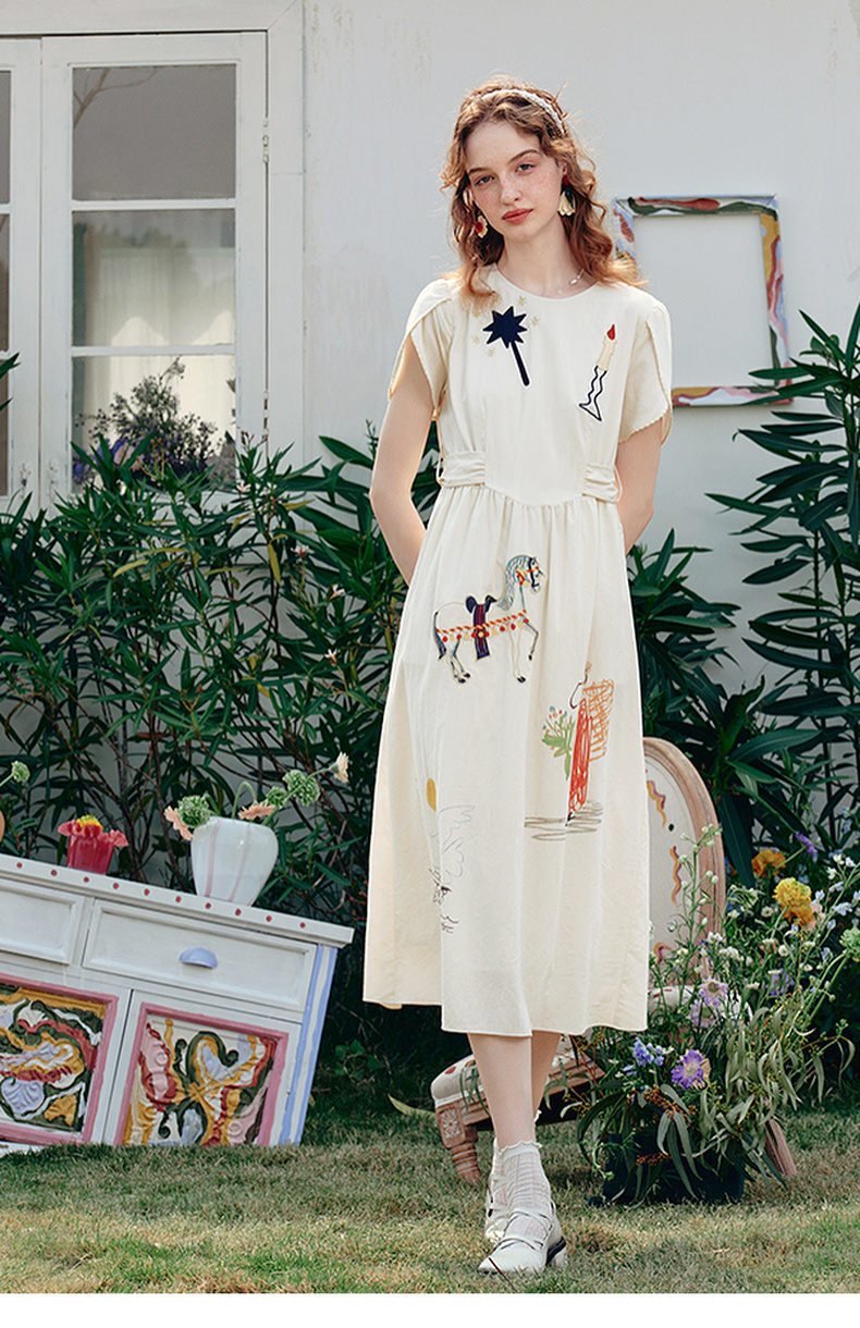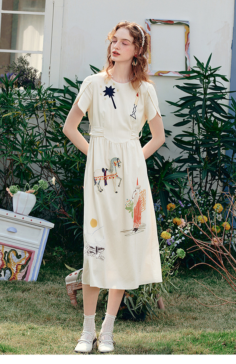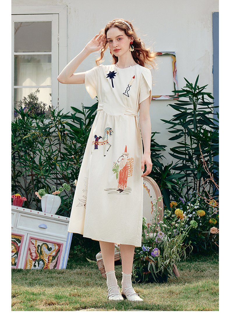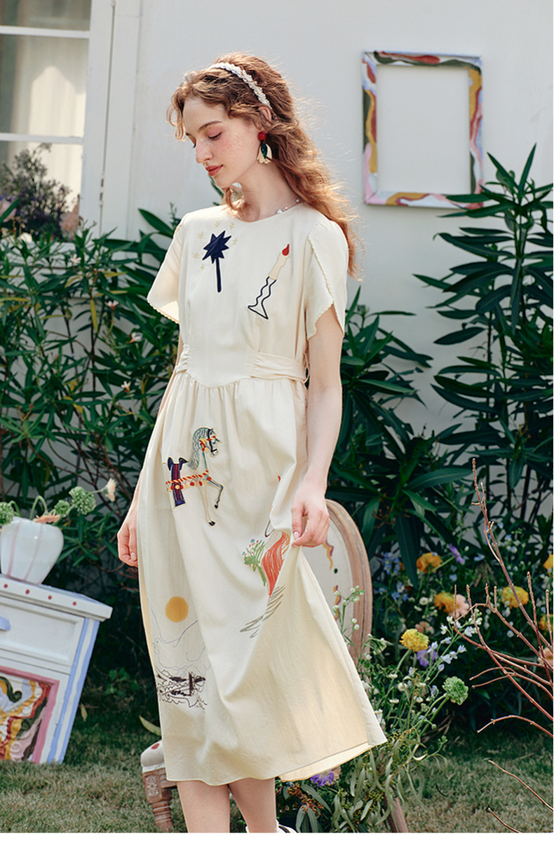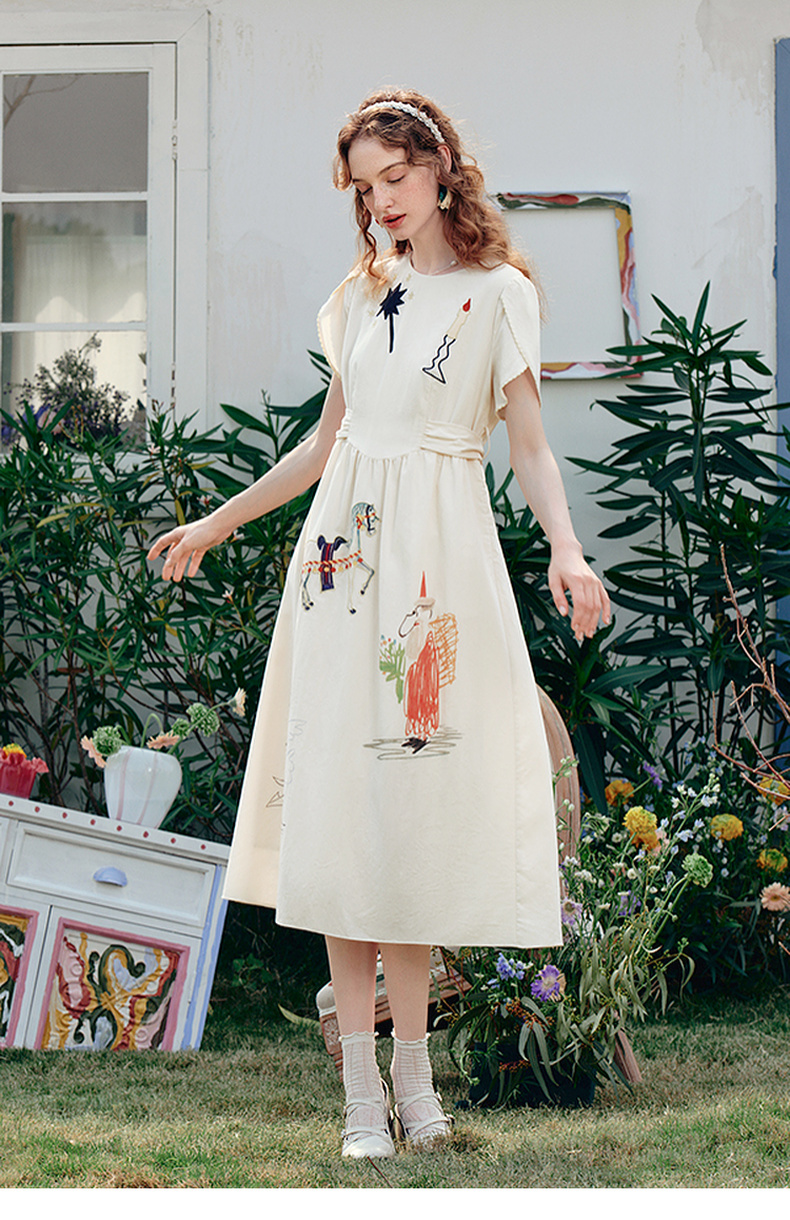 两三事 天马星辰 2025夏季新款童趣刺绣涂鸦印花绑带a字连衣裙