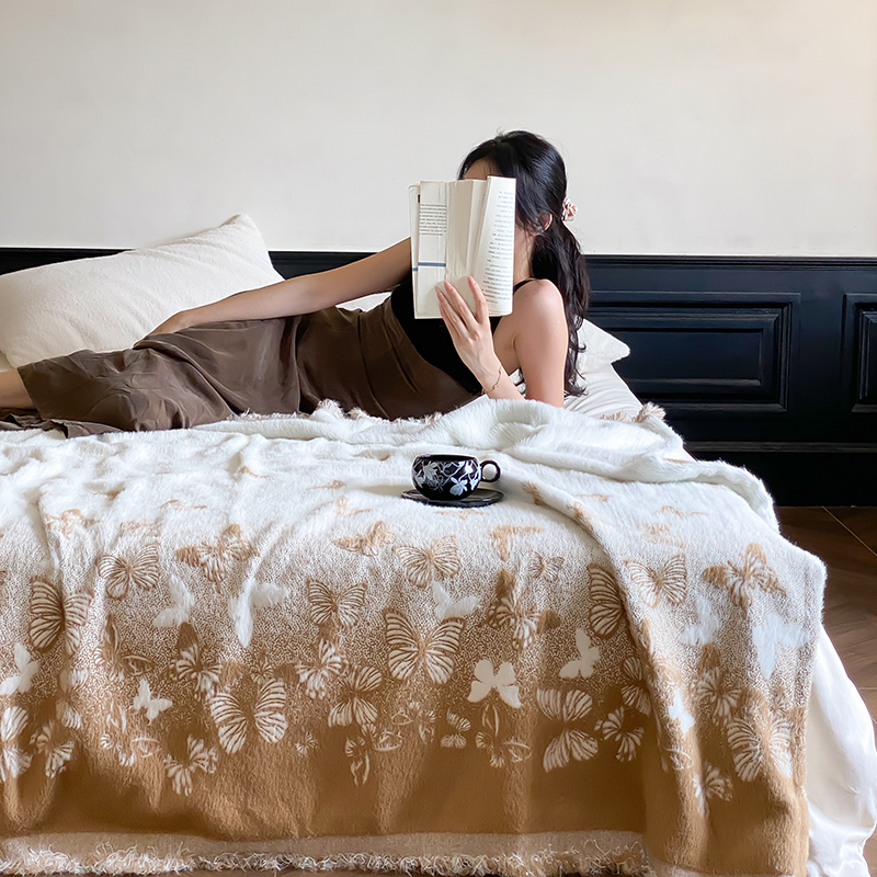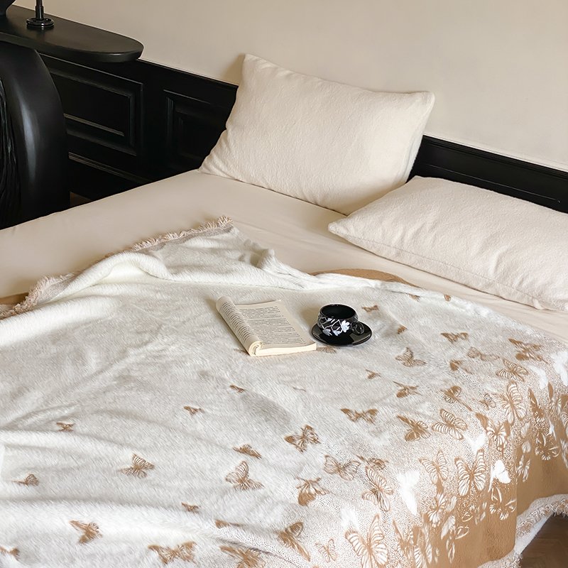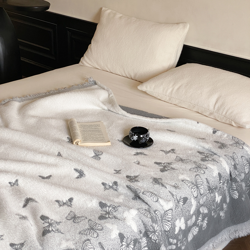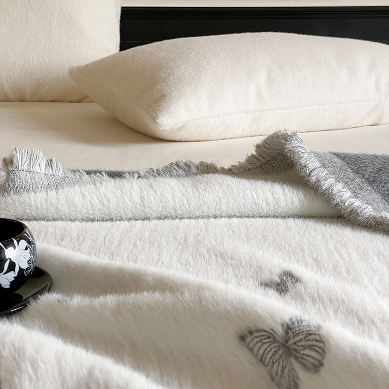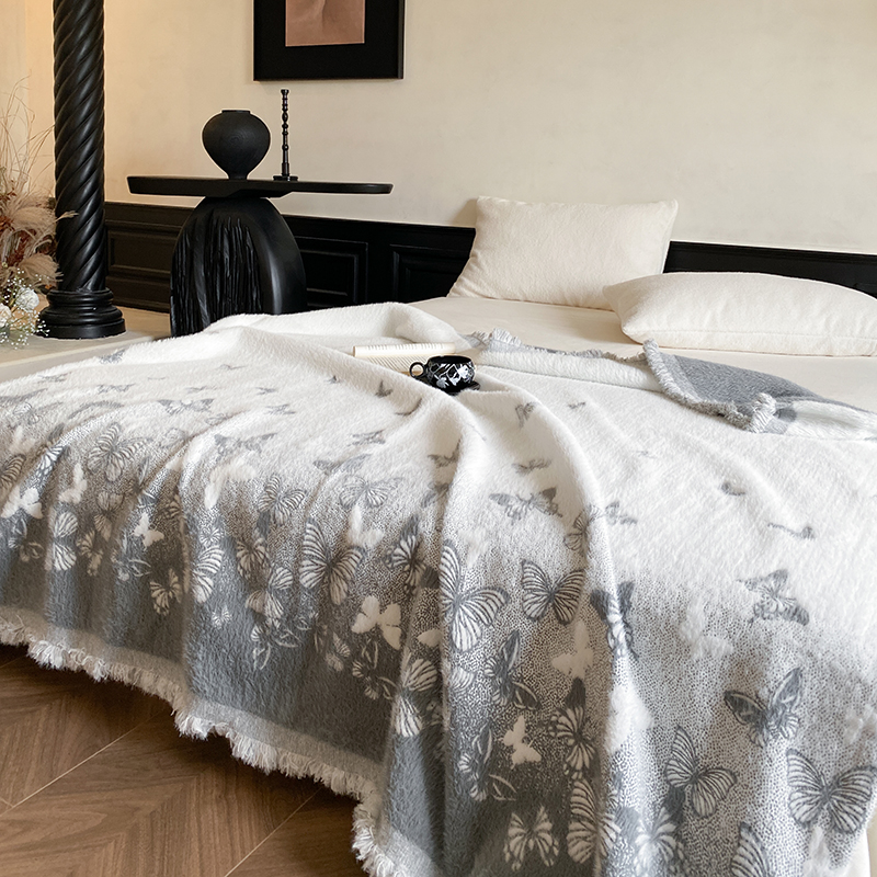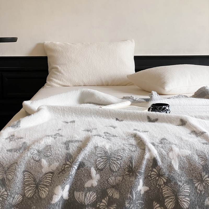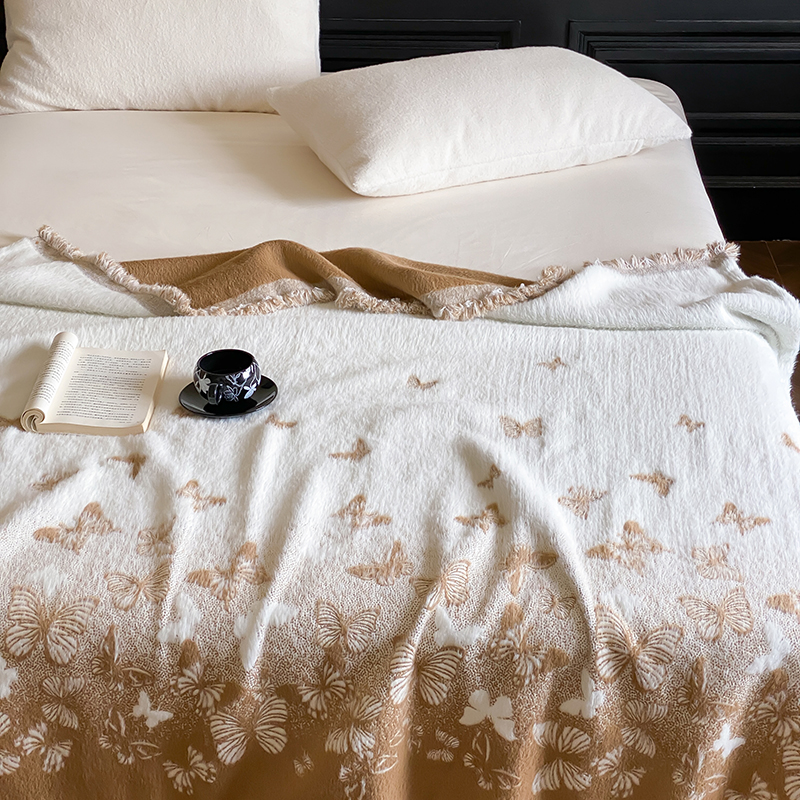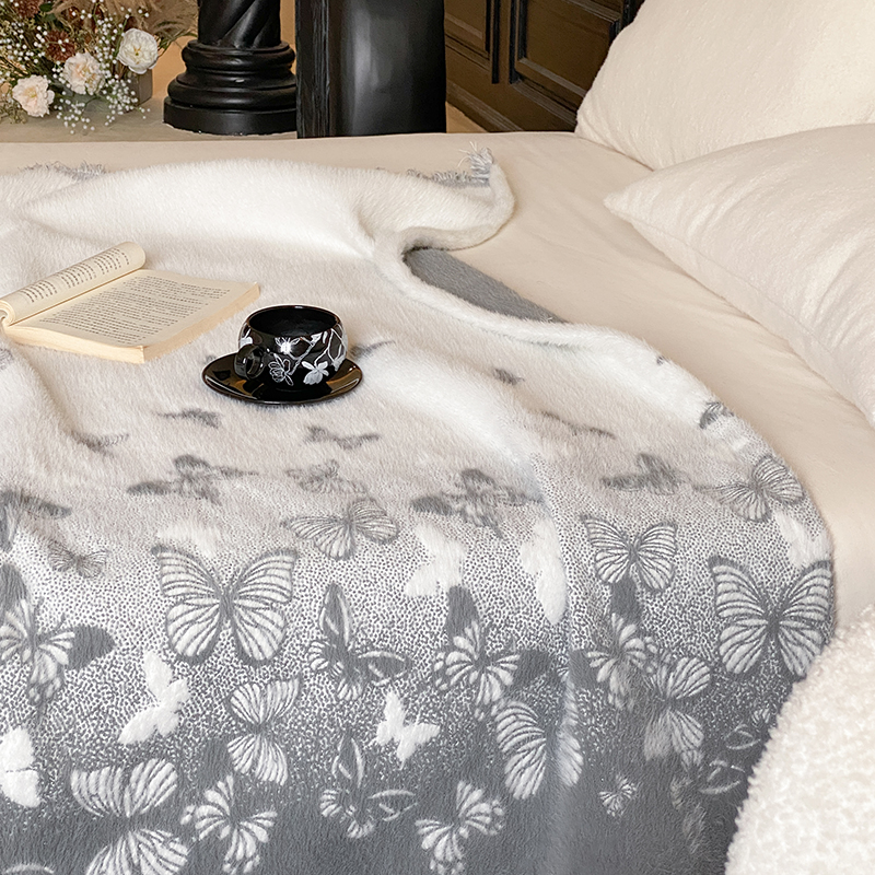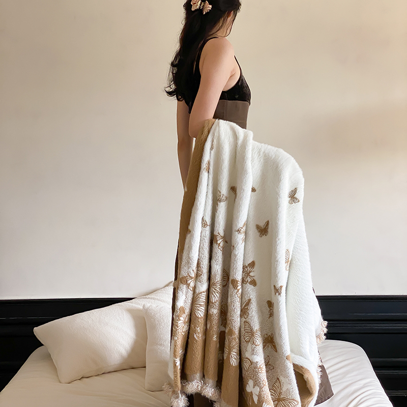 自然醒貂绒毛毯国风系列高端蝴蝶花卉长毛貂绒毛毯流苏毯双面盖毯保暖厚实秋冬单人毯MT