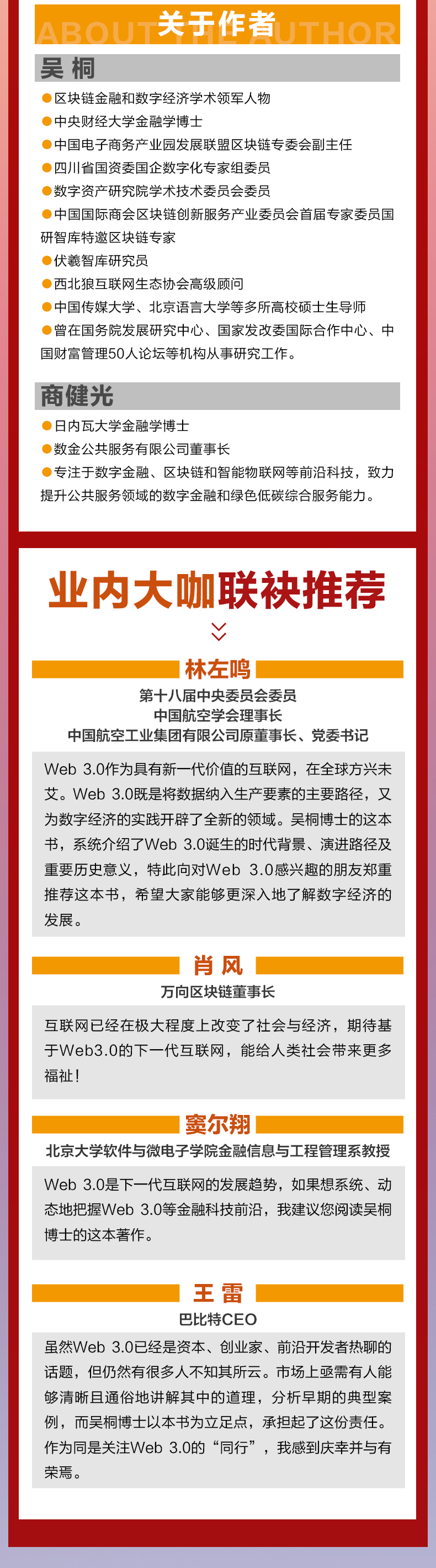 Web 3.0作为具有新一代价值的互联网,在全球方兴未艾。Web 3.0既是将数据纳入生产要素的主要路径,又为数字经济的实践开辟了全新的领域。此外,以OpenAI开发的ChatGPT为代表的人工智能的发展构成了人类未来十年发展的另外一条主线。Web 3.0通过将数据权利还给用户,本质上将生产资料进行了一定程度的解放,而以OpenAI和AIGC为代表的人工智能的发展,则极大地促进了数字经济生产力的发展。吴桐博士的这本书,系统介绍了Web 3.0诞生的时代背景、演进路径及重要历史意义,特此向对Web 3.0感兴趣的朋友郑重推荐这本书,希望大家能够更深入地了解数字经济的发展。