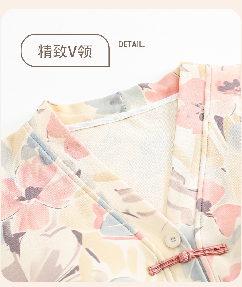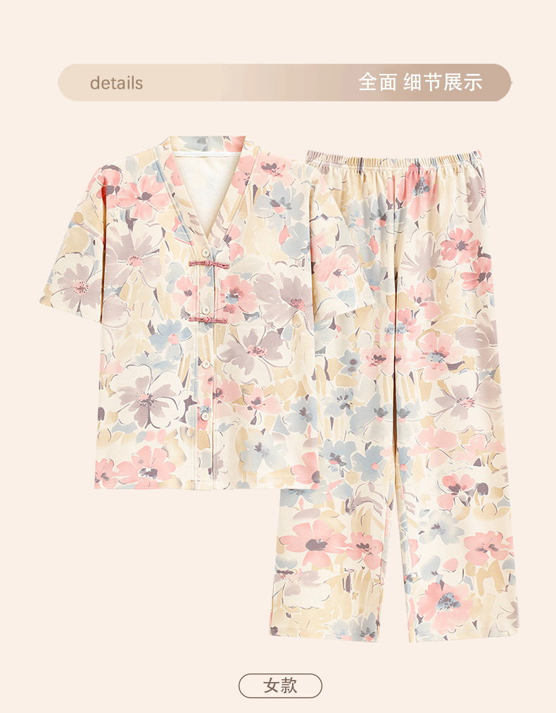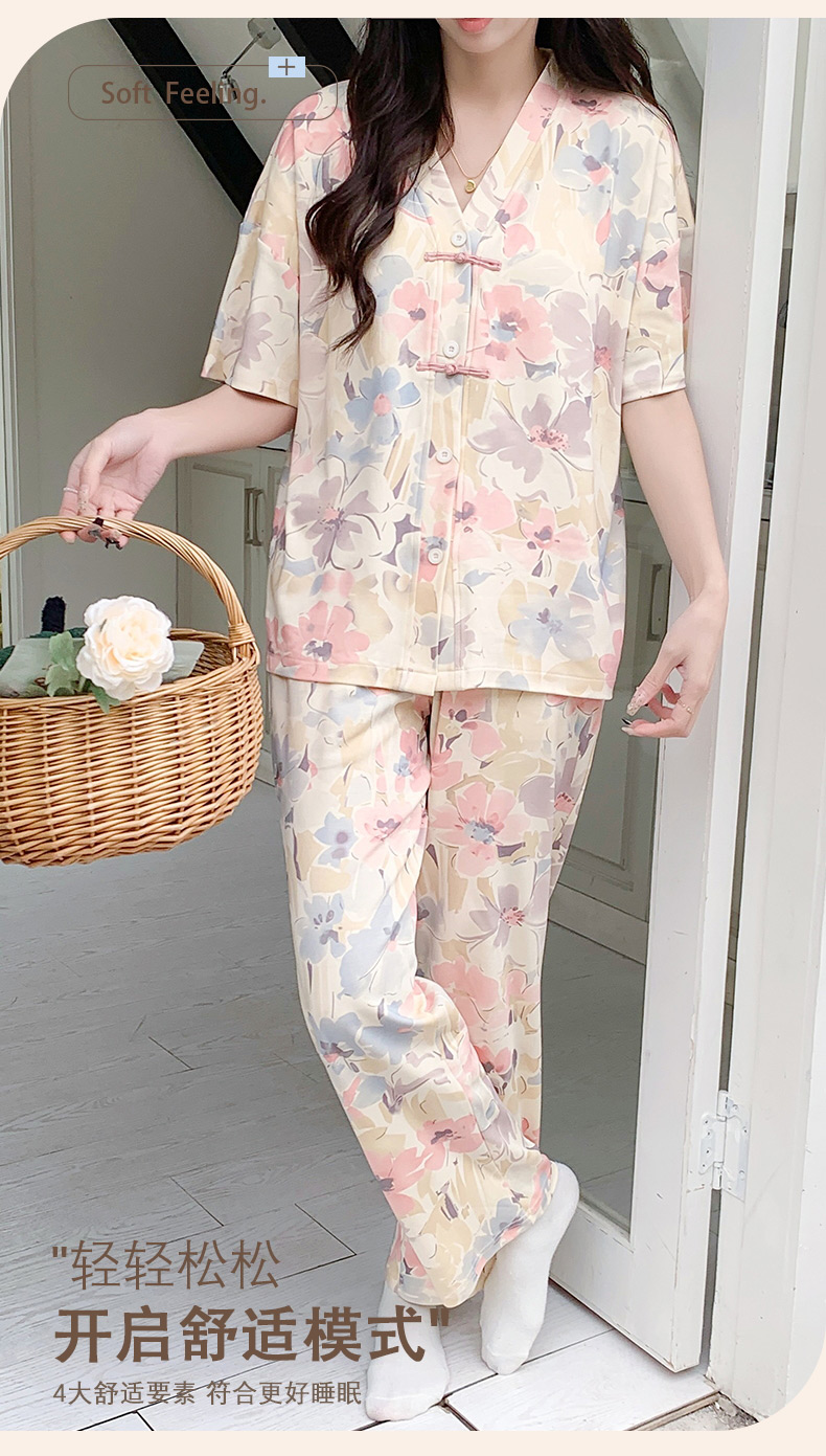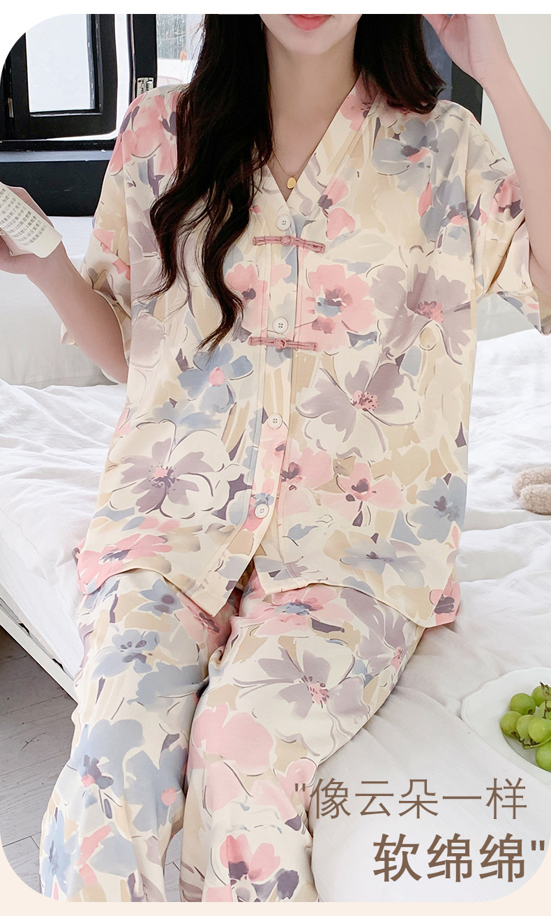 自然醒月蝶牛奶丝女士睡衣短袖长裤可外穿夏季休闲国风和服宽松两件套家居服QH