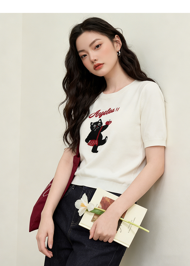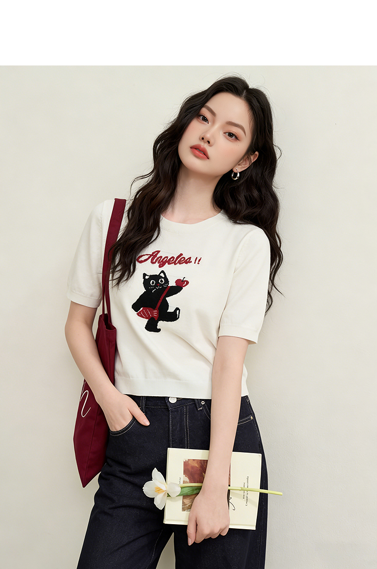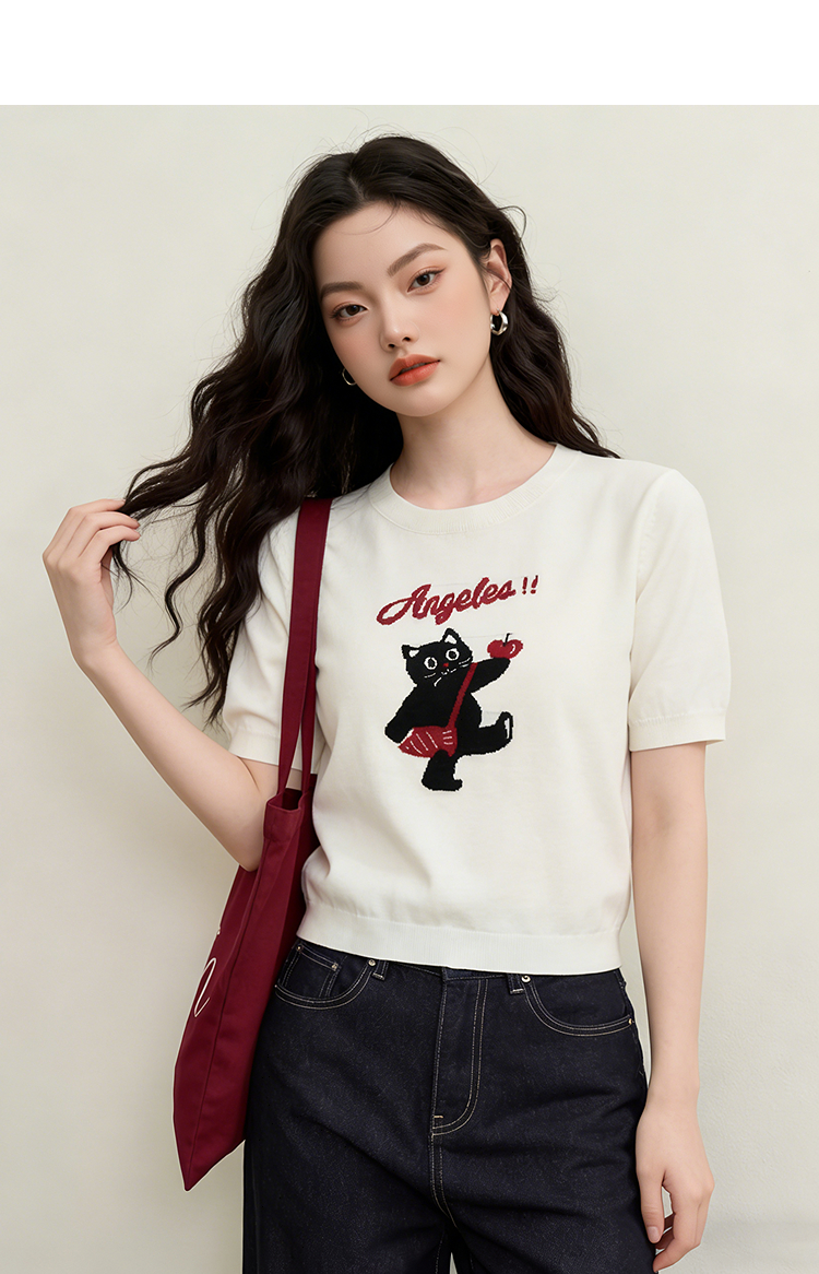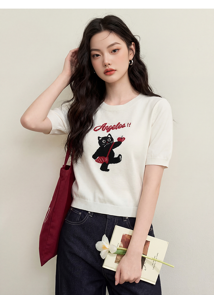 西遇可爱甜酷风2026新款春季卡通猫咪短袖毛衣圆领针织衫上衣T恤H0060218