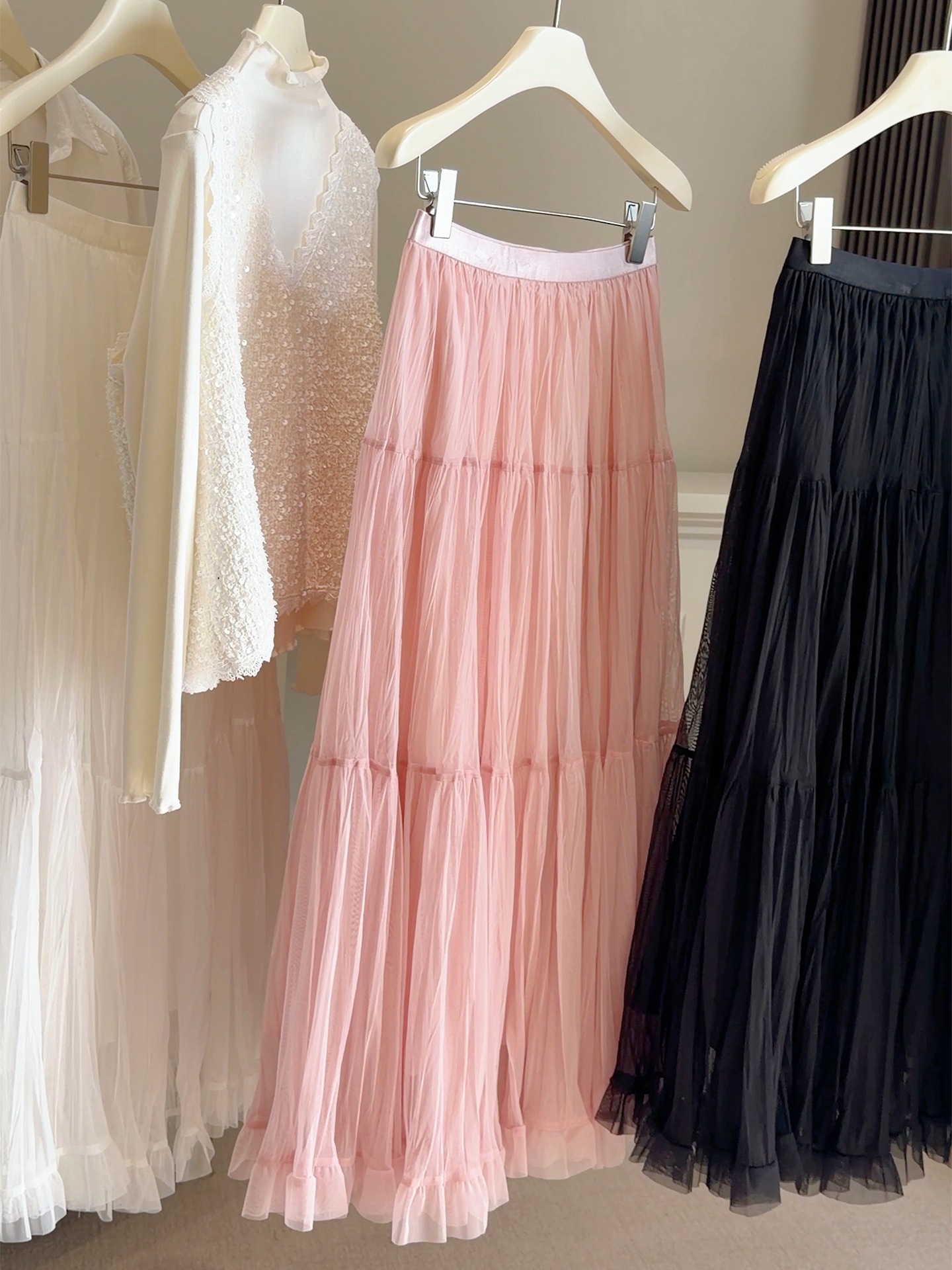 法式温柔风 中长款大摆伞裙 女春夏季新款高腰网纱A字裙 褶皱百褶半身裙