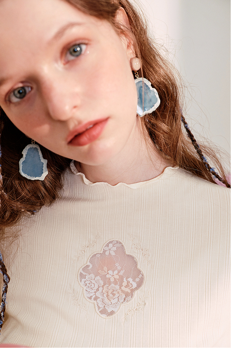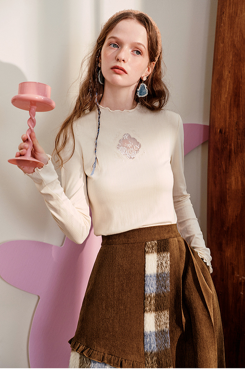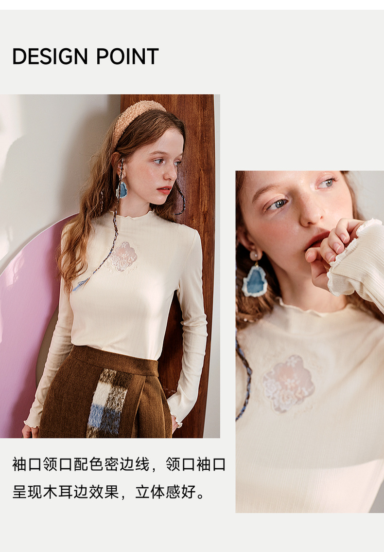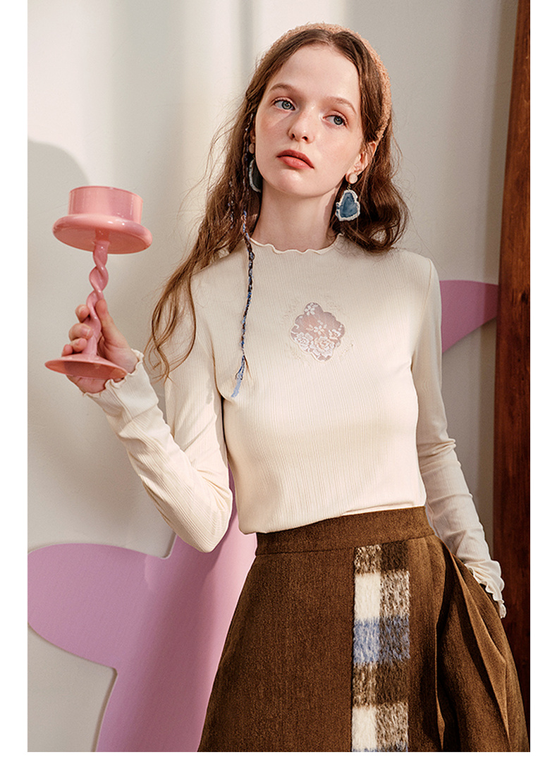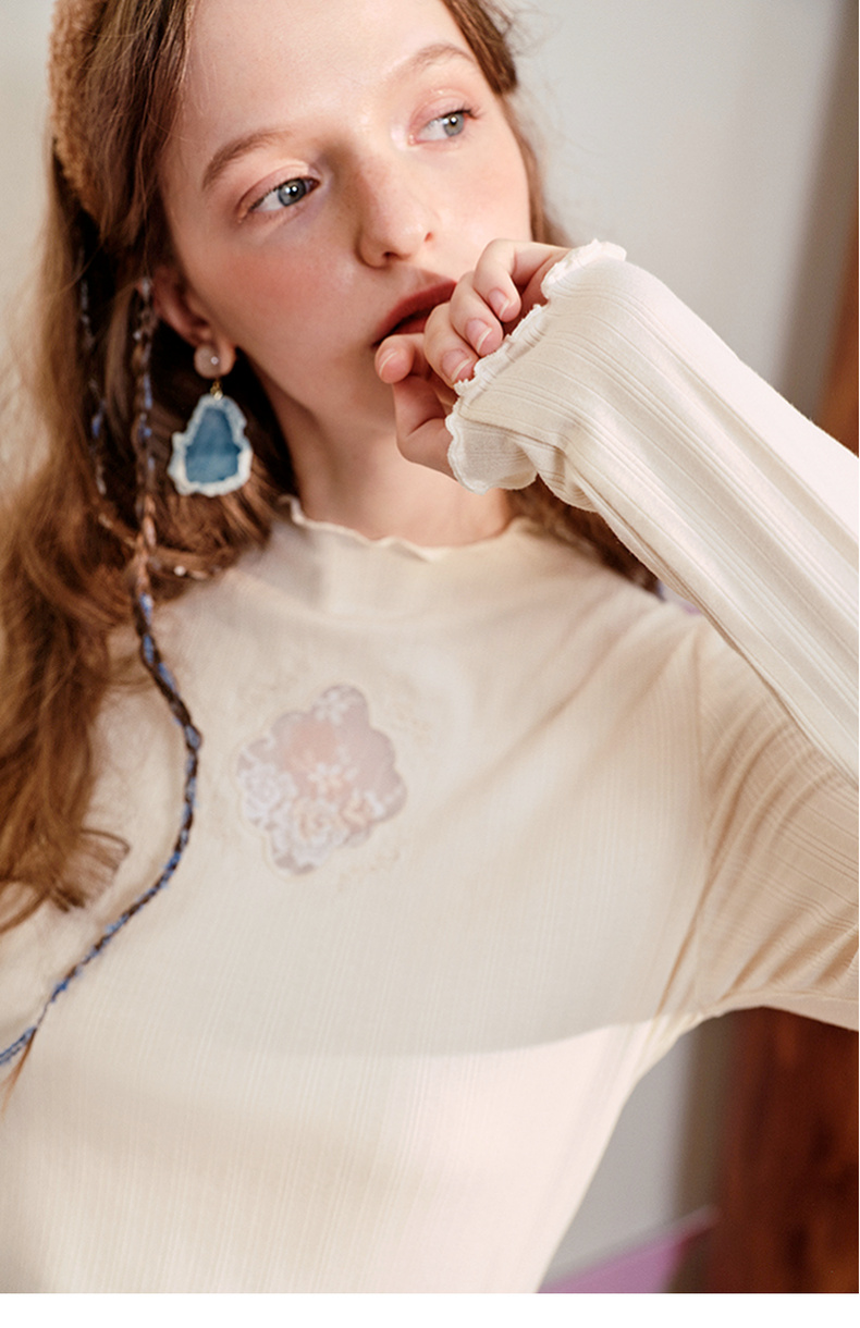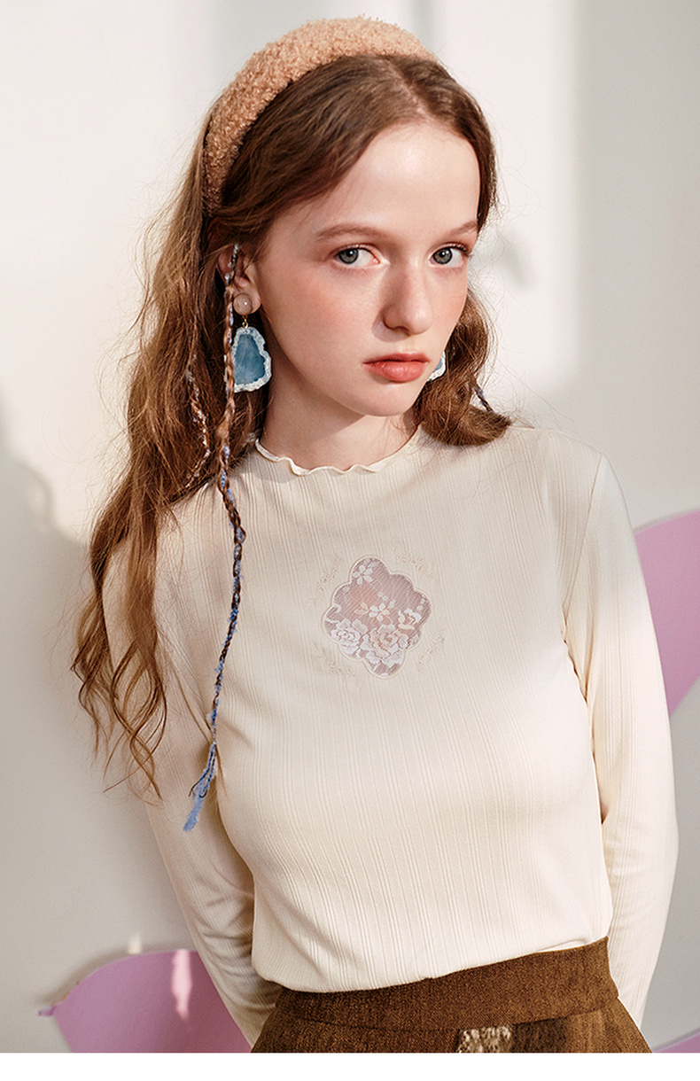两三事零点时分2024秋季新款小清新蕾丝拼接印花长袖打底衫女t恤