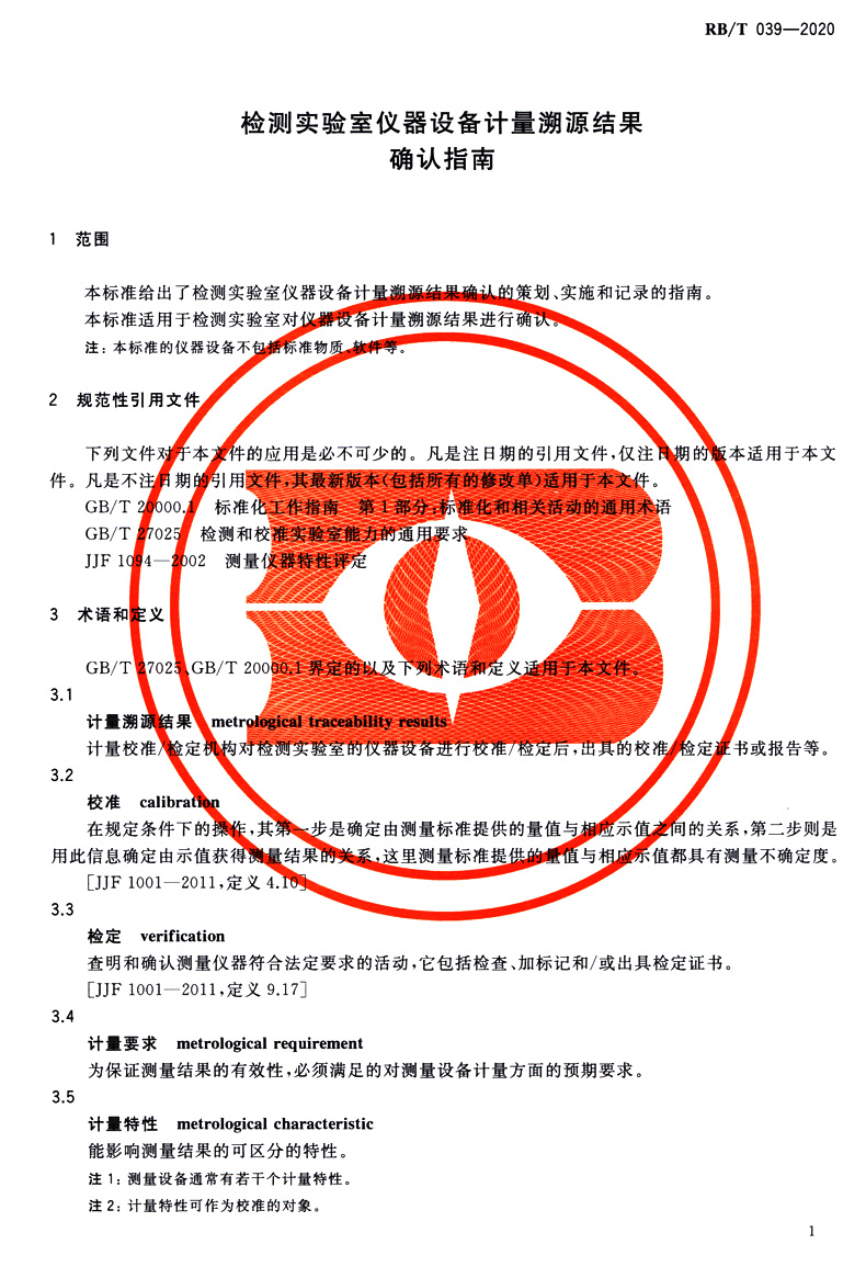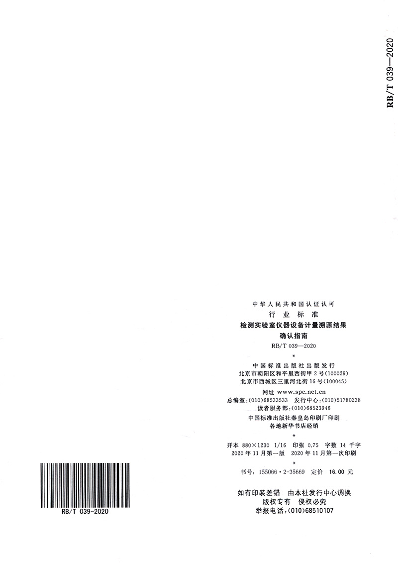 书名:速印不退 RB/T 039-2020检测实验室仪器设备计量溯源结果确认指南