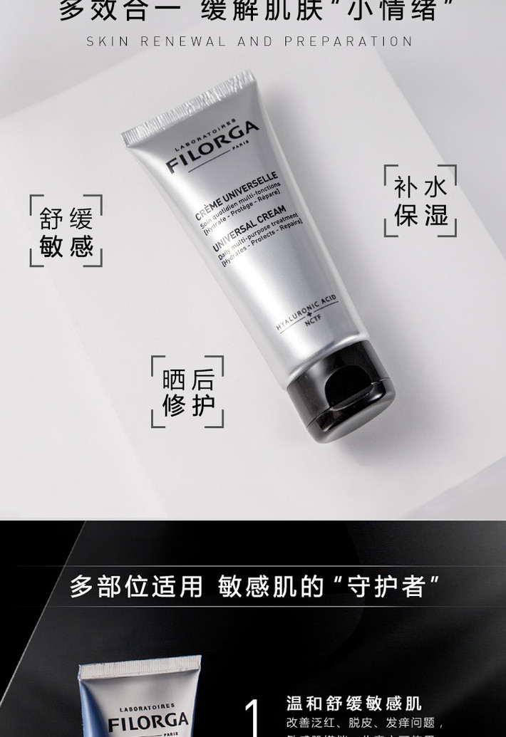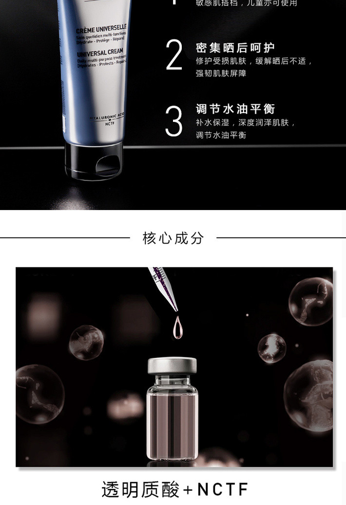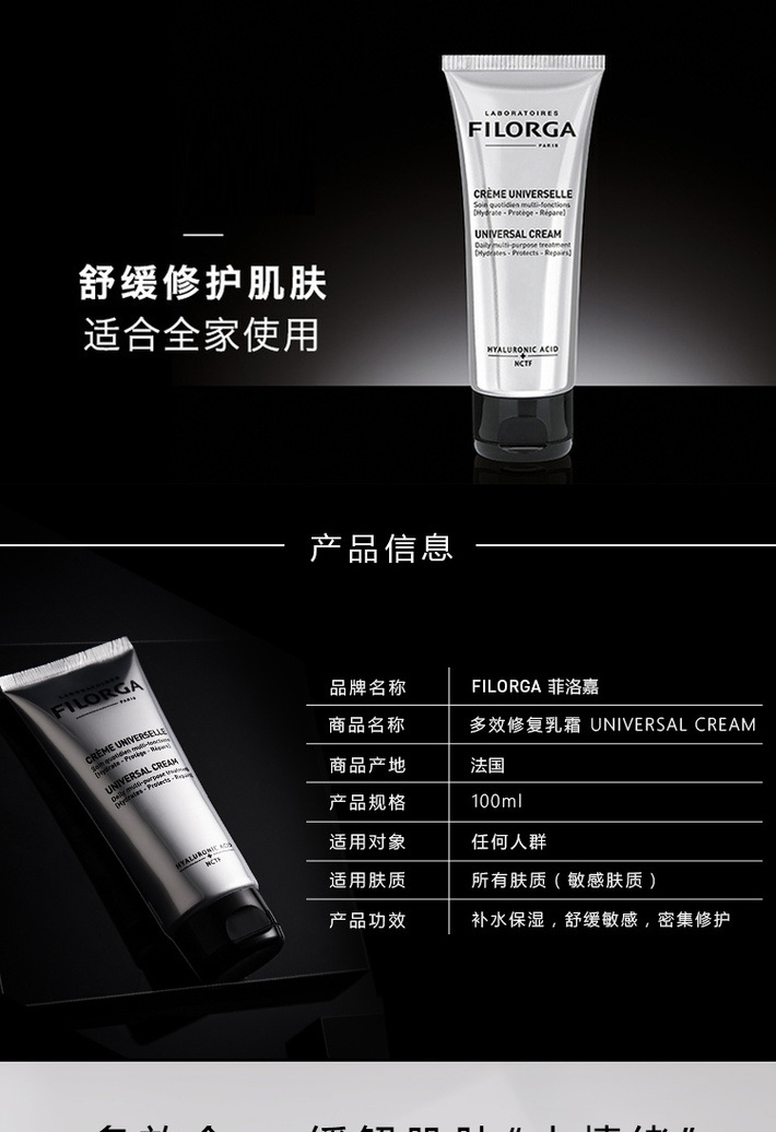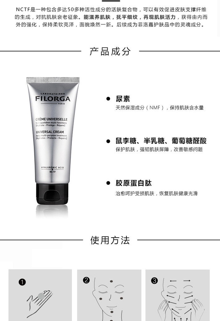 含丰富玻尿酸,沿用独特NCTF技术,具有保湿,防护,修复等三重功效。能够轻柔补水,霜质柔润不油腻,