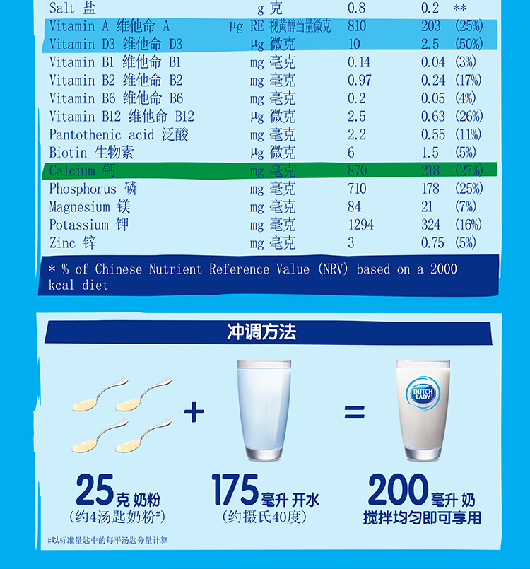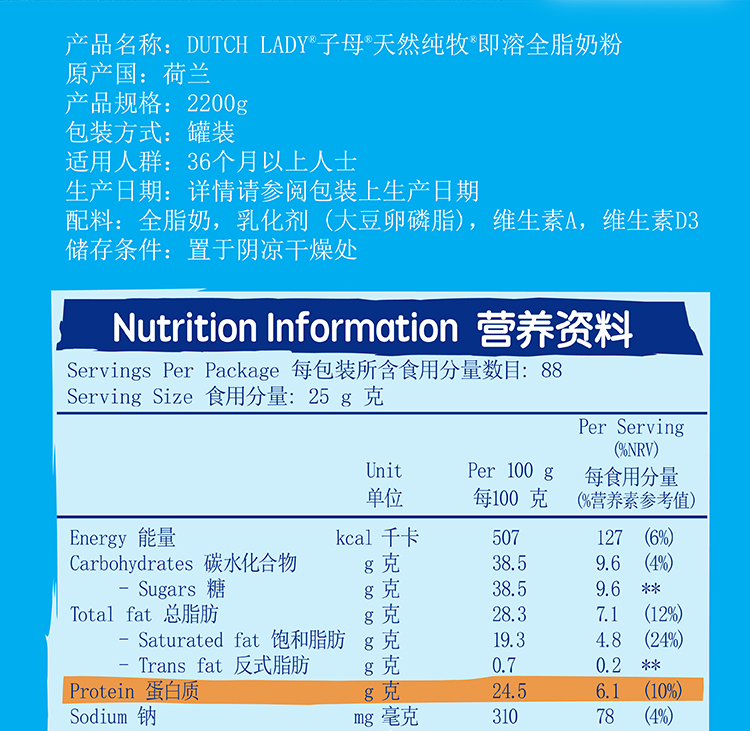 子母Dutch Lady 全脂奶粉 荷兰蓝胖子高钙营养儿童成人奶粉 2200g