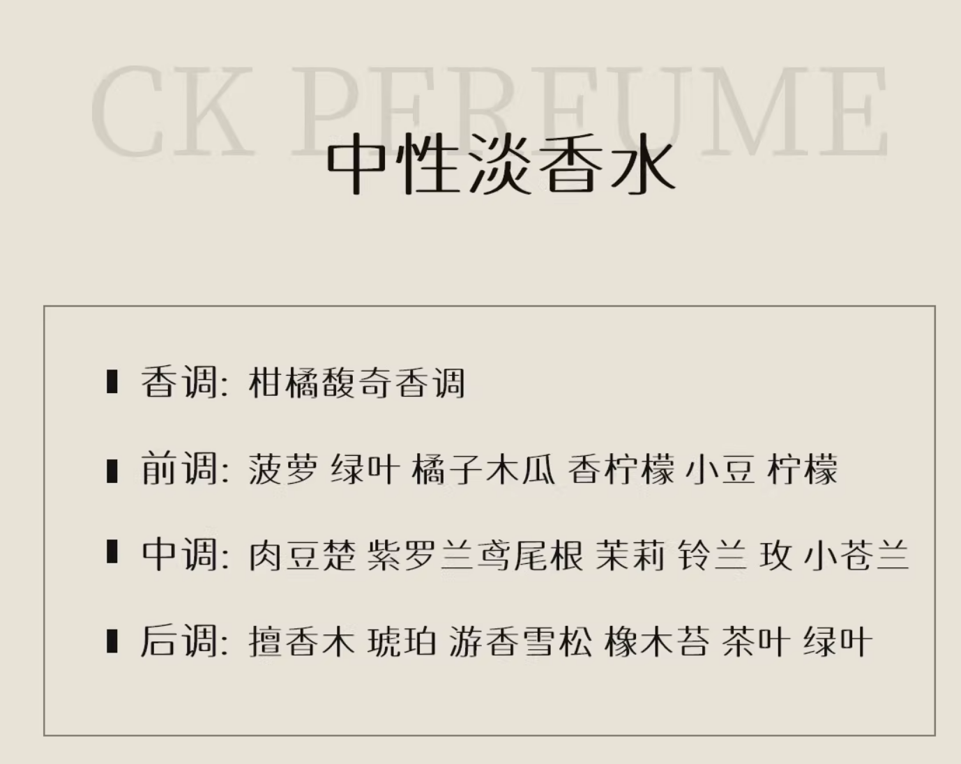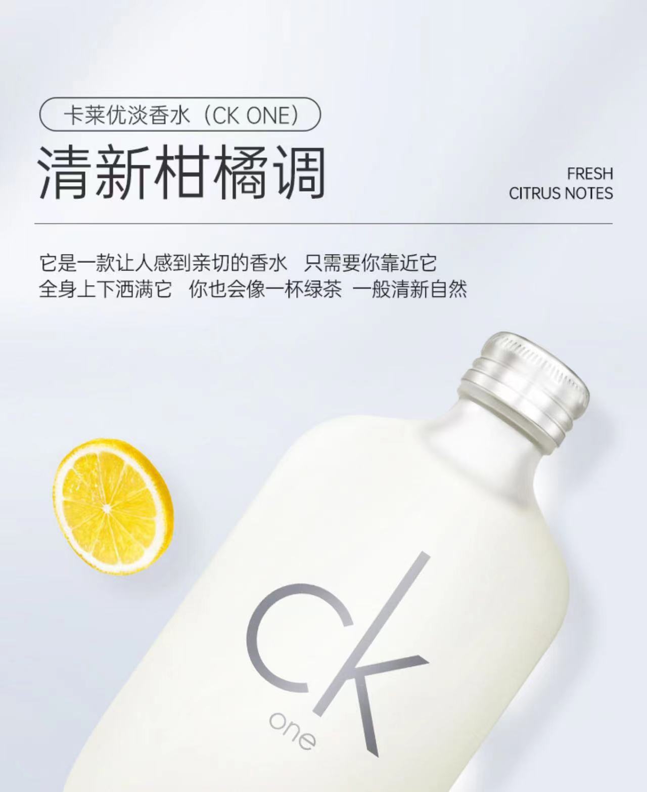 ck one系列作为一款中性香调,它鼓励人们冲破性别界限,大胆接受并骄傲宣誓每一个幻变真我,它是一款香味独特的清新淡香,莞美融合了柑橘与树木的元素,用柑橘的清新带动沉稳的木调,整体感觉是轻松愉悦令人心旷神怡的一款香!前调是清爽的柑橘,中调是微甜的橙花味儿,后调是悠远的木香,仿佛是春日的海边,微风清甜拂面,遇见白衣少年的纯粹干净又美好的心动感!