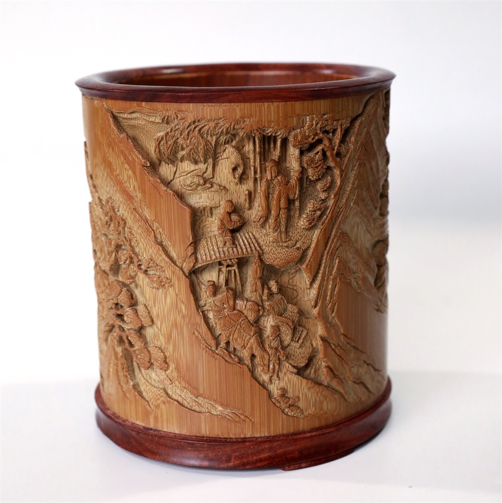 笔筒竹壁饱满宽厚,一器数法兼备,以深浮雕、浅浮雕配合阴刻技法,在有限的空间中营造出文人雅集山野之趣。崇山峻岭,古松苍翠,绿竹猗猗,岩壑姿奇,烟霞缥缈,有若仙境。文人雅士聚二攒三,畅叙幽情,令人神往。人物布陈疏密有致,惟妙惟肖。作品将高逸之士以概念化的形象置于山水林泉之间,象征士大夫归隐后的生活,同时抒发他们希冀纵情于物外的情致。同时表现出了极高的艺术功力。