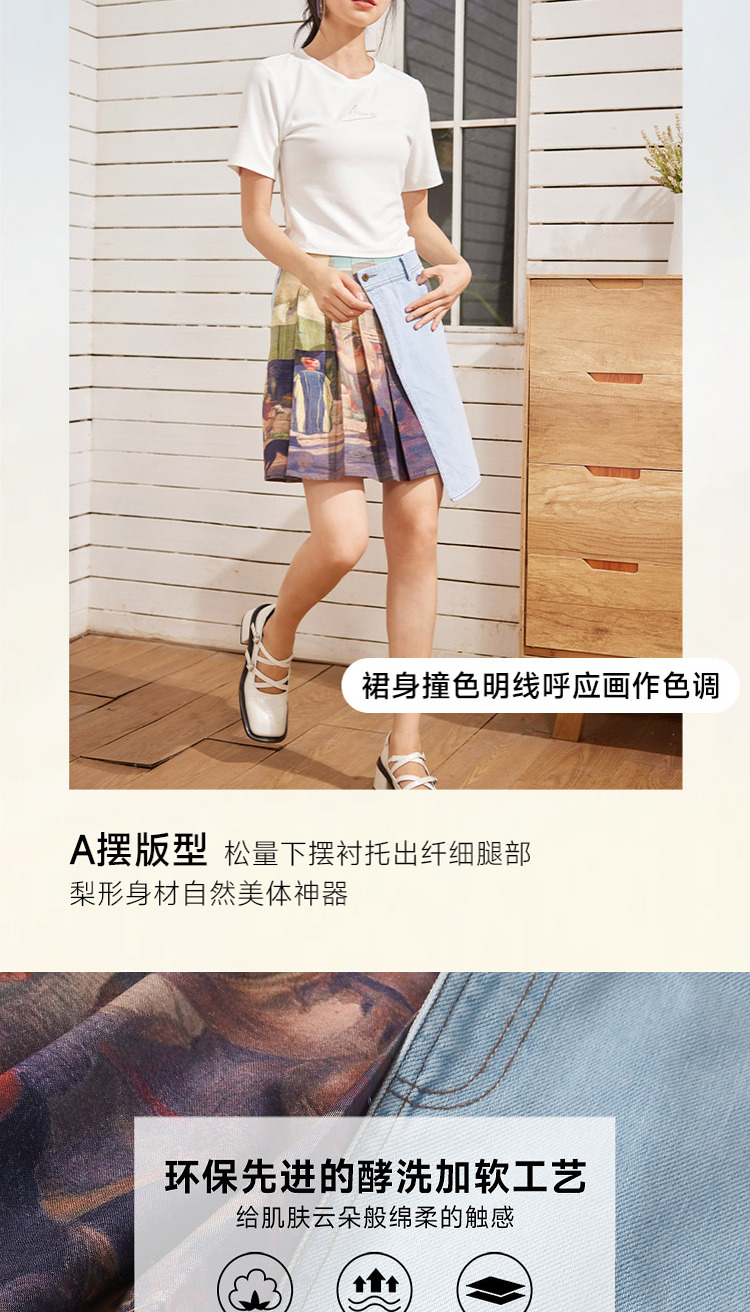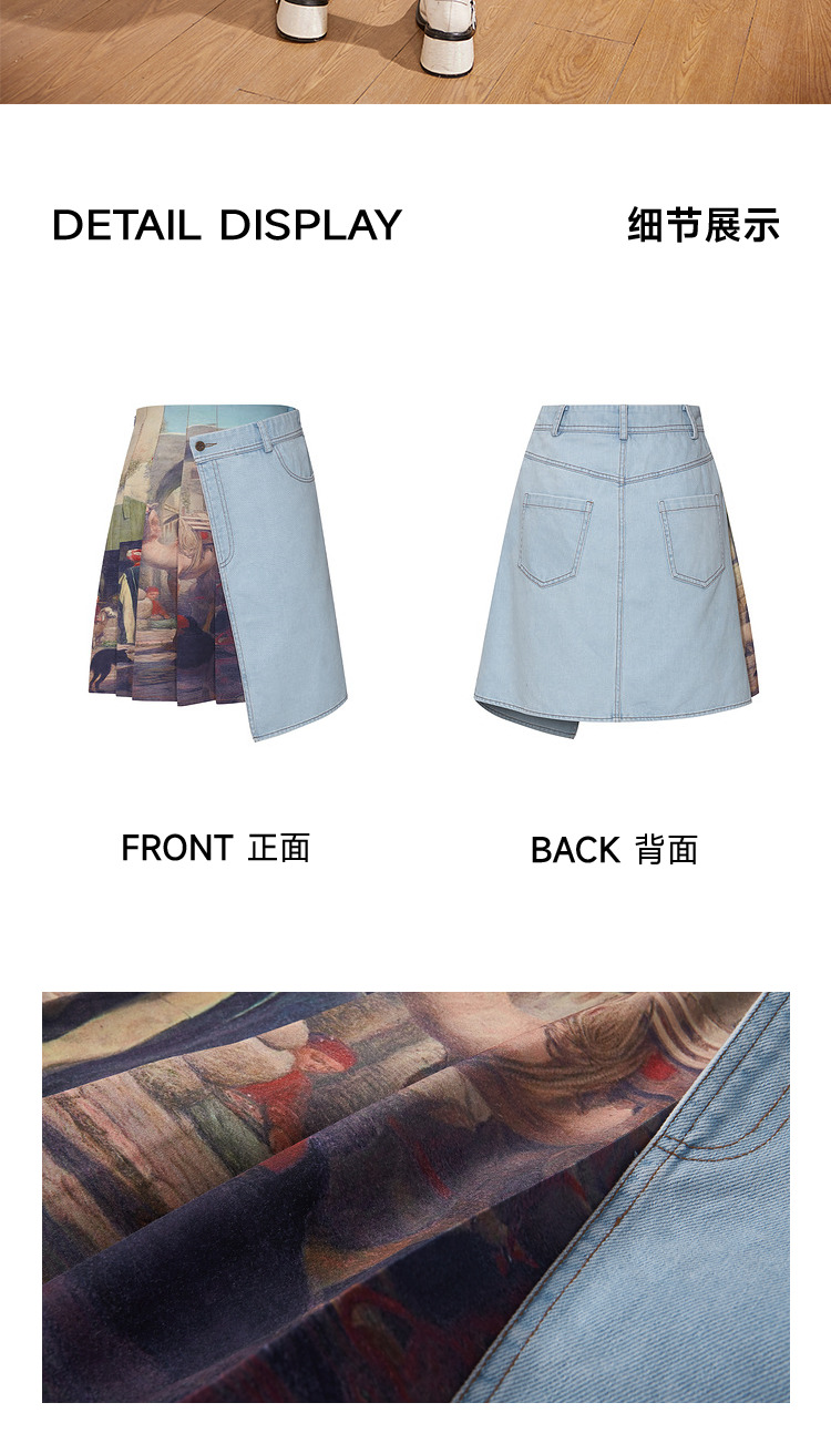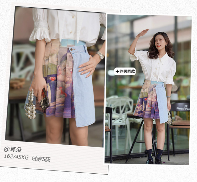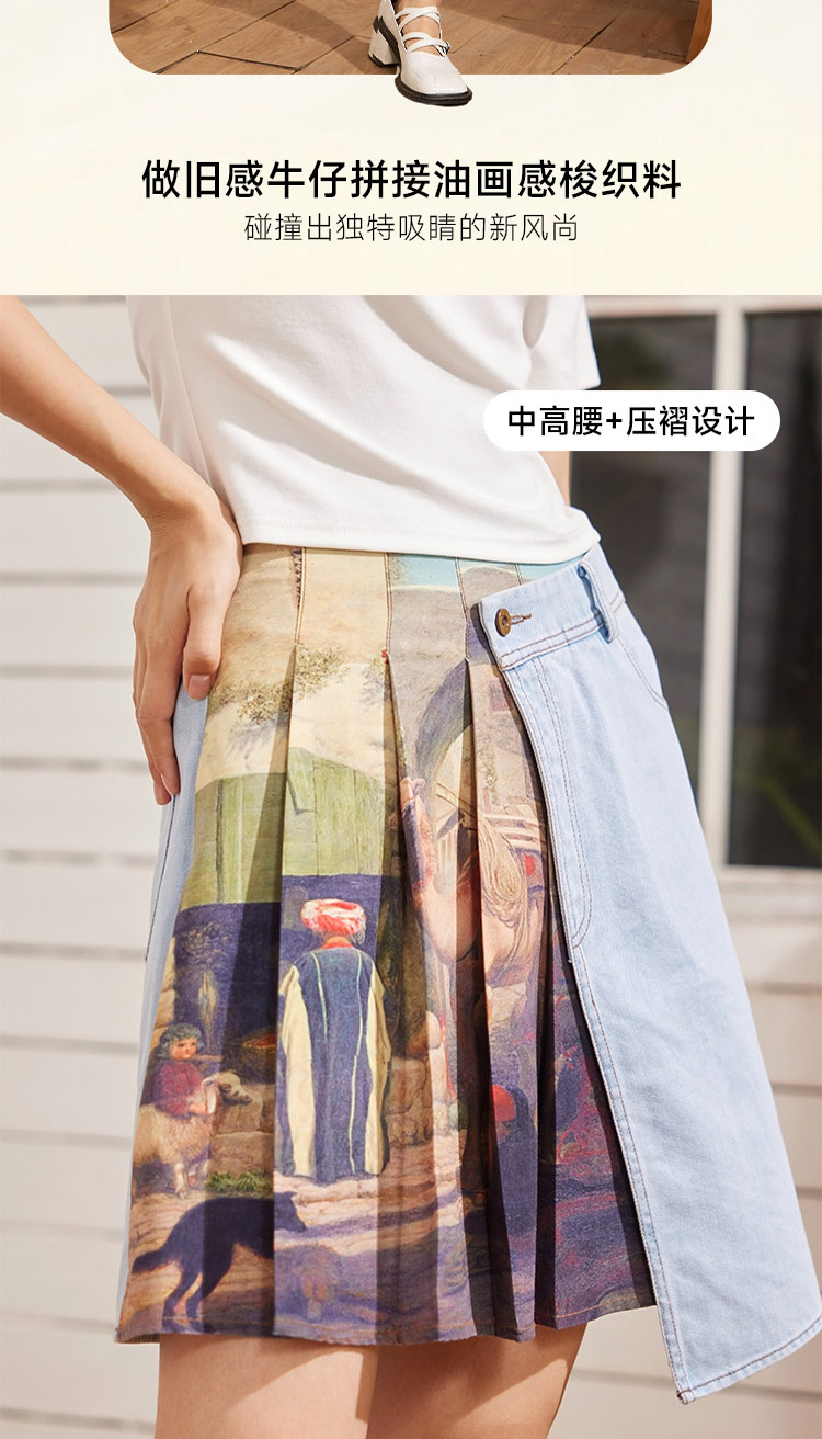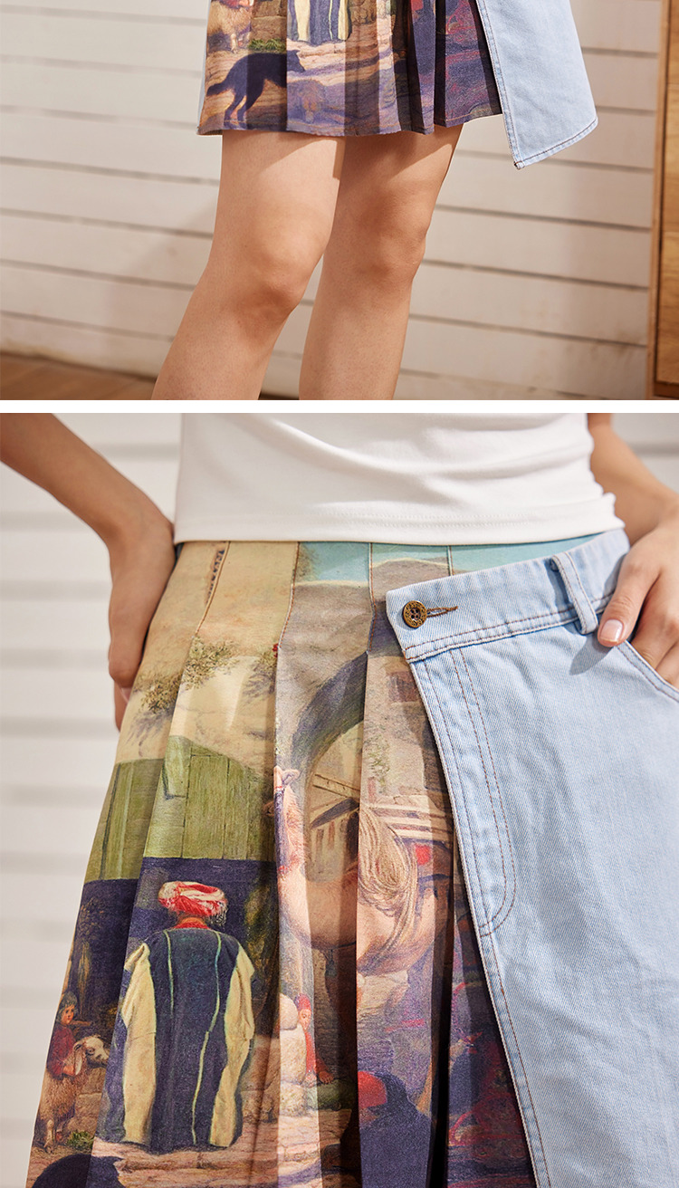 两三事华丽流派夏季复古压褶油画印花拼接牛仔半身裙