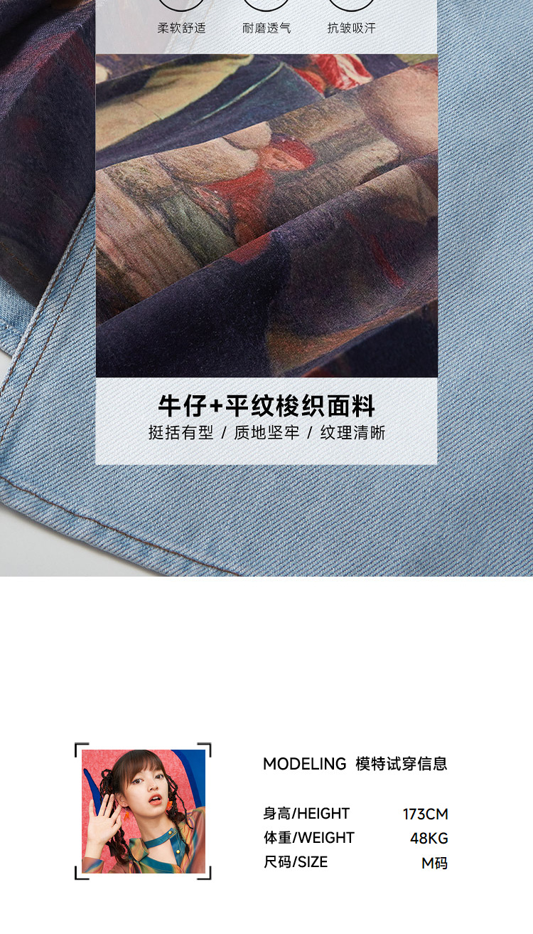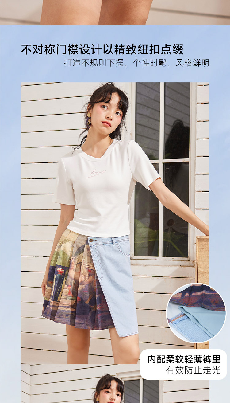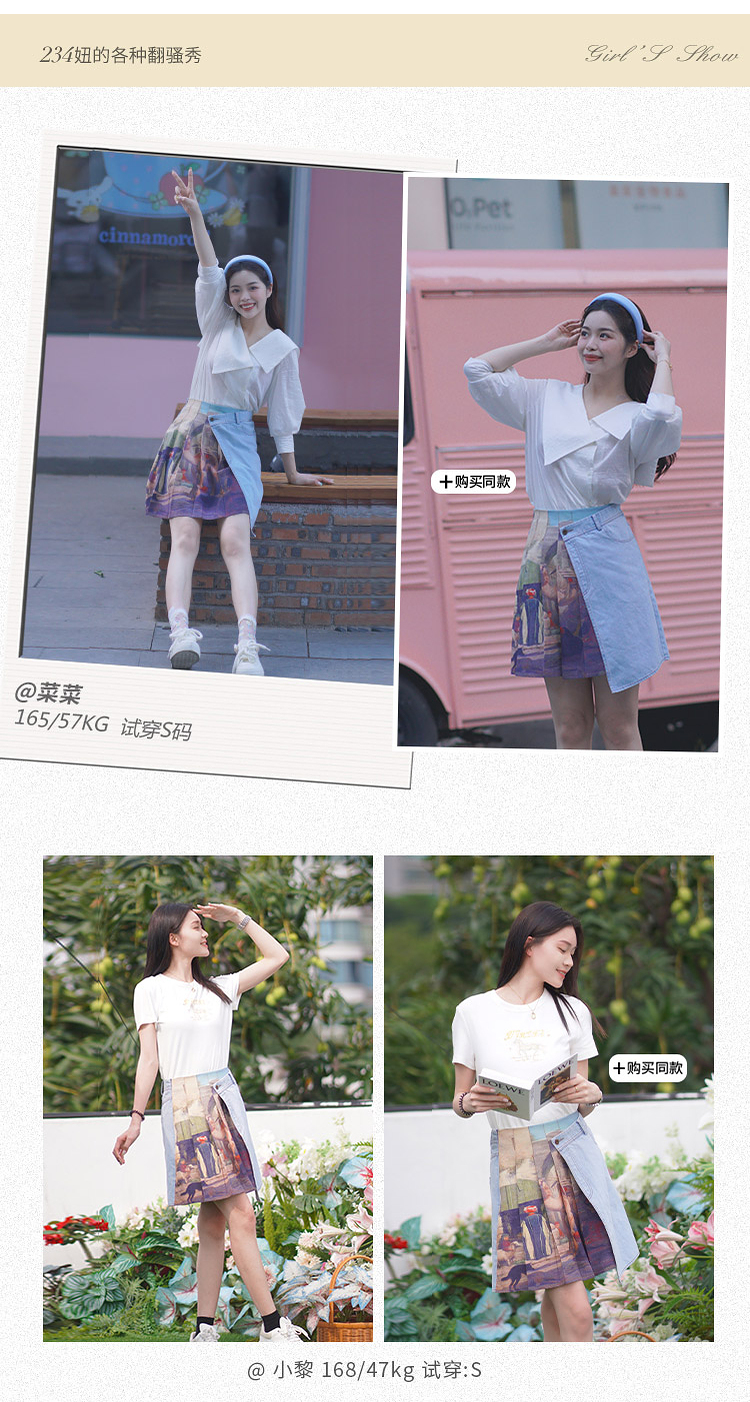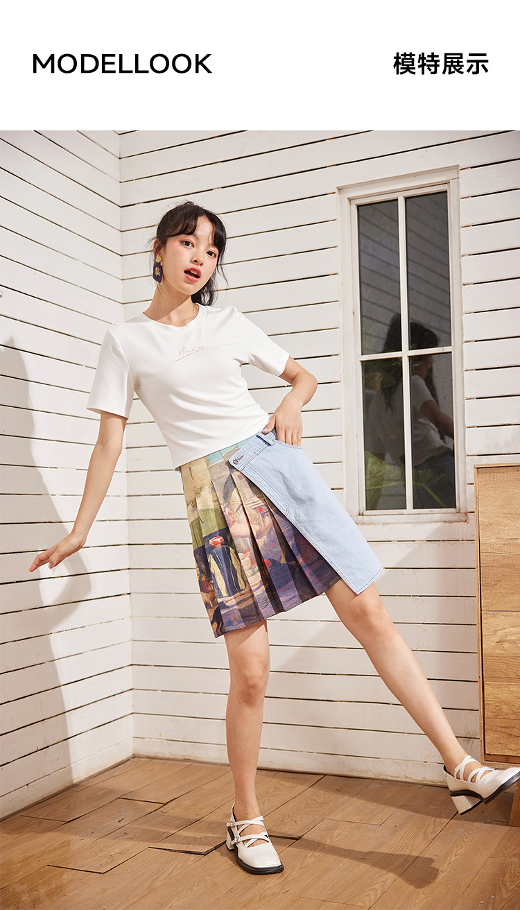两三事华丽流派夏季复古压褶油画印花拼接牛仔半身裙