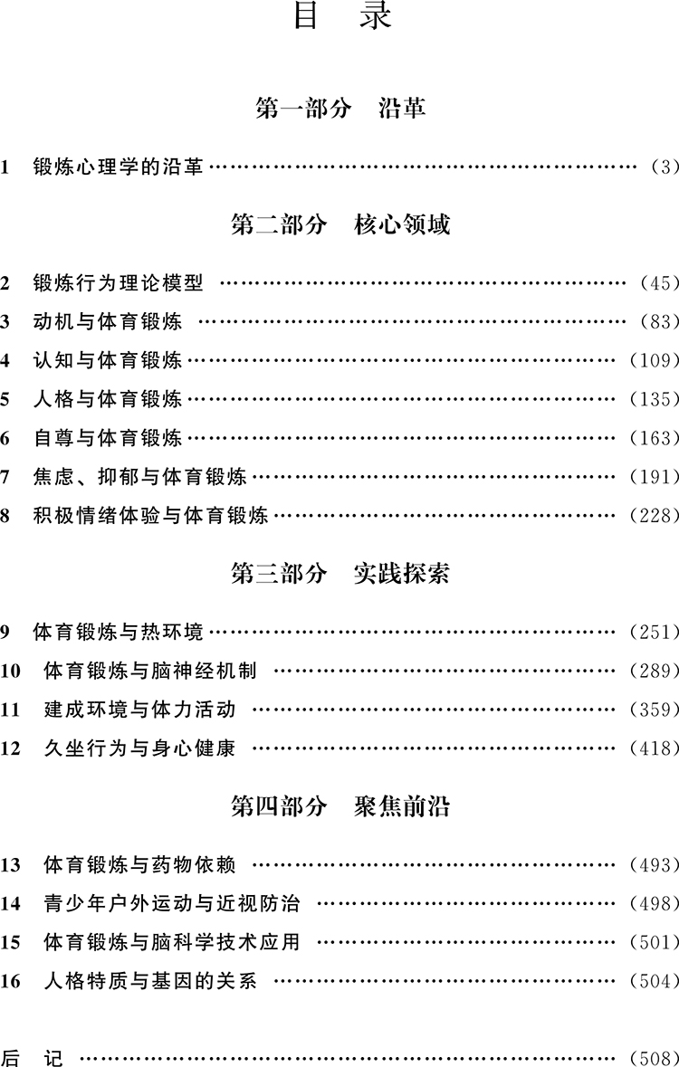 本书基于华东师范大学锻炼心理学研究团队多年研究成果积淀,共包含四部分:沿革、核心领域、实践探索、聚焦前沿。全书以梳理东西方锻炼心理学发展脉络为逻辑起点,在呈现锻炼心理学起源、发展及主要研究领域的基础上,从当代锻炼心理学所关注的核心领域入手,全面呈现当代锻炼心理学主要研究成果与热点问题,从而为深入把握当代锻炼心理学学科定位及其发展过程中的内在逻辑提供学术依据与参考范本,为锻炼心理学在我国的繁荣发展提供理论架构与实践指导,也为全民健身与全民健康深度融合提供基于锻炼心理的决策支撑。