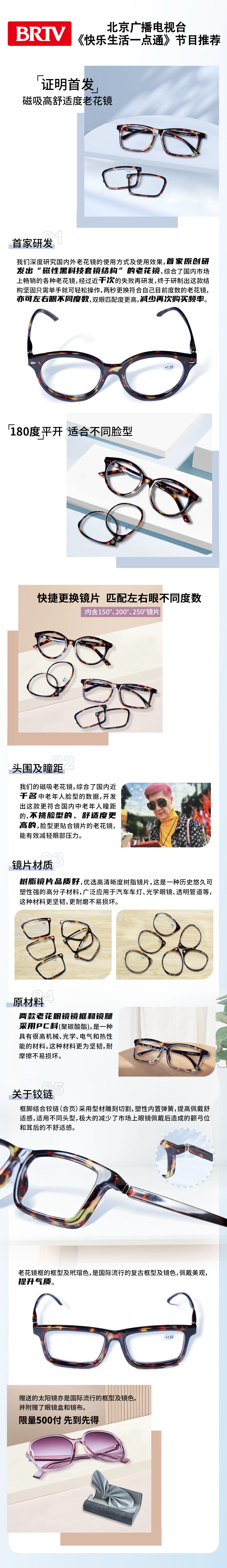 诗维达换片老花镜 1套*2副,每副老花镜含3套镜片(150度、200度、250度),赠:太阳镜*1副,眼镜盒*1个,眼镜布*1块
