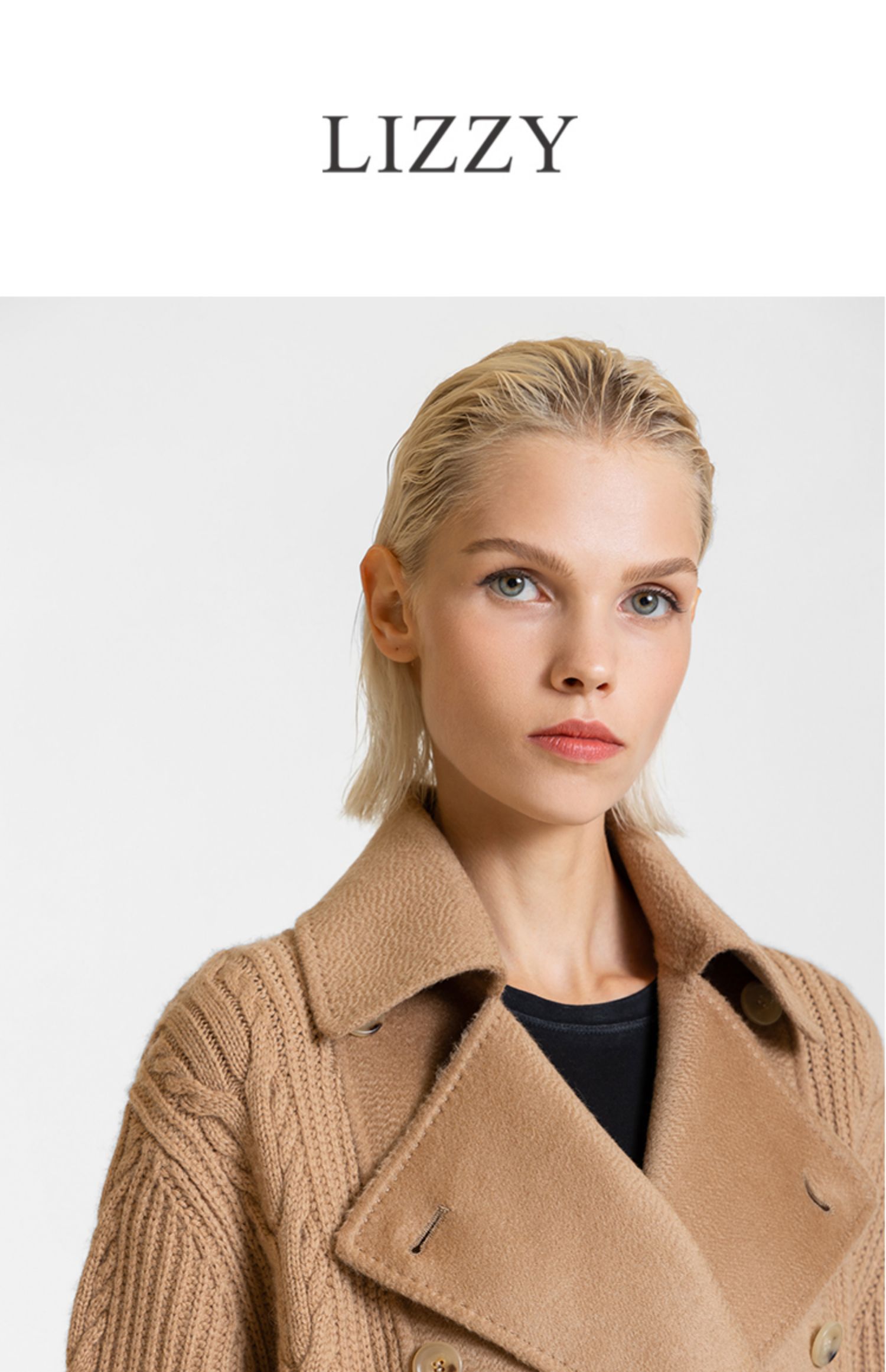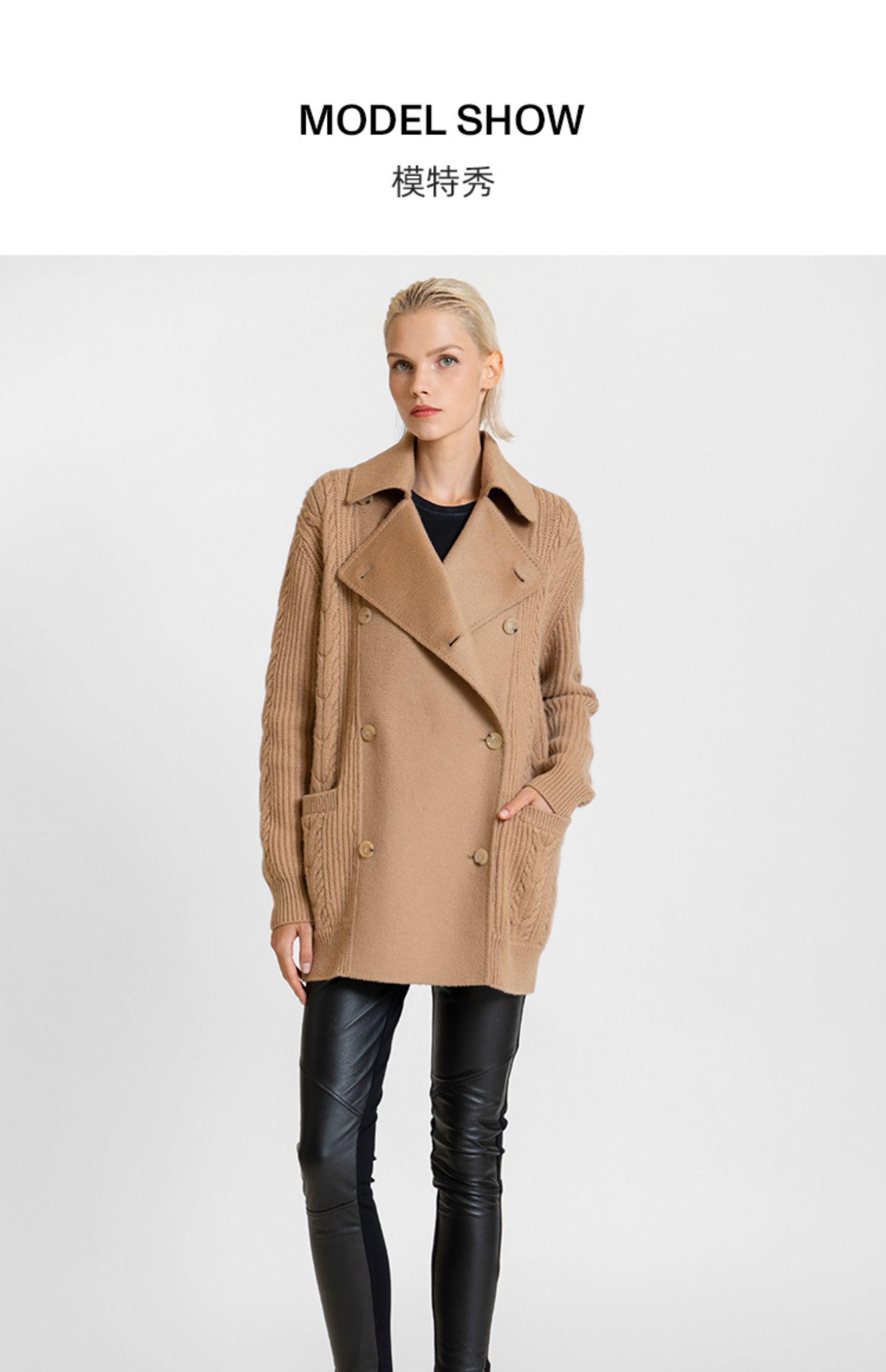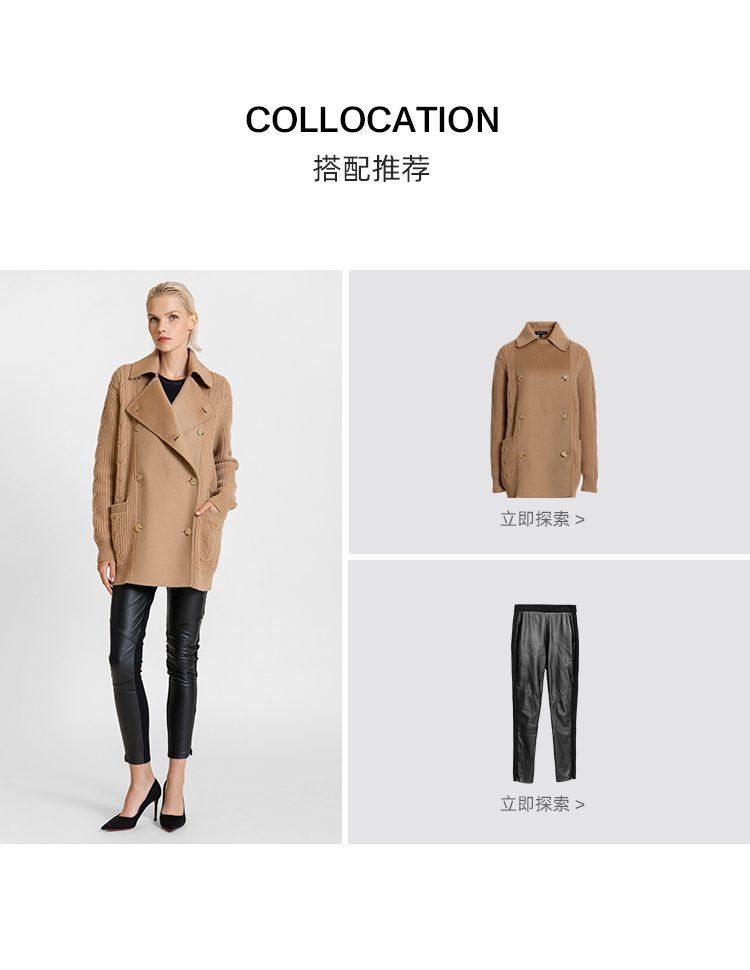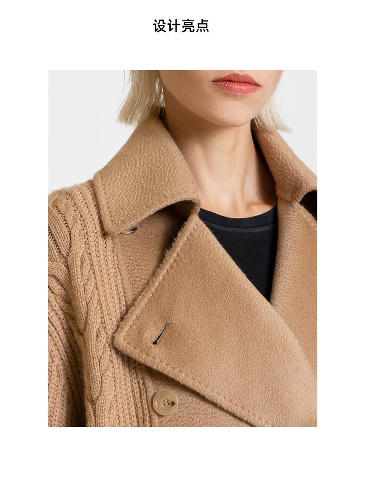 LIZZY 休闲山羊绒美丽诺绵羊毛混纺拼接双排扣短外套7667