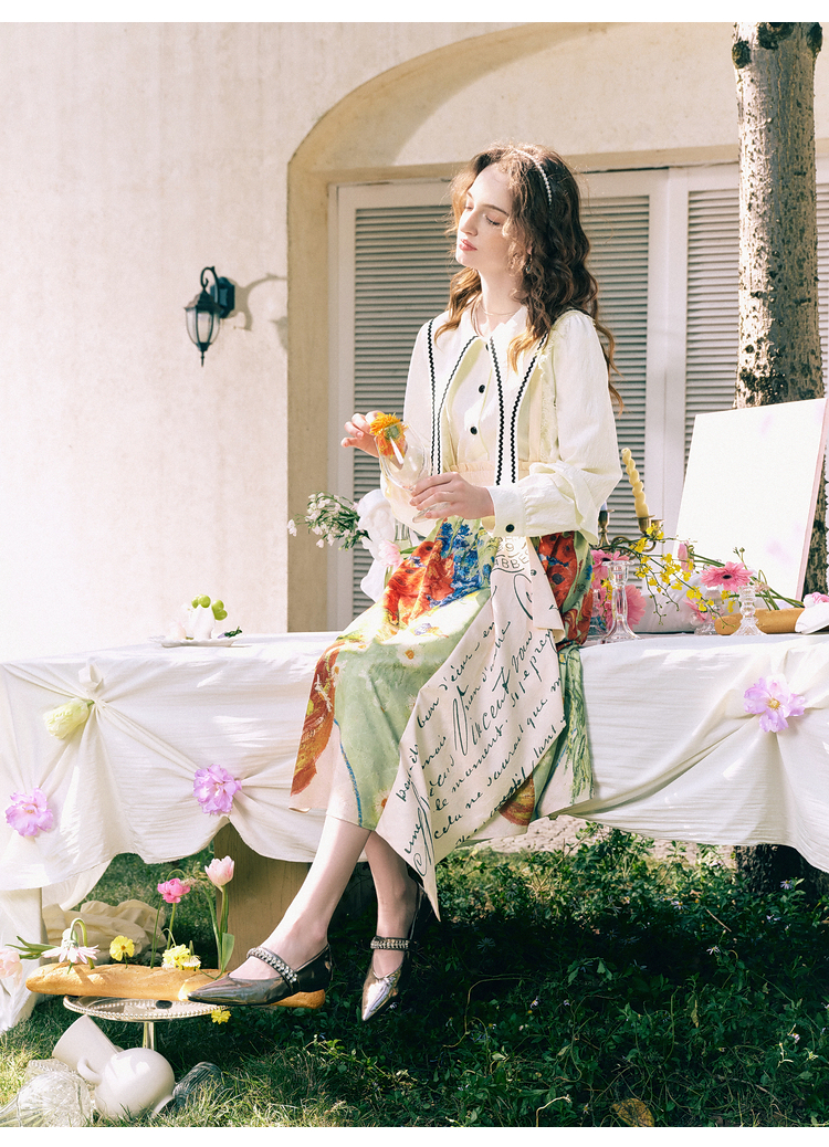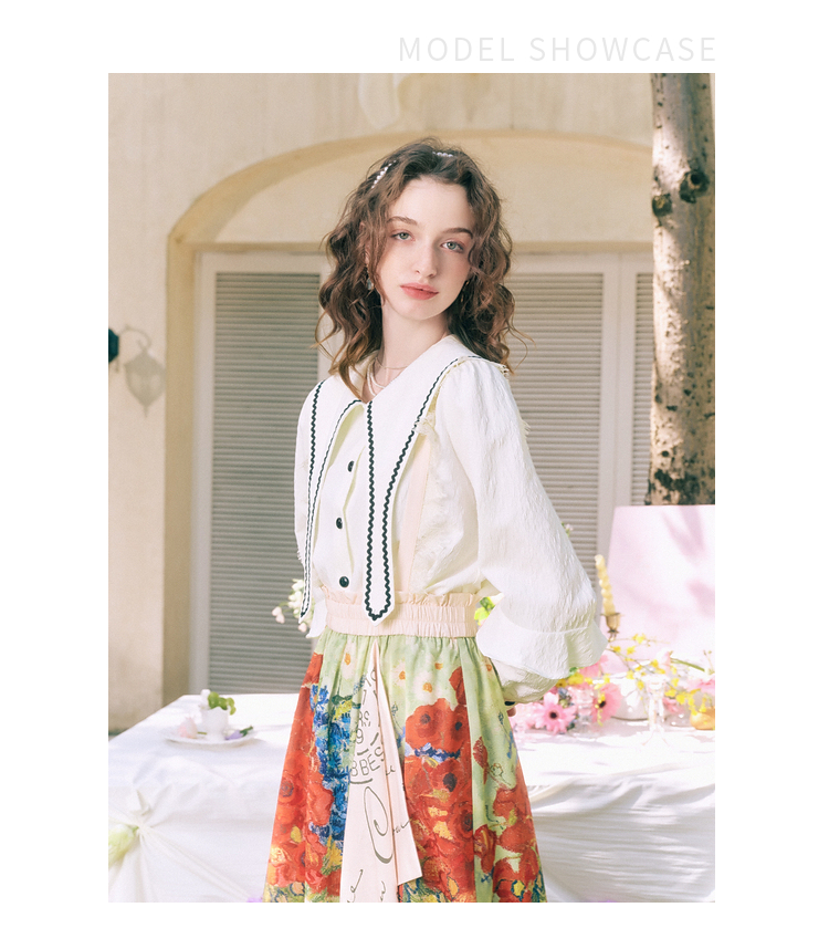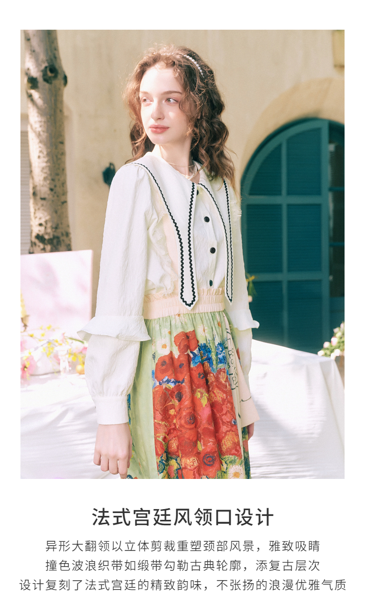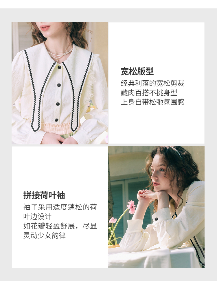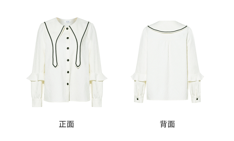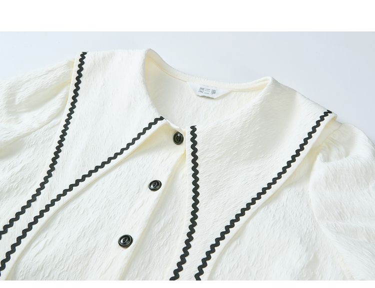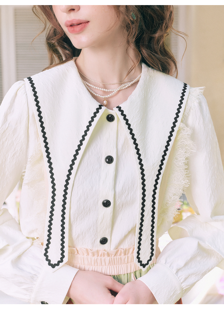 两三事 浮云月下 2026春季新款小清新波浪织带边大翻领灯笼袖衬衫