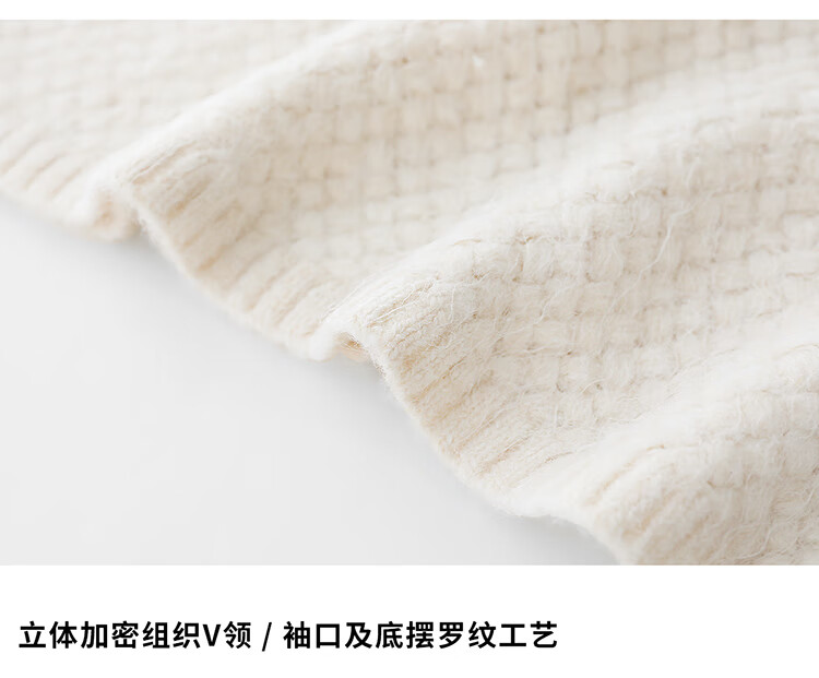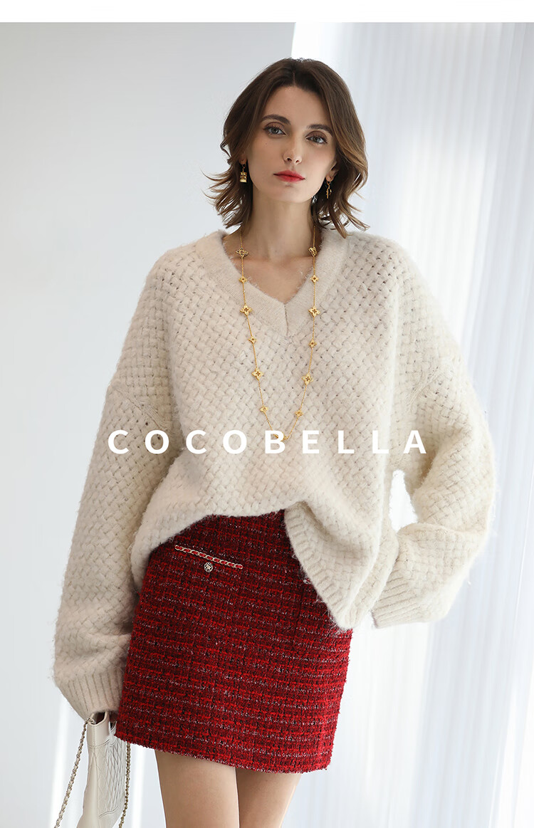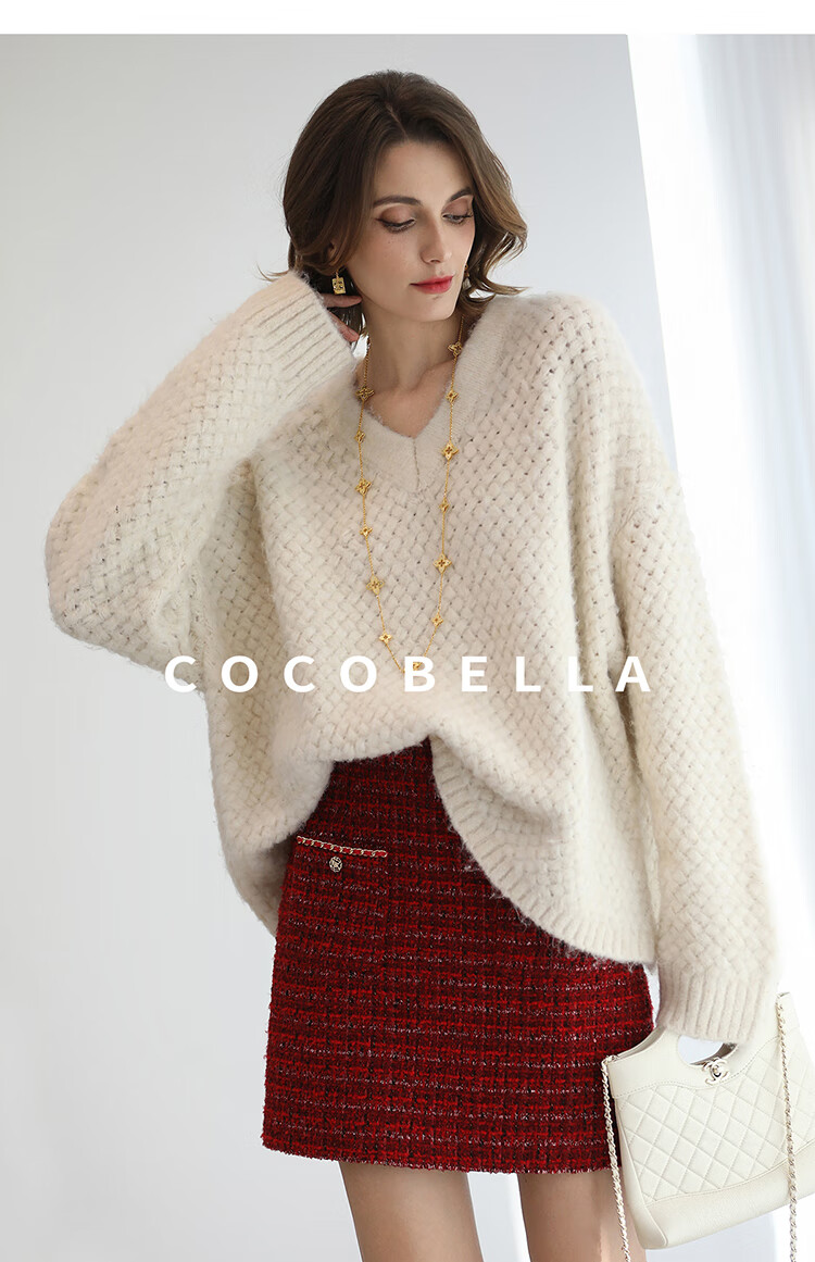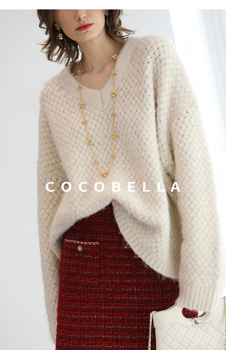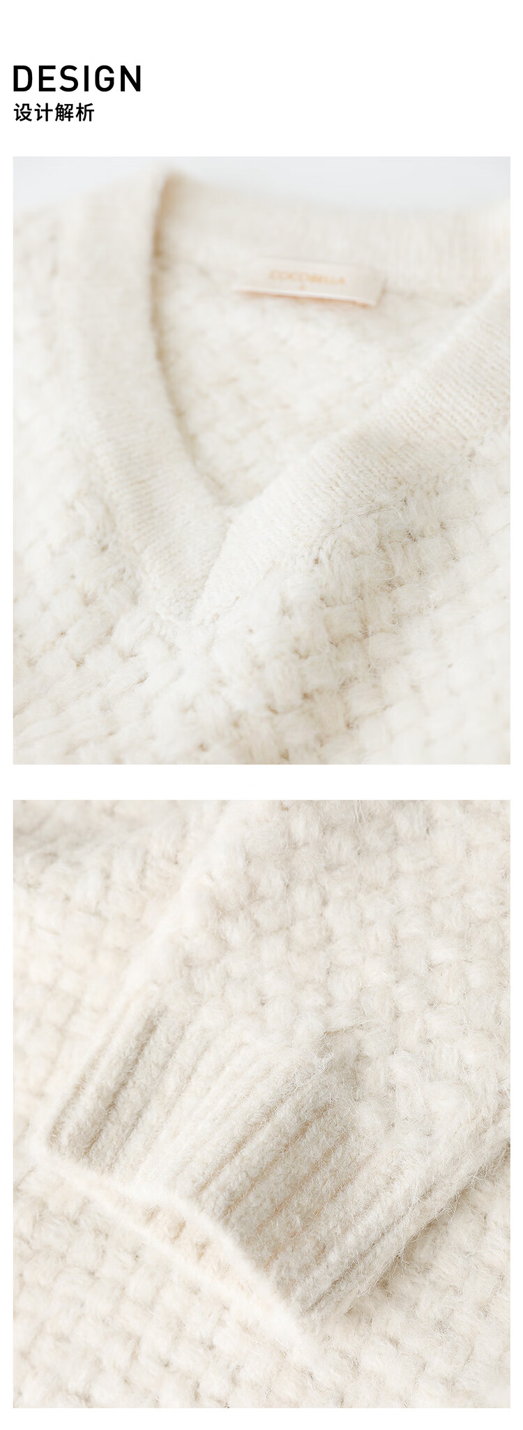 COCOBELLA设计感编织风白色V领毛衣女25秋冬气质针织衫MZ3248