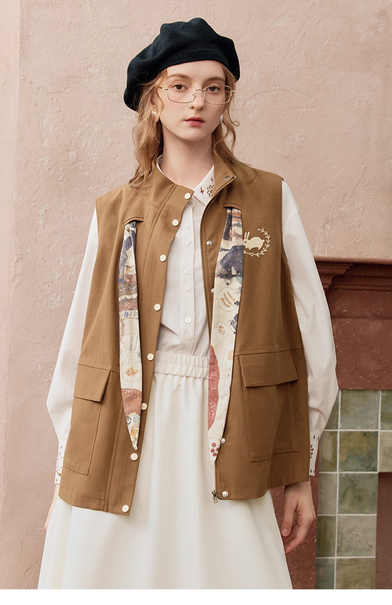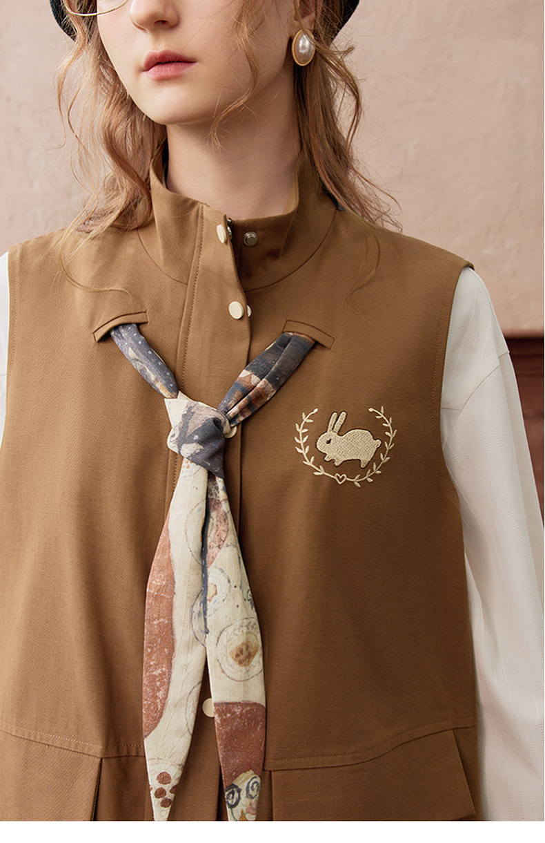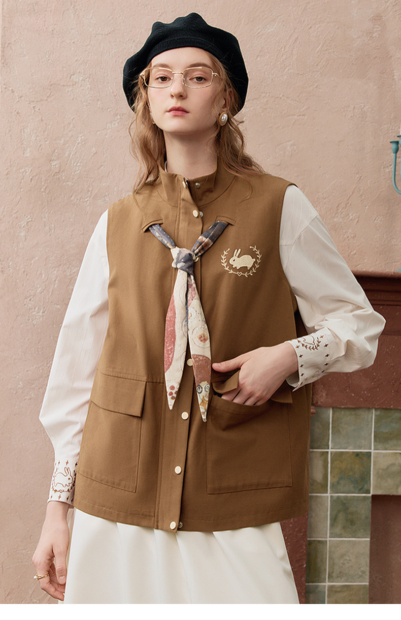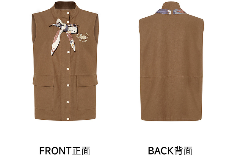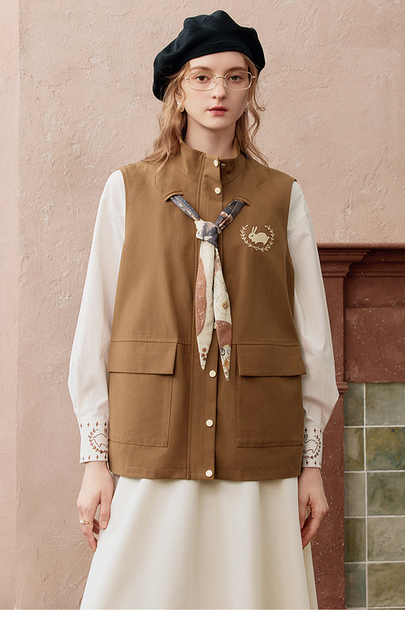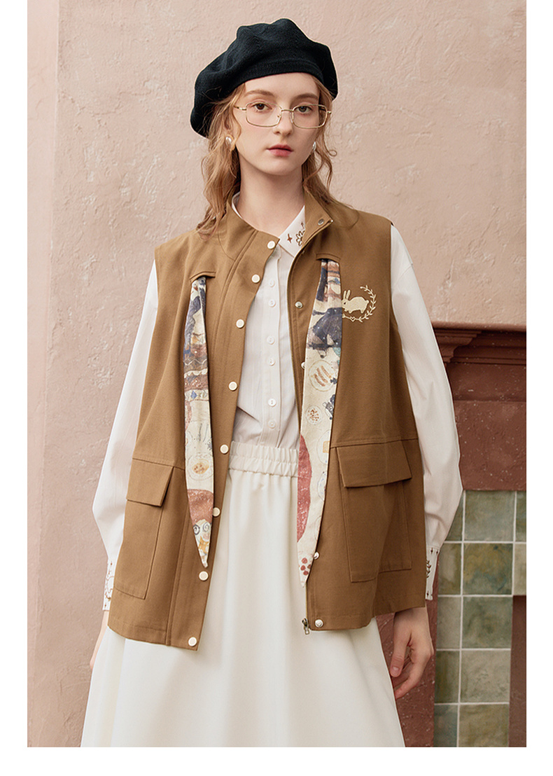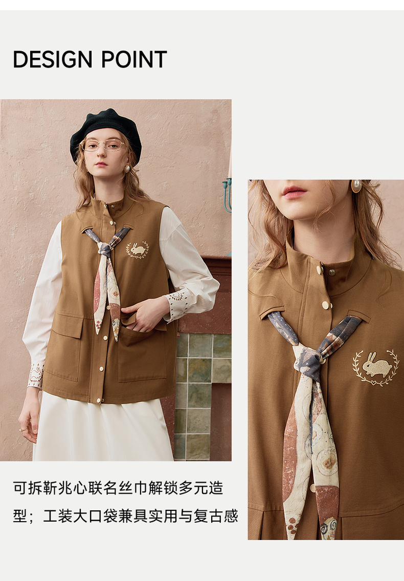 两三事秋帧漫游2025秋季新款可拆印花丝巾工装马甲外套女宽松马夹