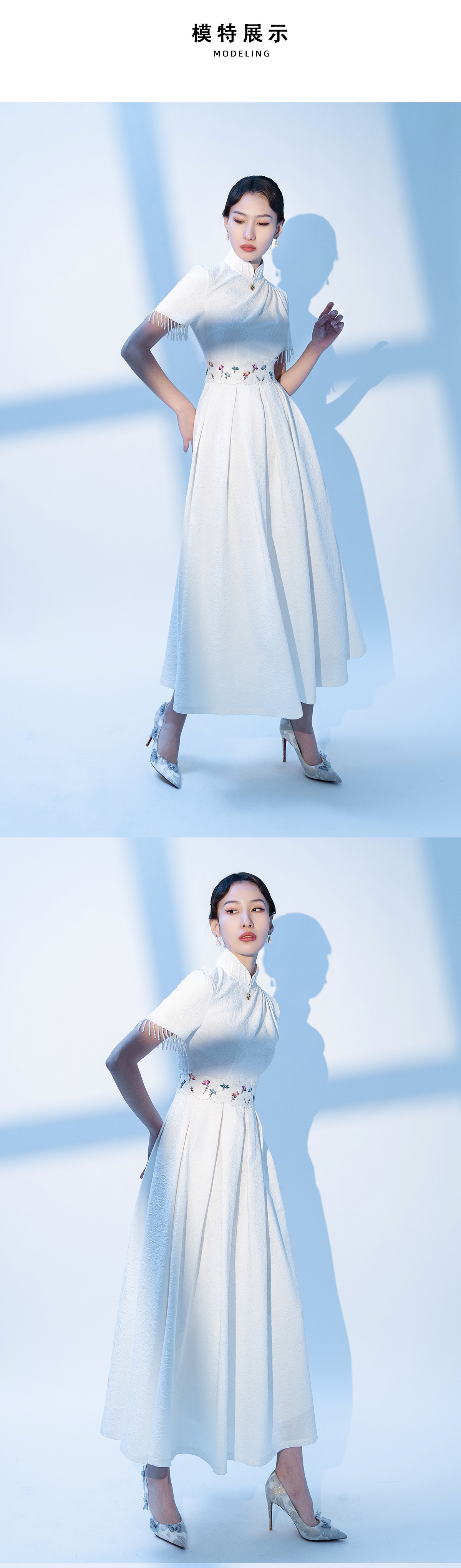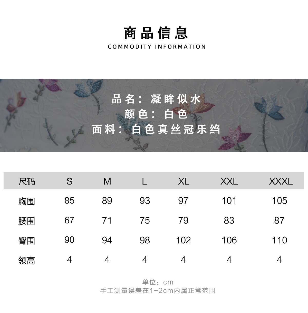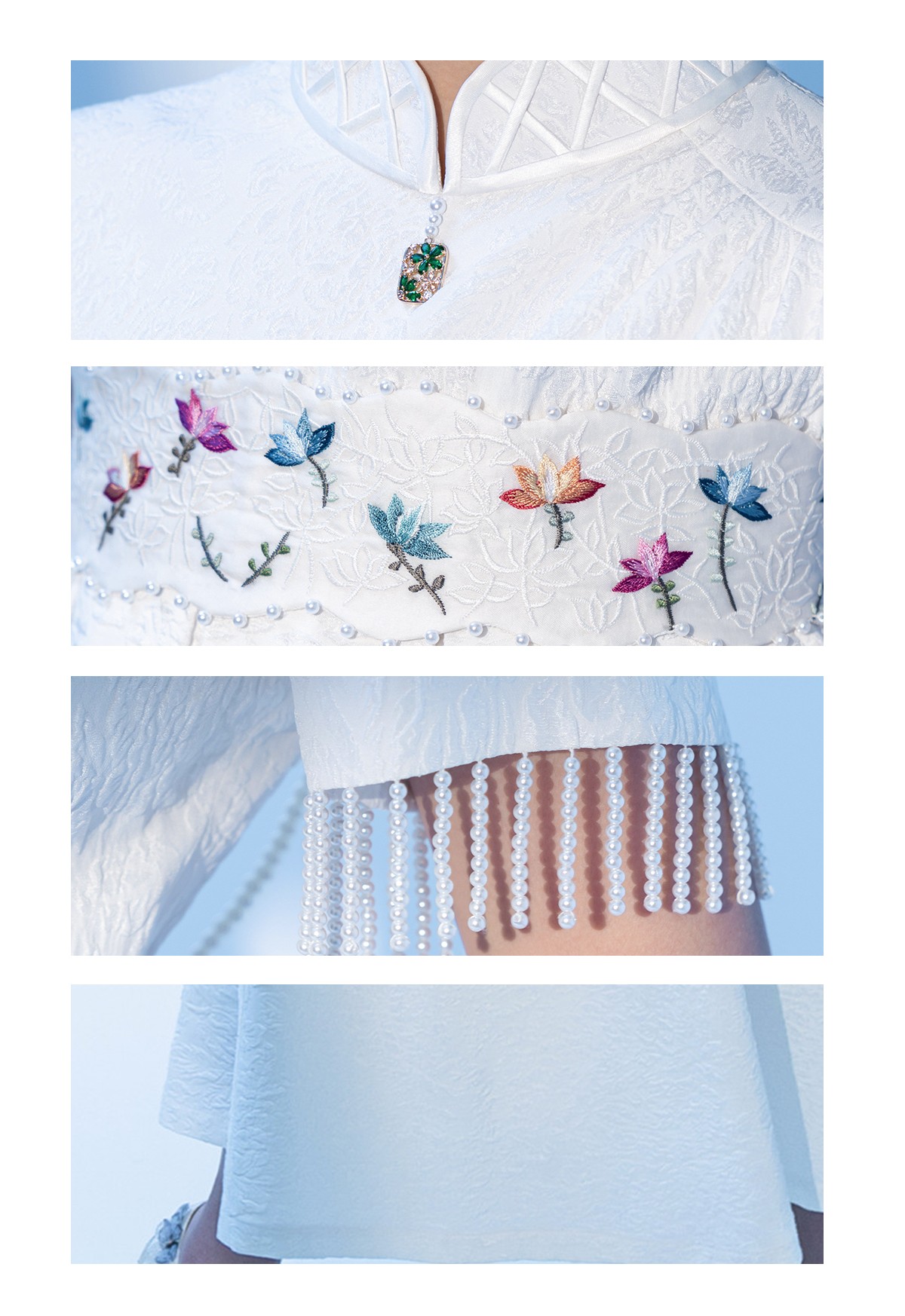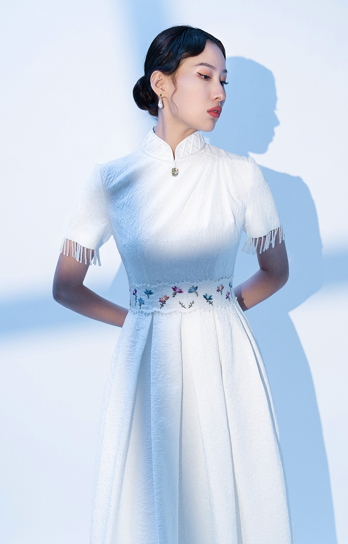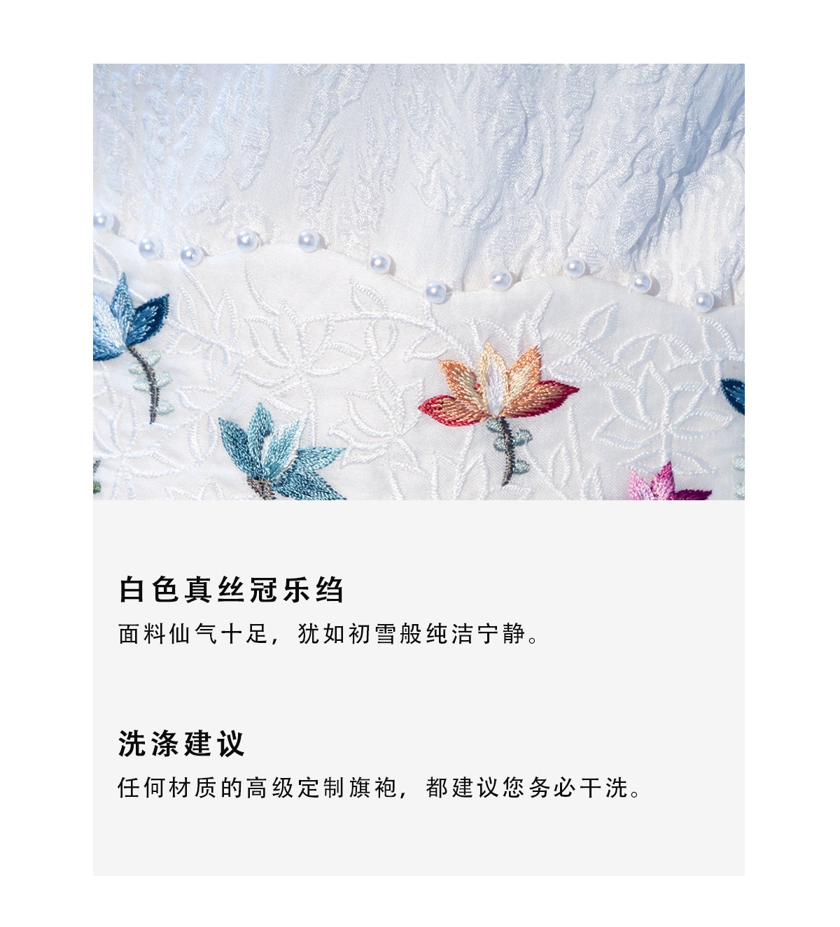 【明星同款】荷言HEYEN 凝眸似水 白色真丝冠乐绉礼服裙莲花手绣腰封