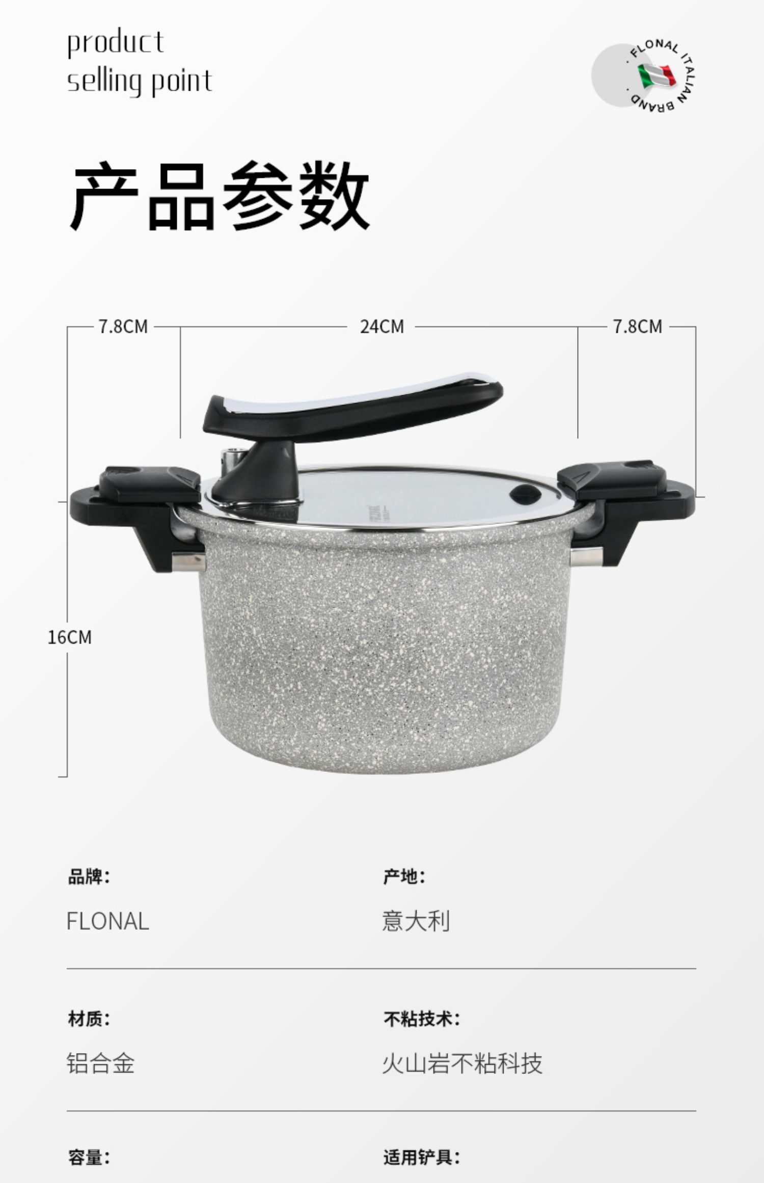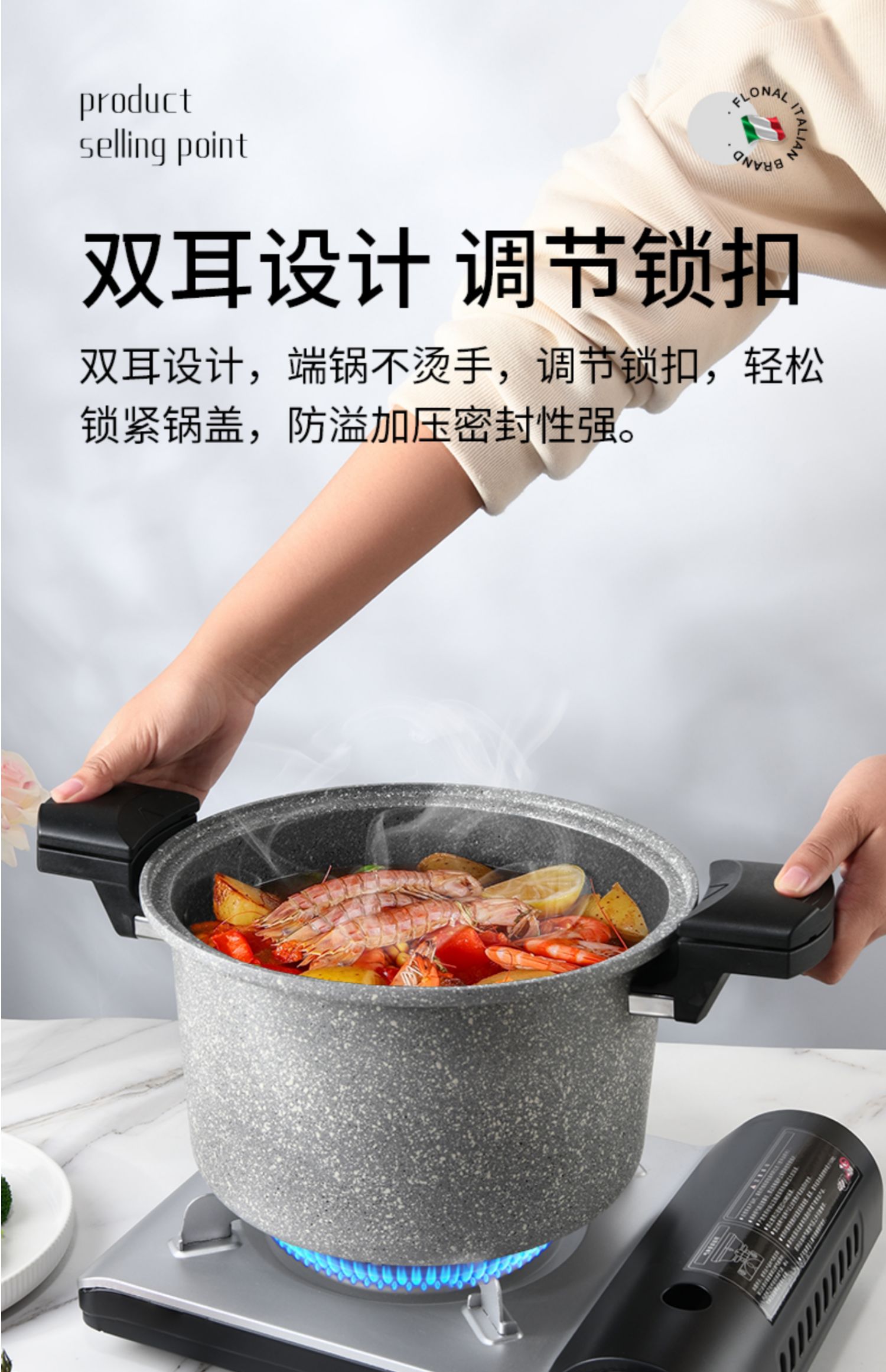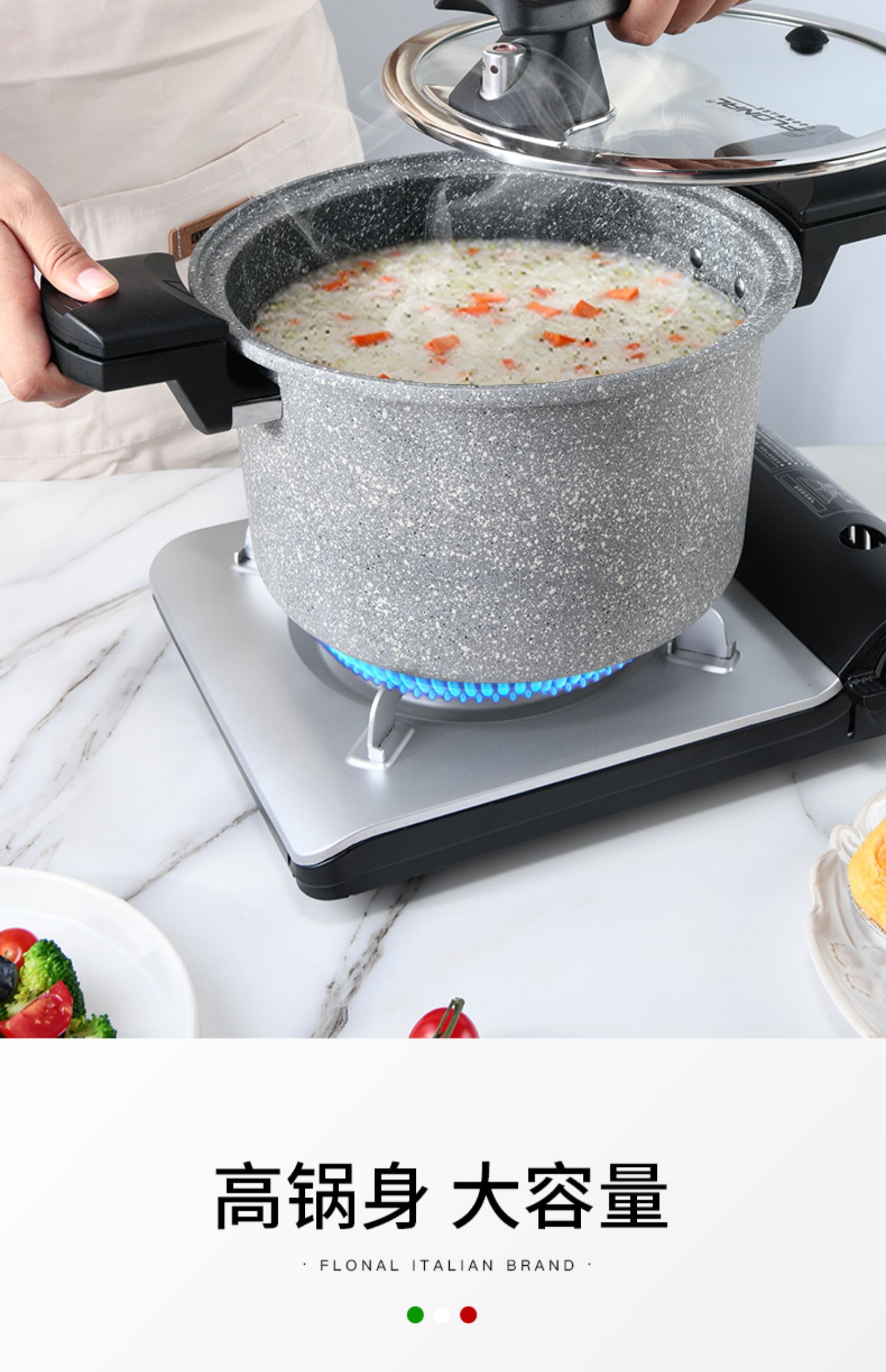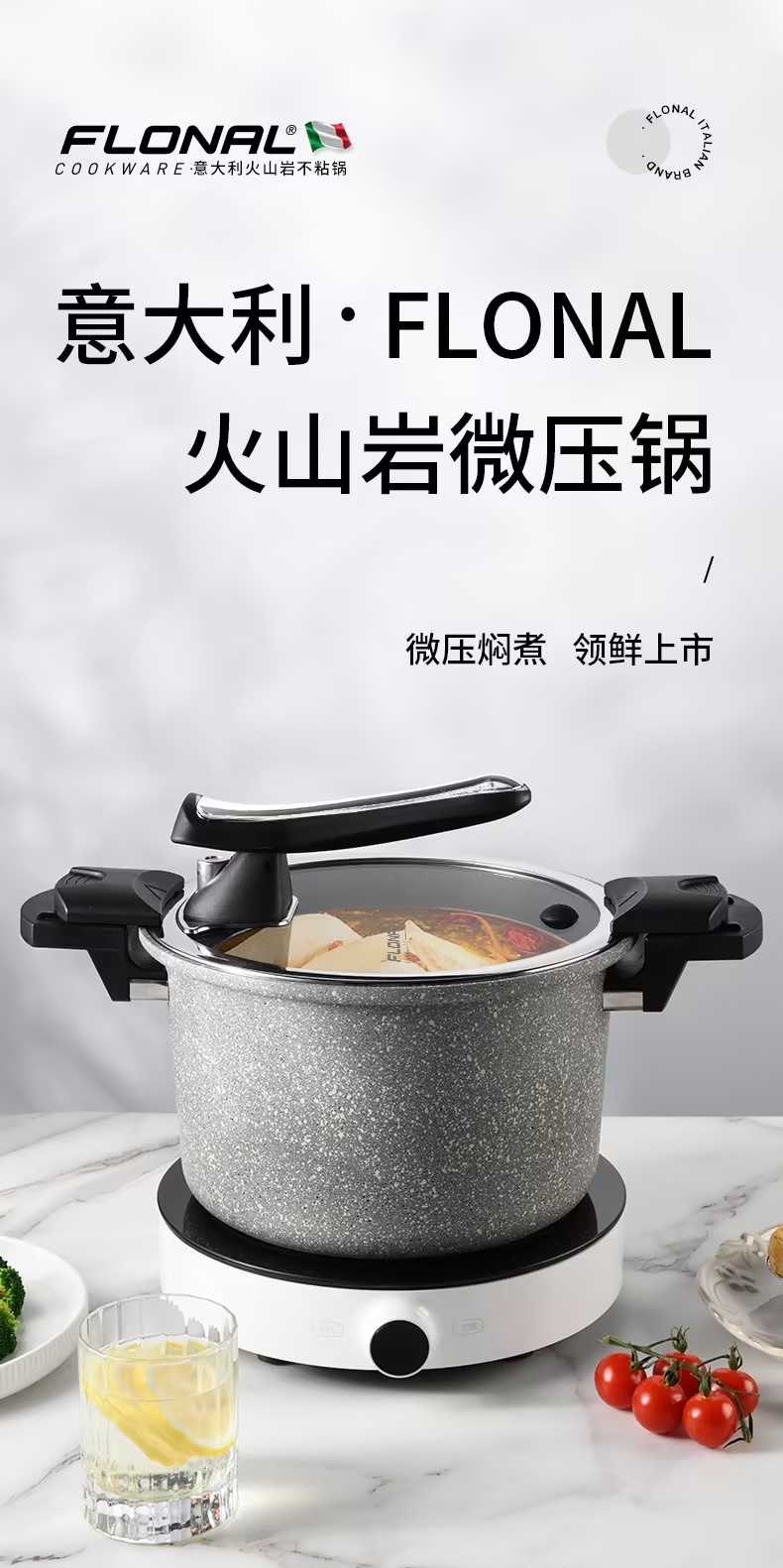 FLONAL意大利进口火山岩不粘锅微压锅家用煮汤锅炖锅电磁炉燃气灶压力锅6L