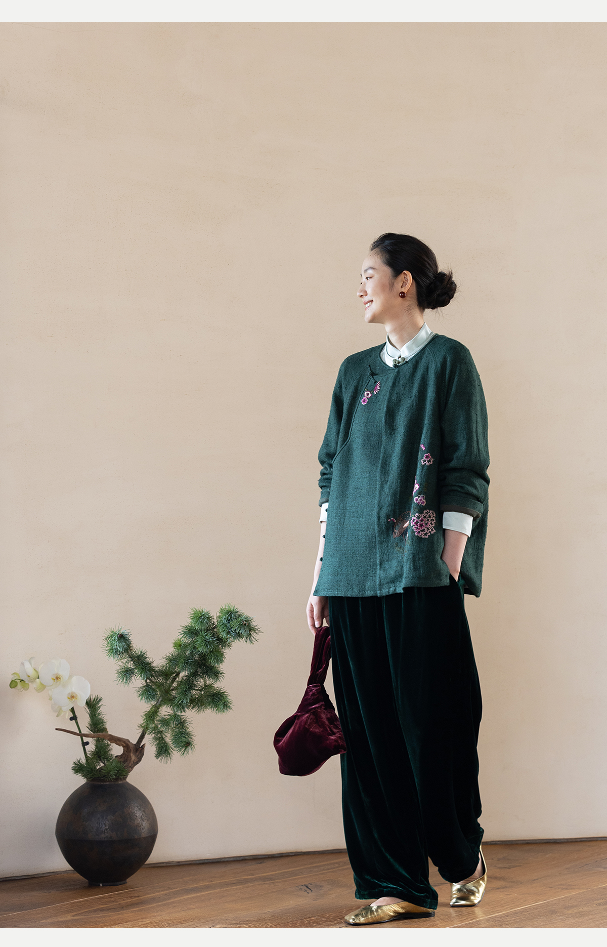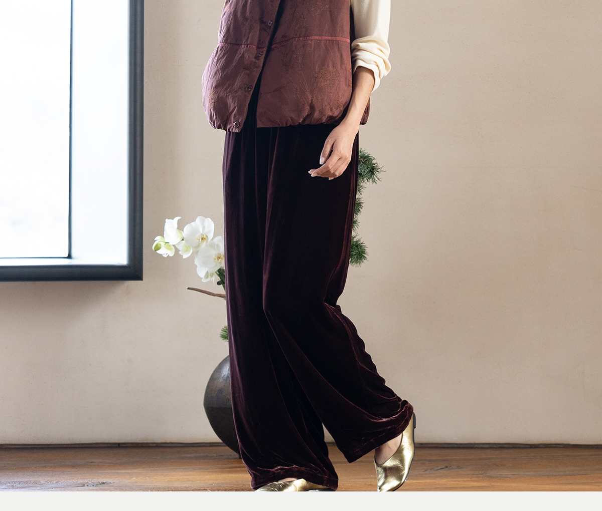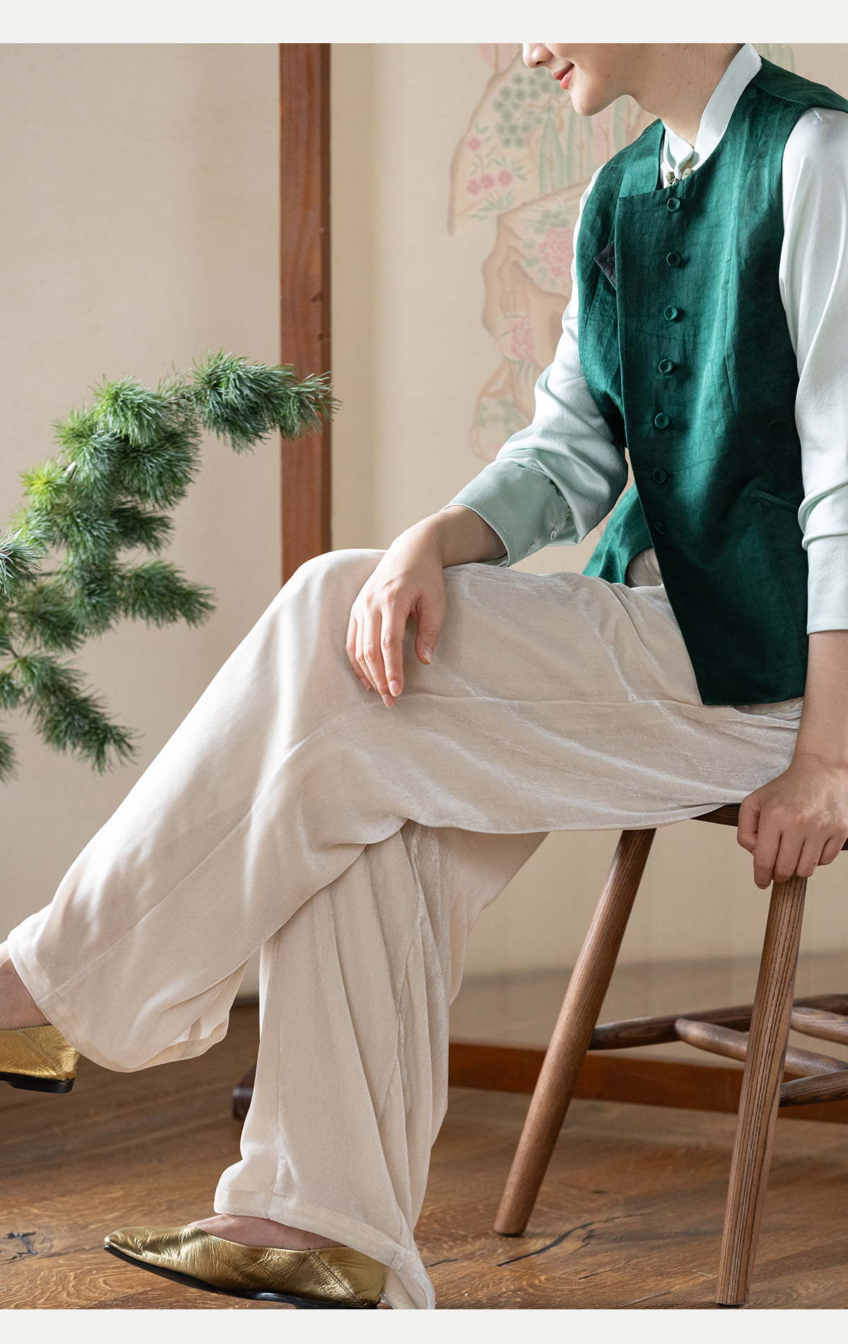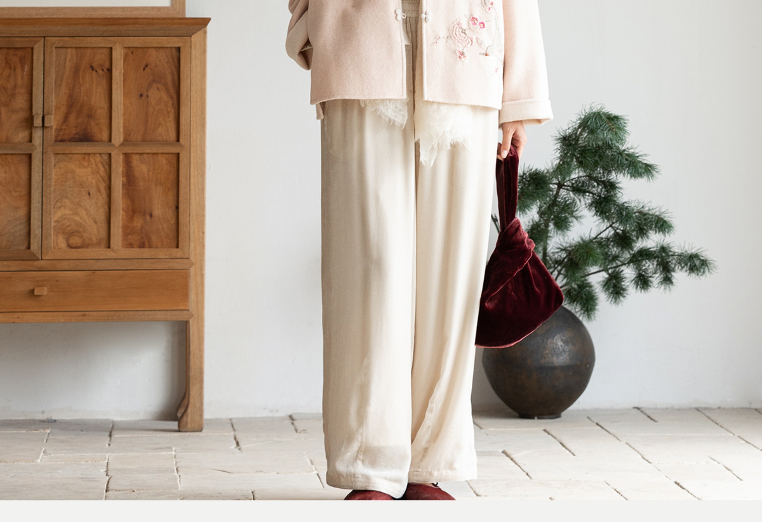 牧衣游原创 丝绒净色裤子女垂感显瘦禅意简约宽松百搭休闲裤 砚池