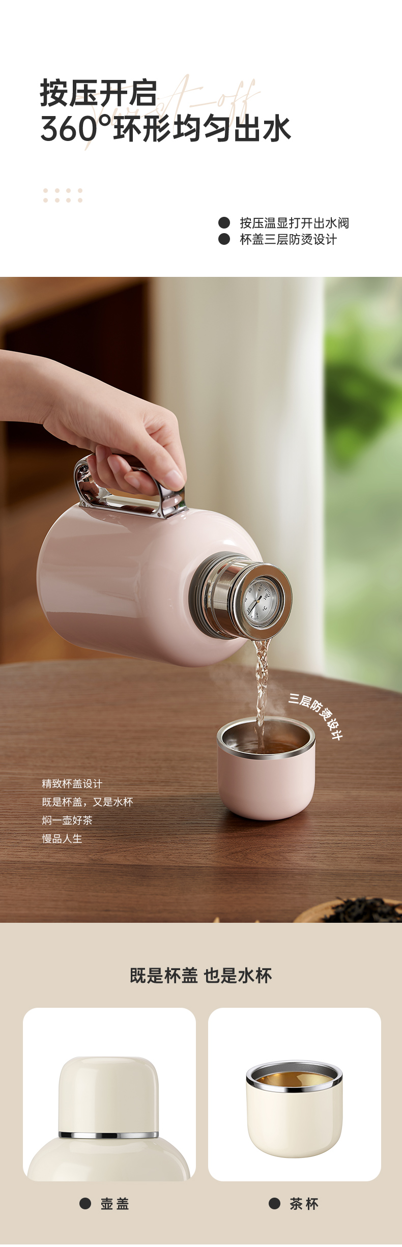 壶盖也是不锈钢材质,精致又好看!三层防烫设计,即是壶盖也是杯子