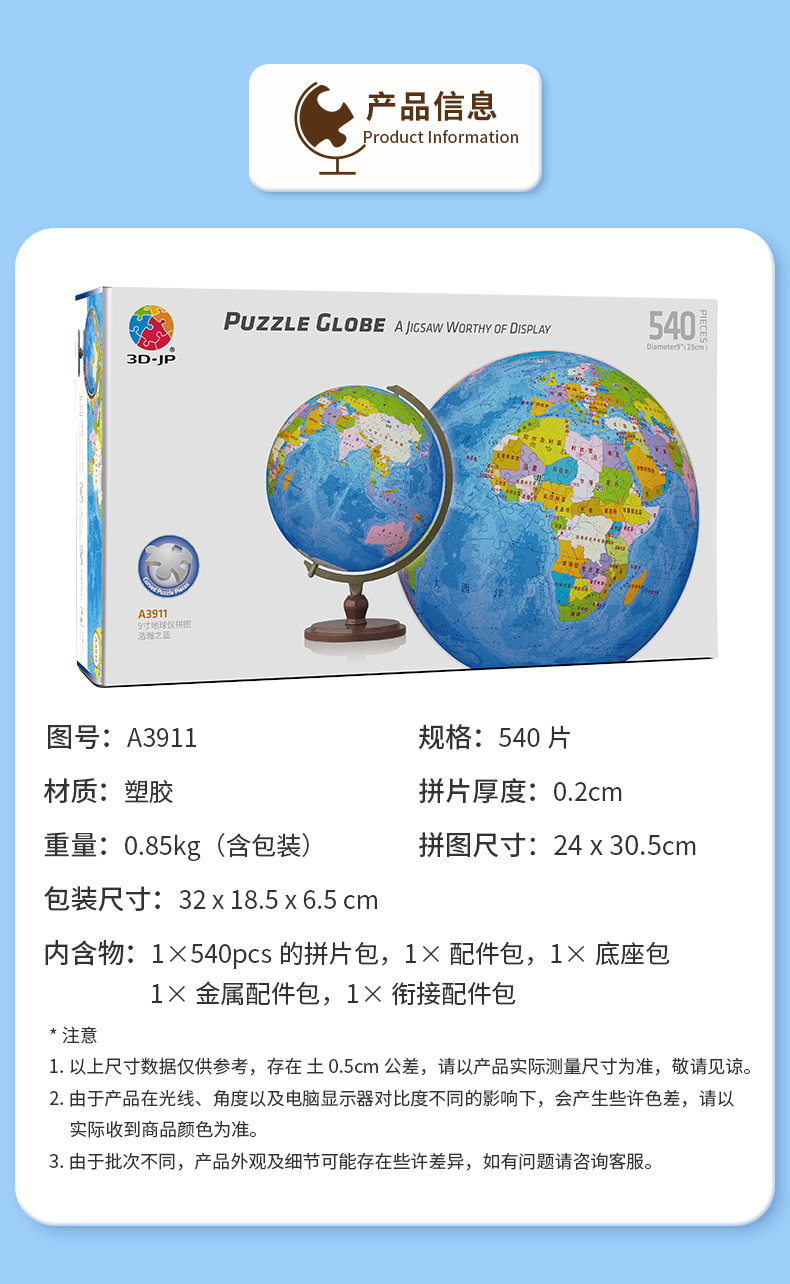 9寸540片 地球仪拼图 A3911 浩瀚之蓝