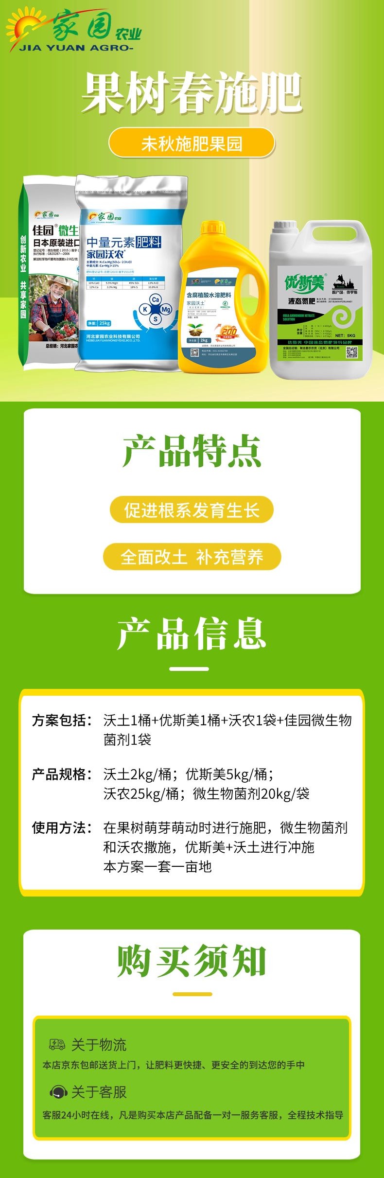 1、方案包含:沃土2公斤*1桶+优斯美5公斤*1桶+沃农25公斤*1袋+佳园微生物菌剂20公斤*1袋