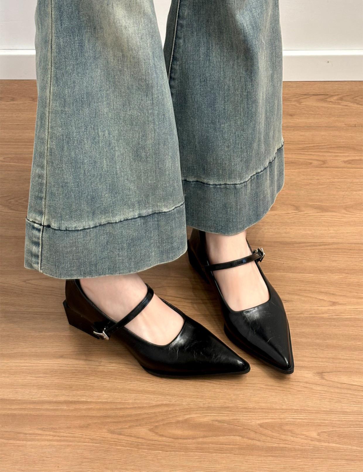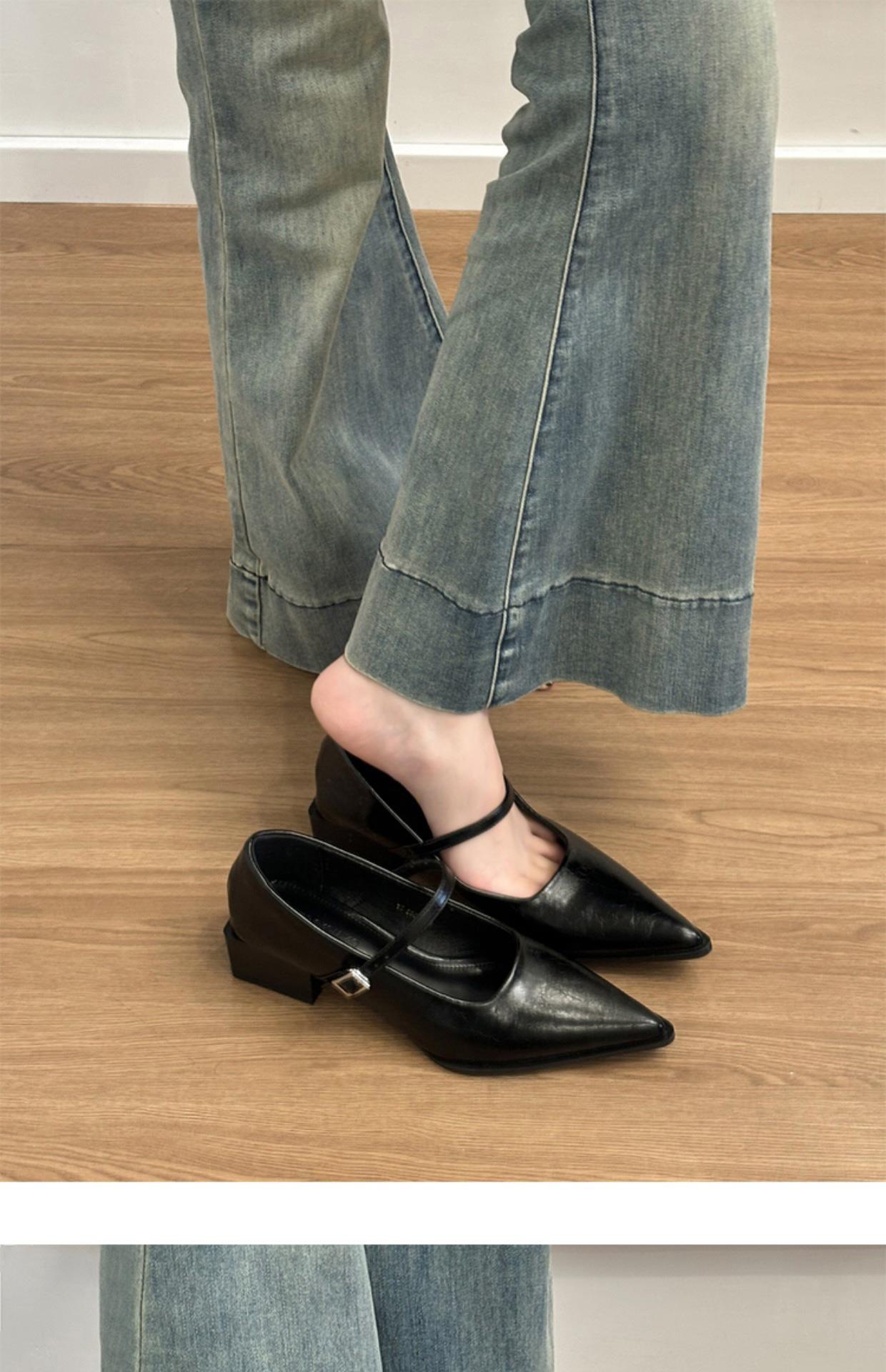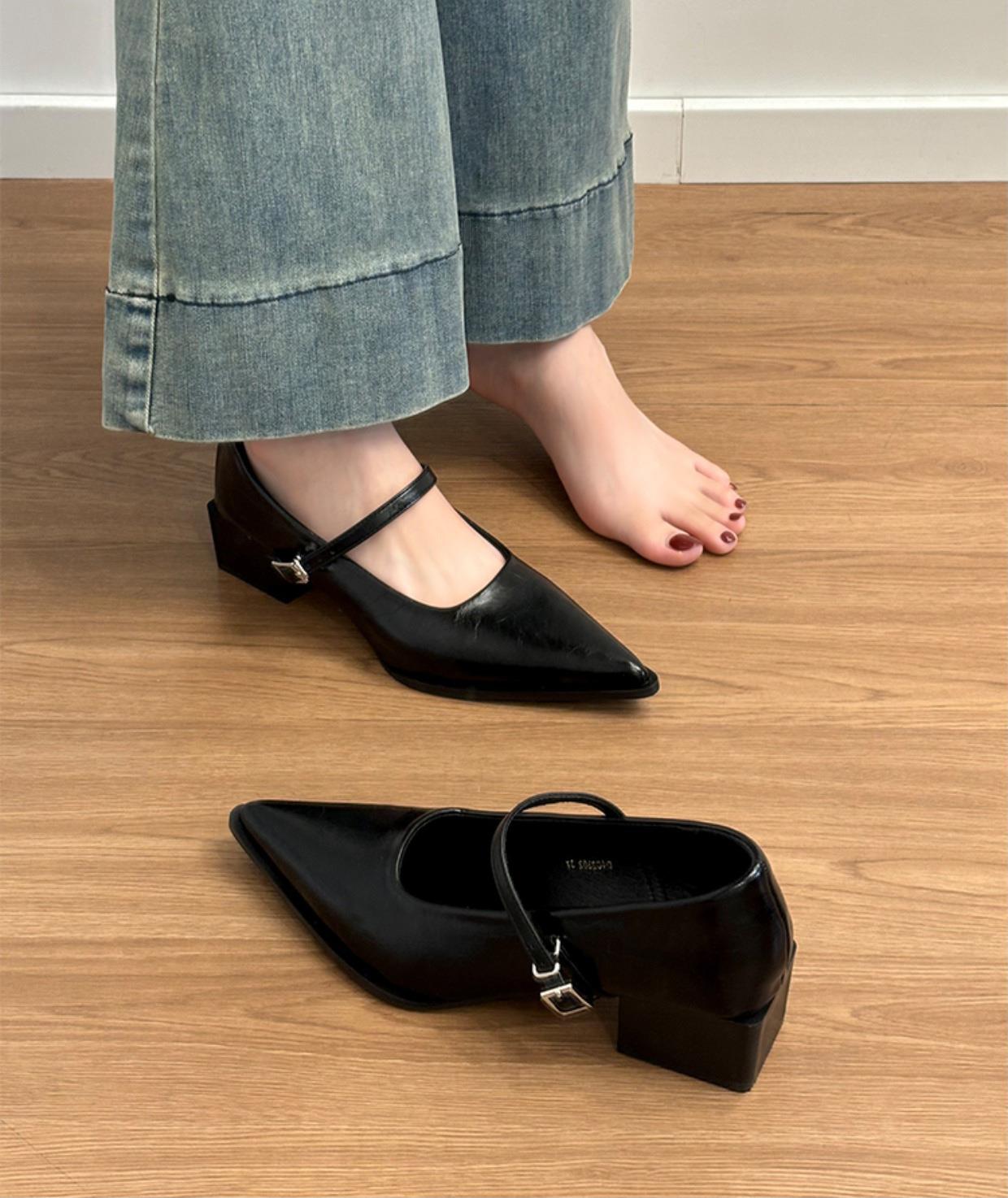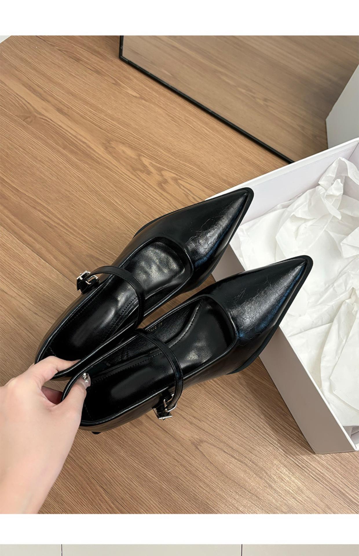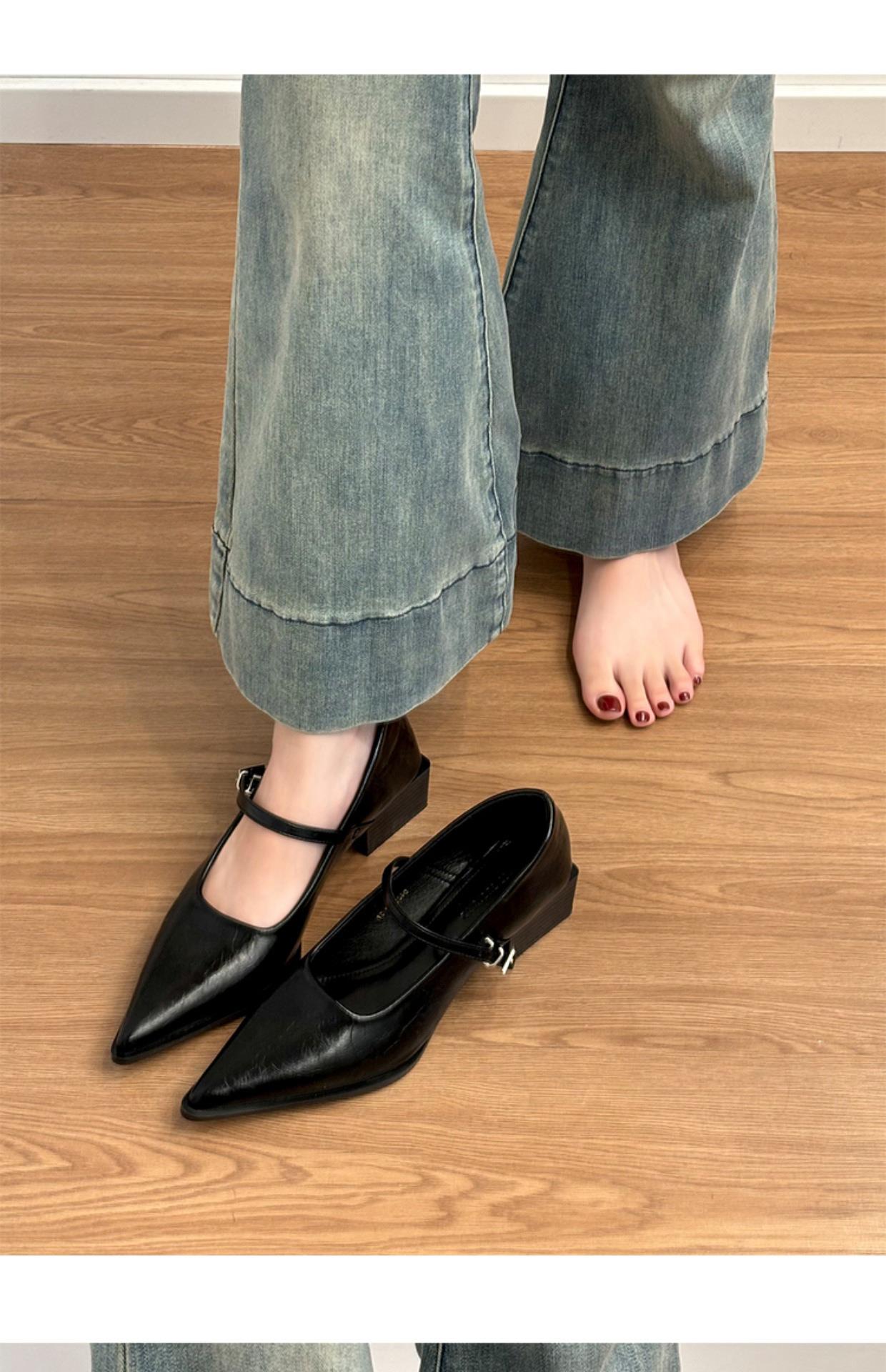 【羊皮版~气质尖头鞋】女2026新款春秋一字扣浅口玛丽珍小皮鞋