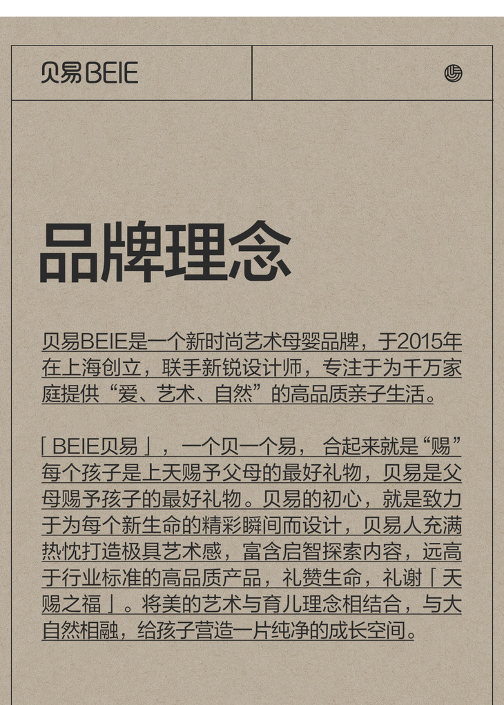 - 「BEIESTATE贝易」以极简设计为风格,主打兼顾设计、品 质和性价比的母婴产品,以创造极致细腻、不张扬、 不世俗的当代母婴用具,为用户日常亲子生活与幼儿 的启蒙早教提供新选择。