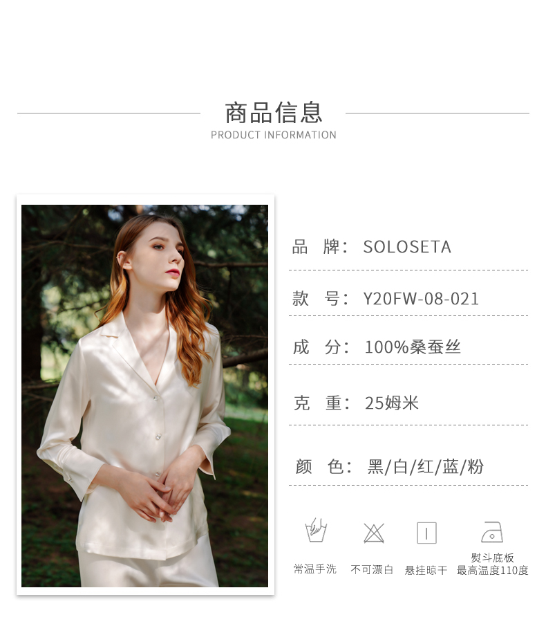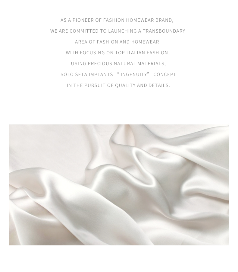 - soloseta专注于真丝织物,灵感源自意大利语,中文含义为“只做真丝”的意思。让睡衣变时尚,居家和外出瞬间切换,使其更具有出街,度假,参加宴会等功能。