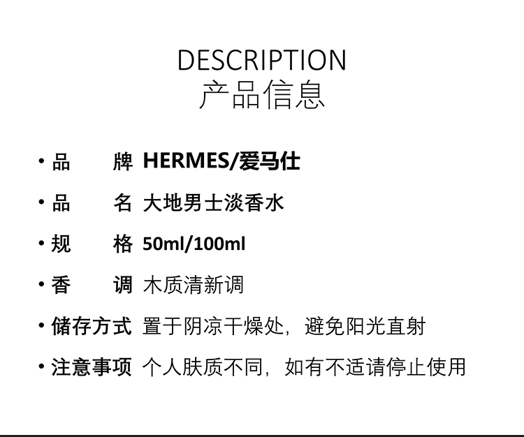 【保税仓】Hermes/爱马仕大地男士木质淡香氛EDT50ml/瓶
