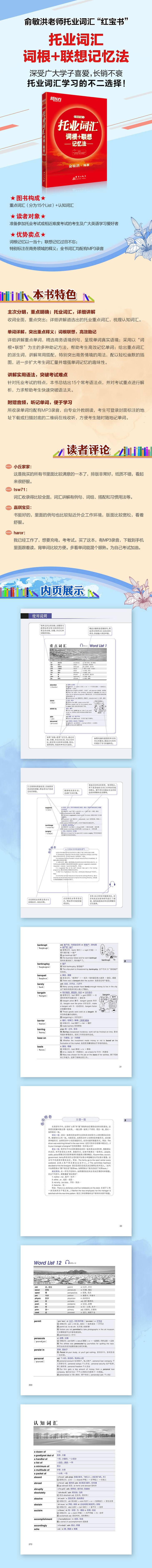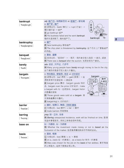 单词学习需要反复记忆, 但机械的重复记忆容易让考生产生逆反心理。为了提高考生的记忆效率, 本书延续了“红宝书”系列的“词根+联想”记忆法, 并将其优化, 使其更有效地辅助考生记忆单词。词根、 词缀好比英语词汇的根基, 掌握了它们, 就能够从源头梳理、 记忆单词, 并对陌生单词的词义作出合理推测。考生通过对词根、 词缀的学习, 能够“记一而知十”地记背单词; 而联想、 发音记忆通过单词拆分、 同义词或形近词比对、 谐音等方法帮助考生由易及难地学习; 书中还配有大量涉及商务内容的插图, 生动幽默的漫画不仅可以帮助考生zui直观地记忆单词, 而且可以帮助考生调节学习节奏, 减轻复习压力。