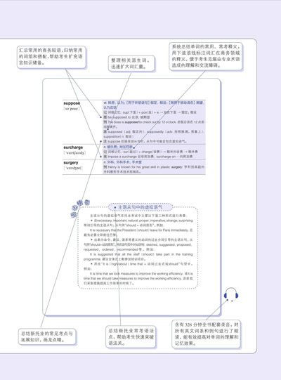 强调实用性是新托业考试的特点之一, 无论何种题型, 其内容都源于真实的商务交流。针对这一点, 本书在收录单词常见词义的基础上, 增加了在商务情境中常用的释义, 并用下波浪线着重标记, 帮助考生全面掌握单词释义。另外, 在多数词条下都列举了相关的商务短语和实用搭配, 可以帮助考生积累丰富的表达方式, 为连词成句做好准备。而记忆主词条衍生的派生词, 则可以横向扩大考生的词汇量。