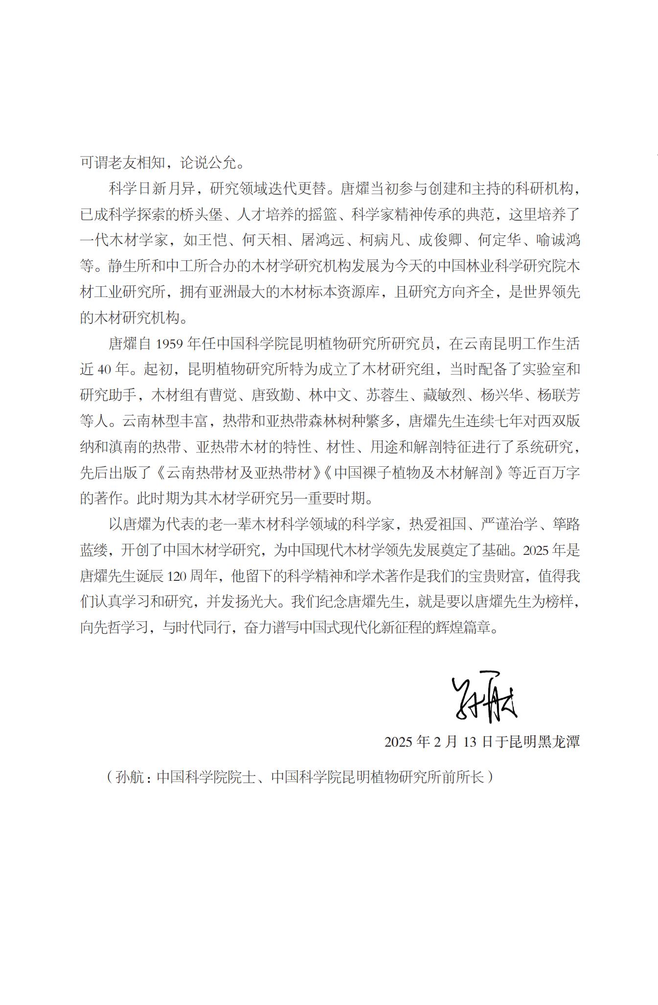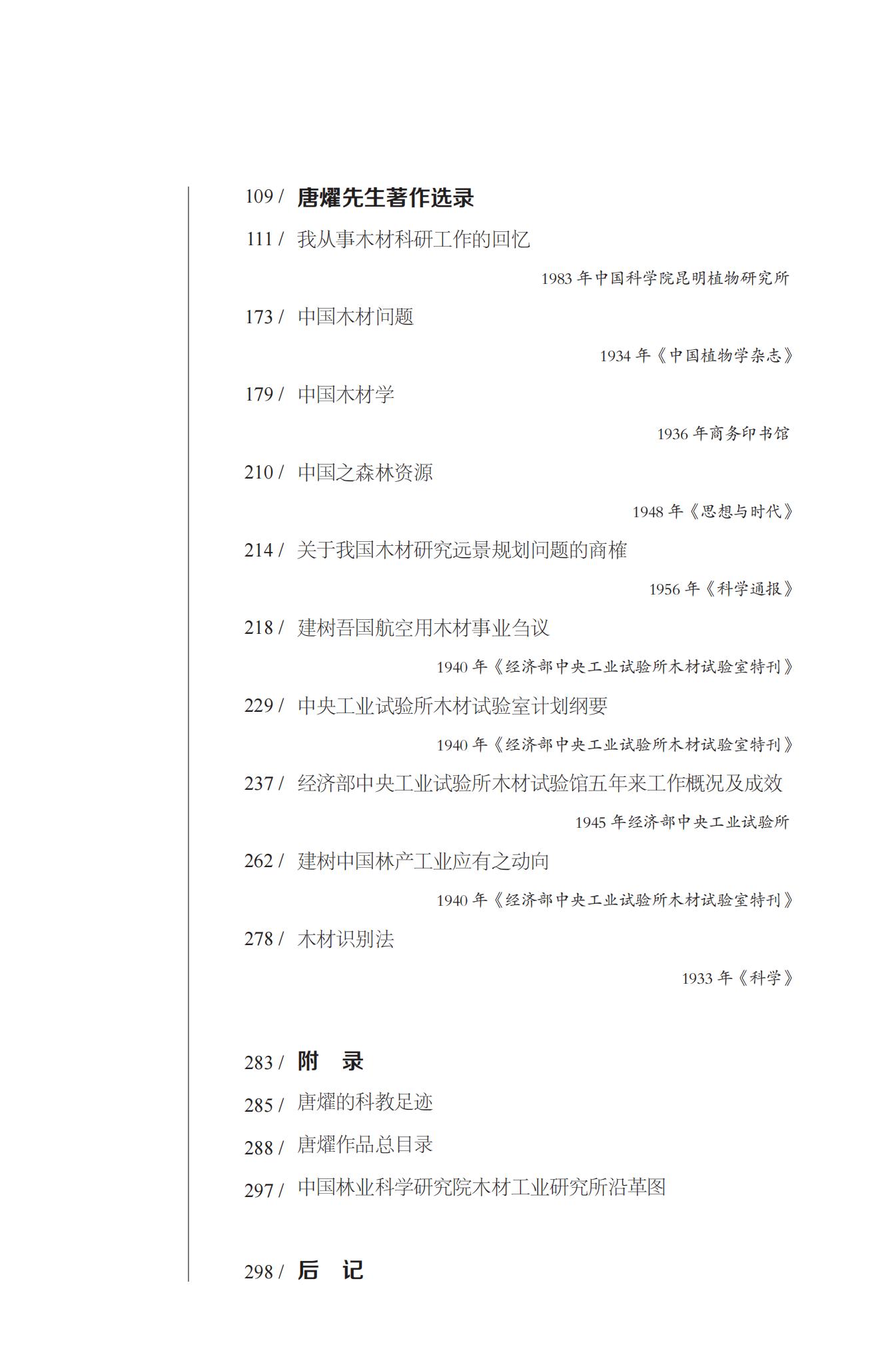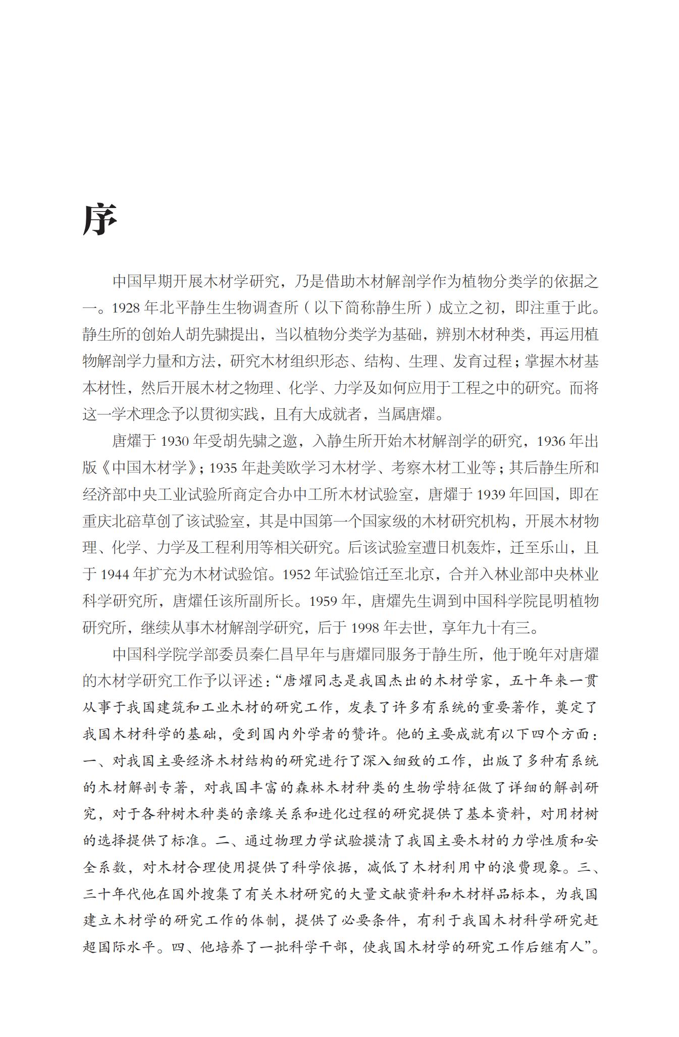 以唐燿为代表的老一辈木材科学领域的科学家,热爱祖国、严谨治学、筚路蓝缕,开创了中国木材学研究,为中国现代木材学领先发展奠定了基础。2025 年是唐燿先生诞辰 120 周年,他留下的科学精神和学术著作是我们的宝贵财富,值得我们认真学习和研究,并发扬光大。我们纪念唐燿先生,就是要以唐燿先生为榜样,向先哲学习,与时代同行,奋力谱写中国式现代化新征程的辉煌篇章。